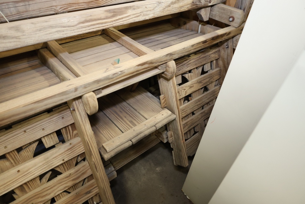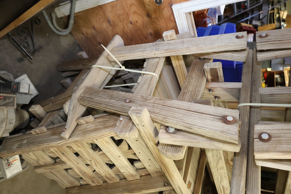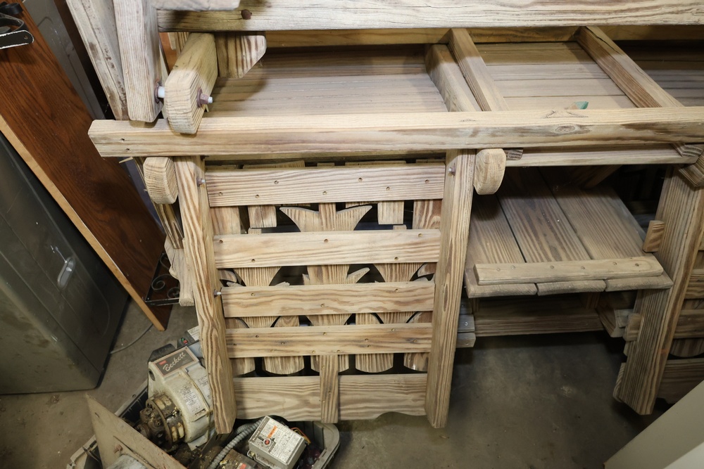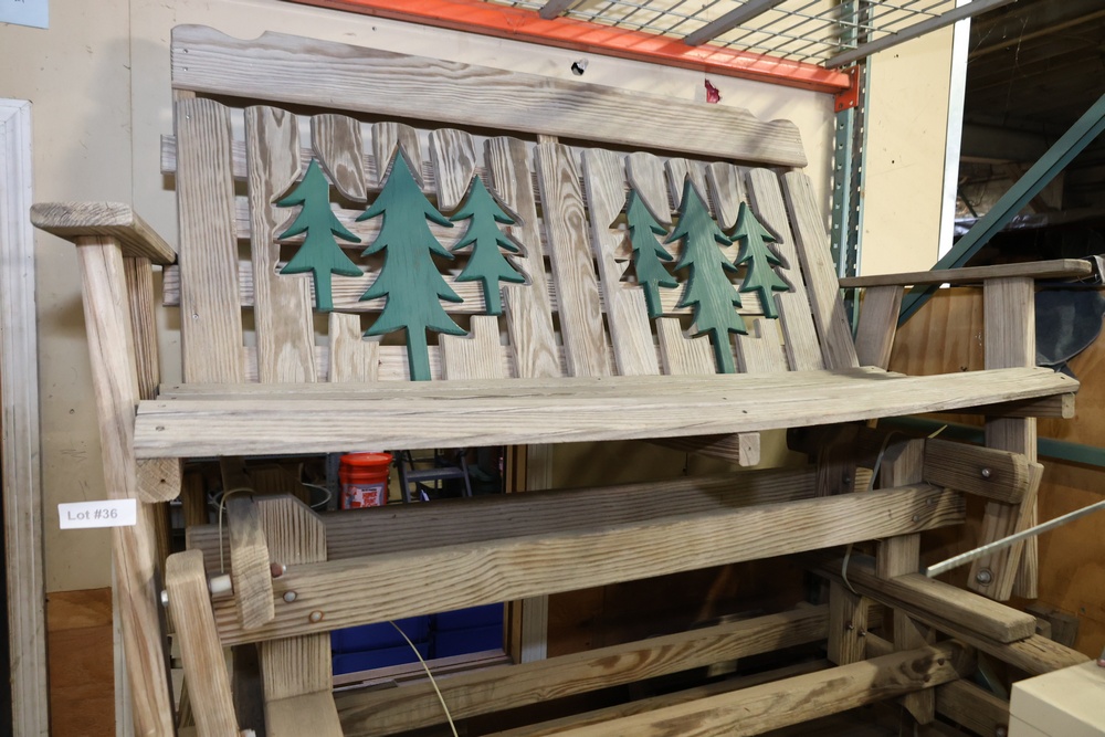 4 Wooden Adirondack Rocking Benches with Tree Design. Each bench features a slatted wooden design with green tree cutout accents on the backrest. Made of durable wood construction and ideal for outdoor seating. Pickup only.