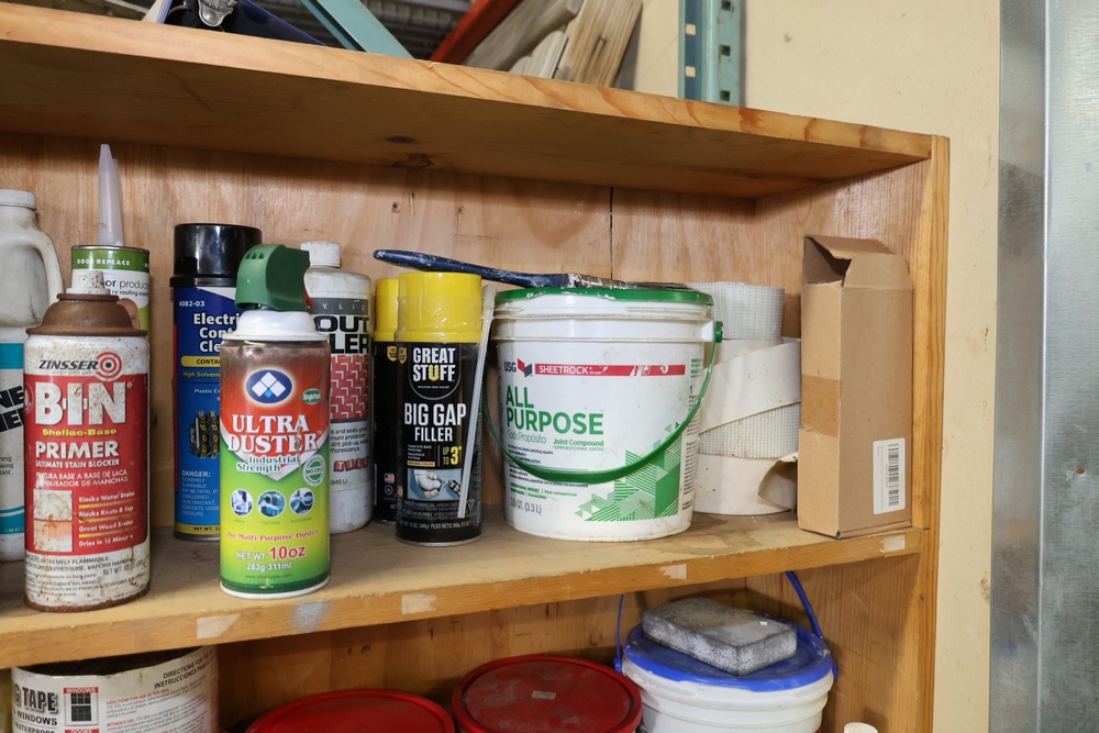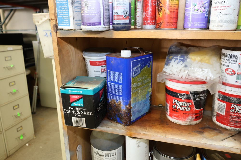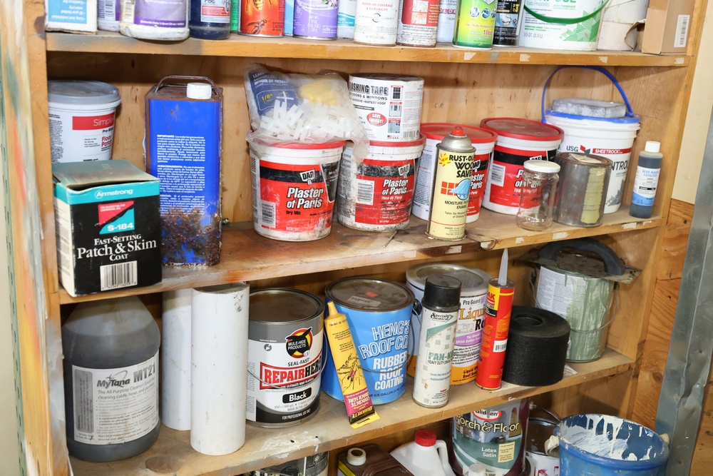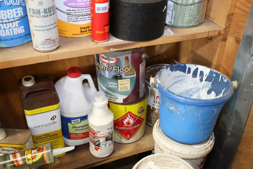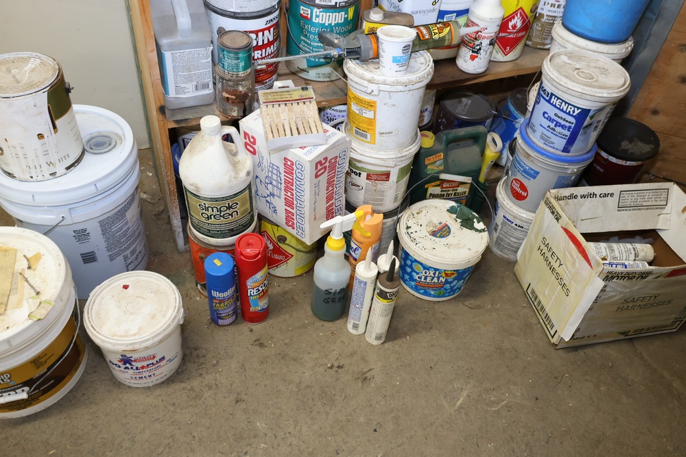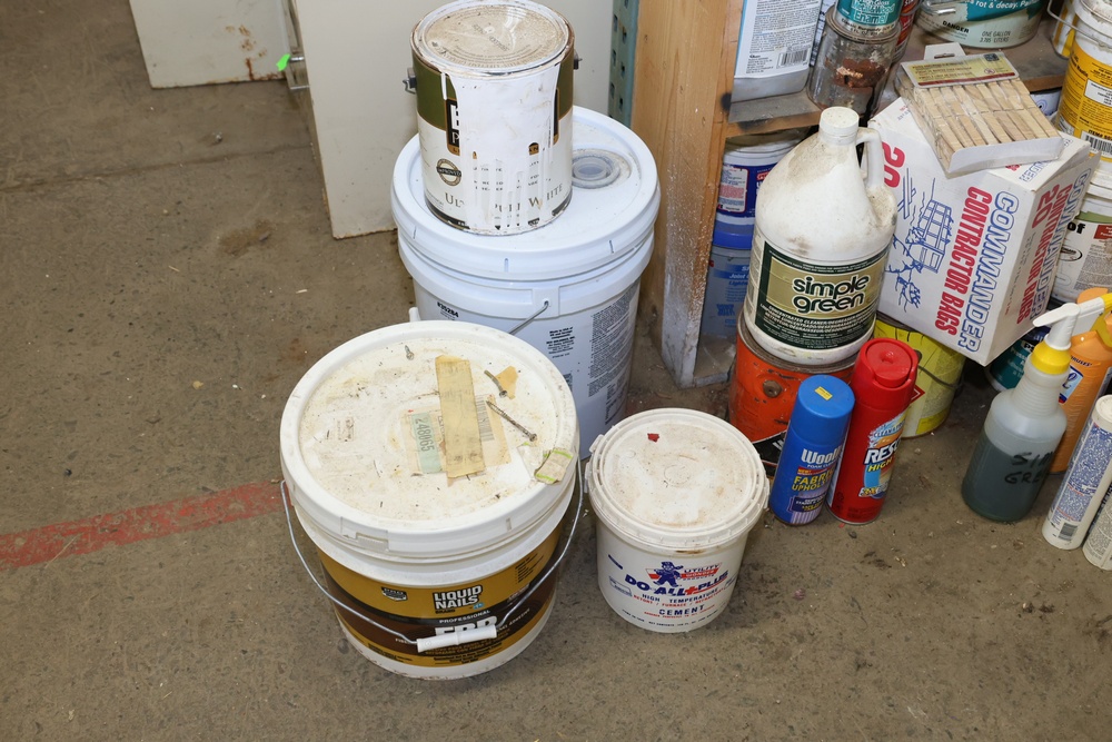 Partially Used Paints, Chemicals, and Supplies Excluding Shelving Unit. Includes a range of pails, cans, bottles, and containers of various paints, sprays, and chemicals. Most items are partially used. Excluded shelving unit. Pickup only.