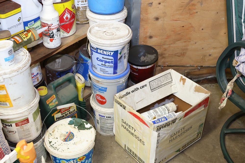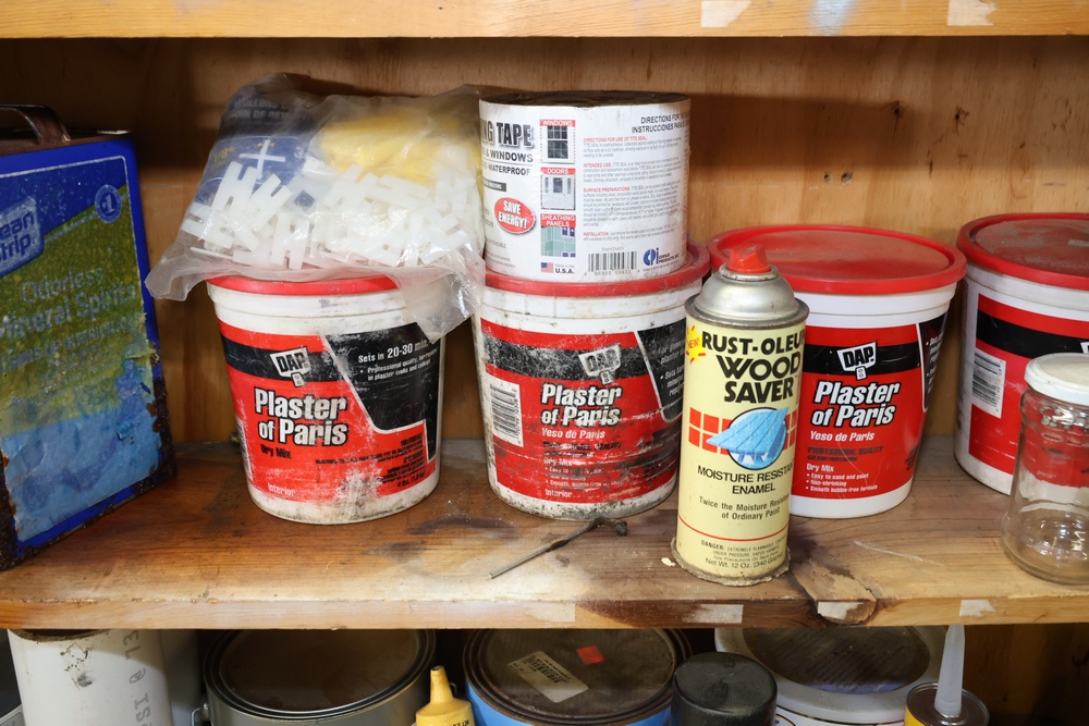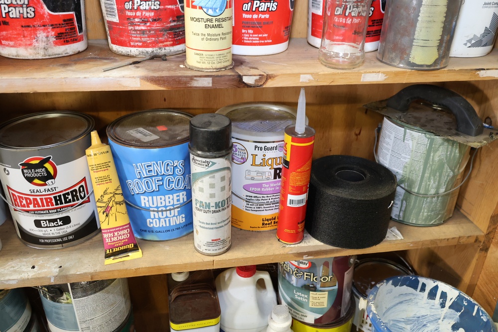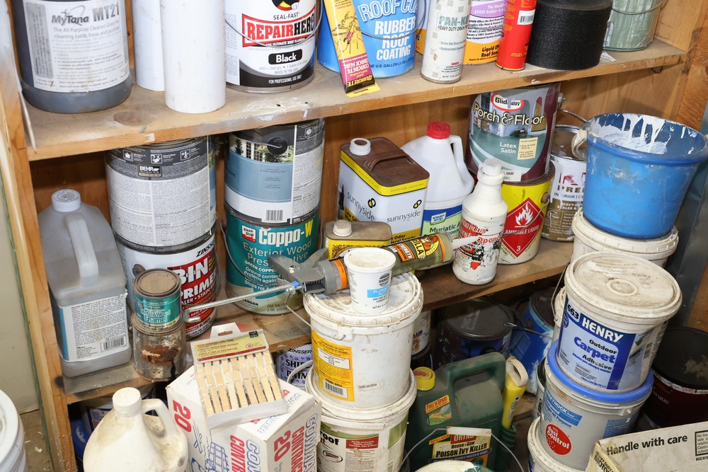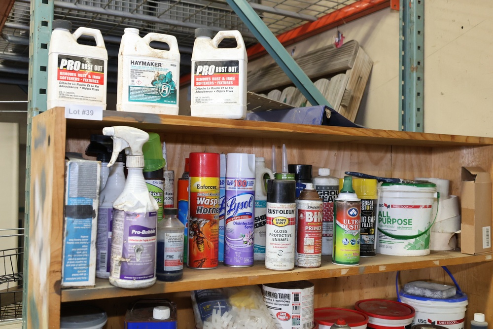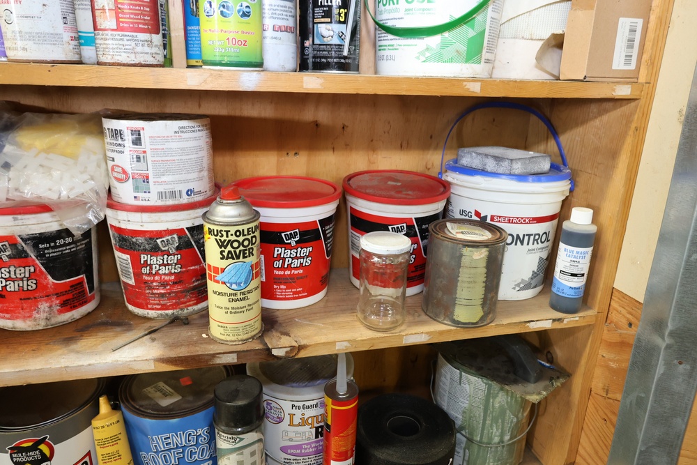 Partially Used Paints, Chemicals, and Supplies Excluding Shelving Unit. Includes a range of pails, cans, bottles, and containers of various paints, sprays, and chemicals. Most items are partially used. Excluded shelving unit. Pickup only.