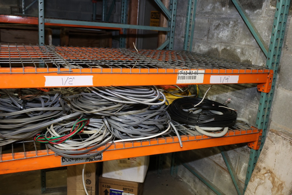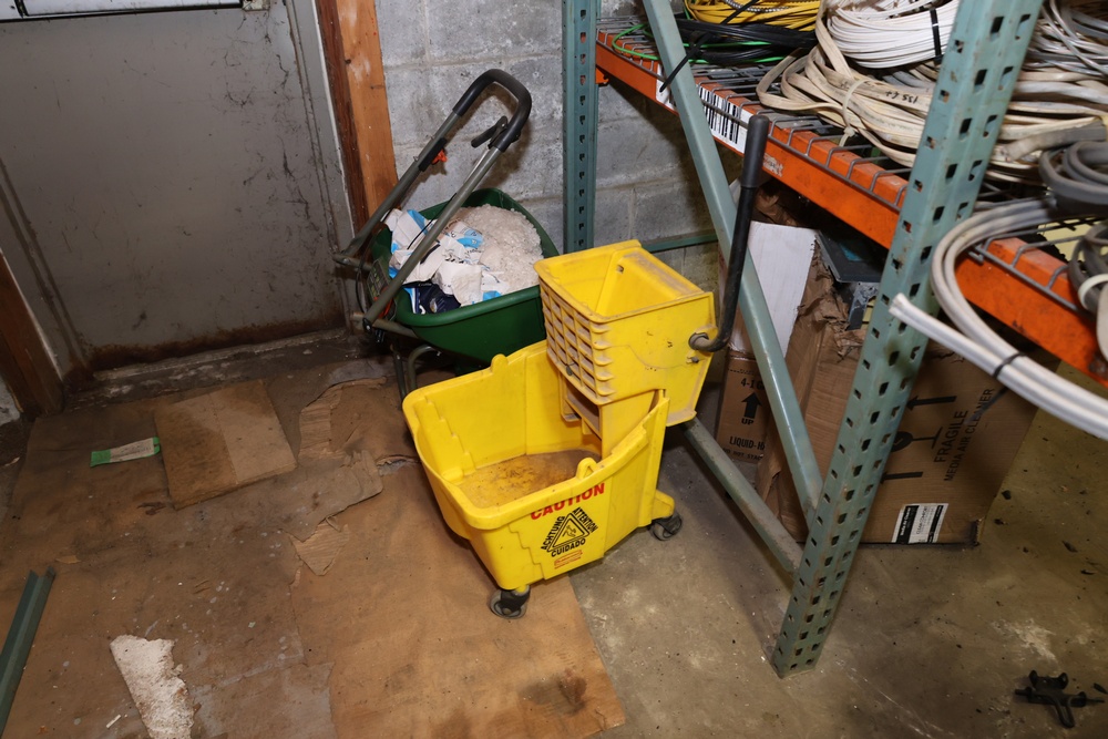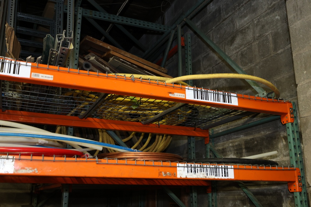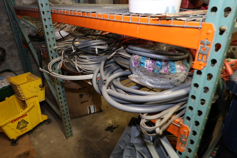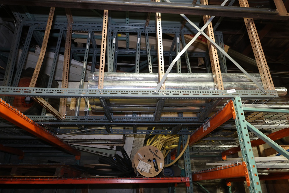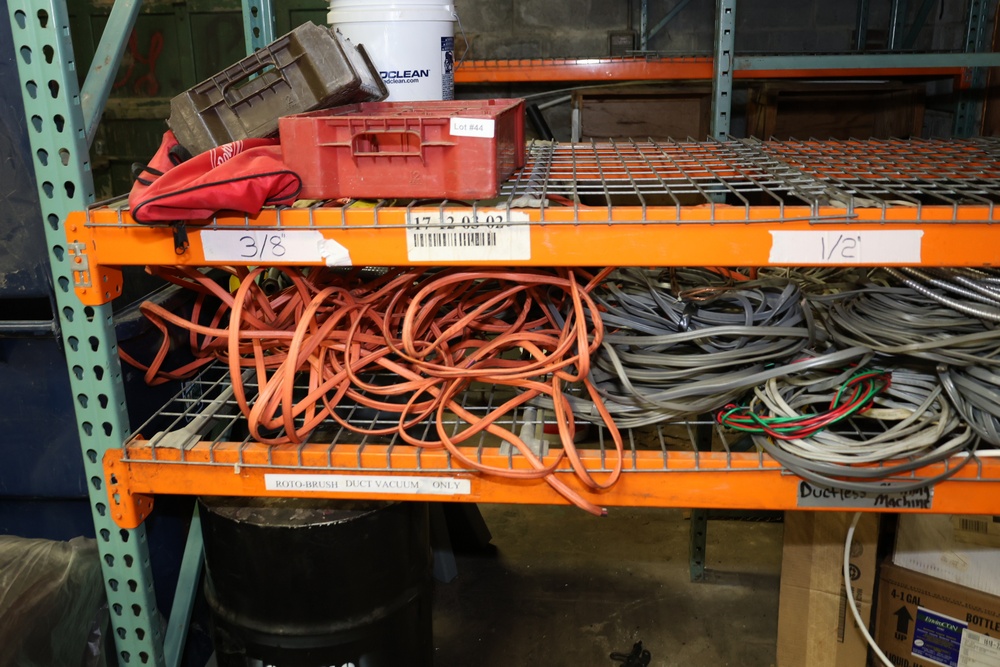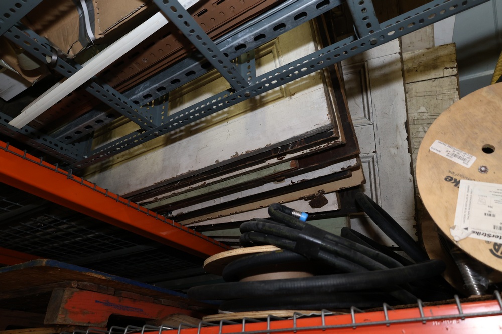 Contents of pallet racks including waste bin, electrical cables, antique doors, spreader, mop bucket, etc. Excludes pallet racks and other lots. Buyer must take all.