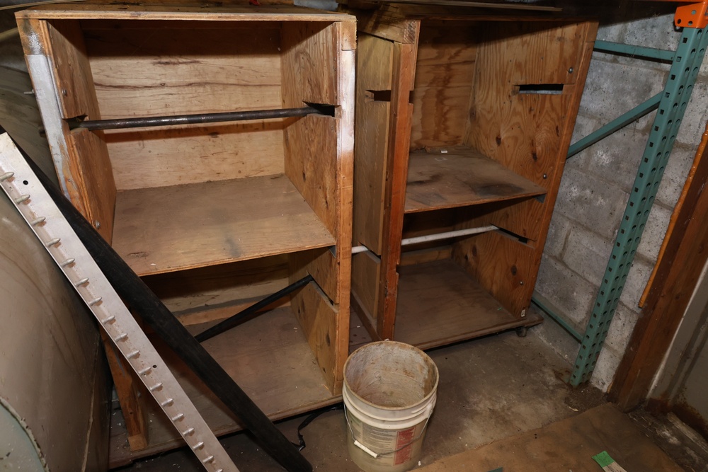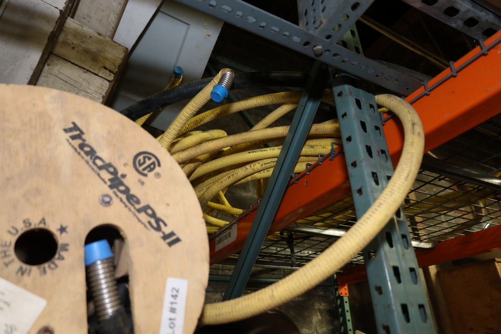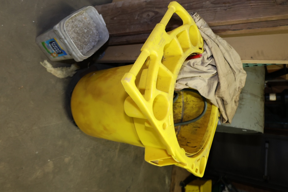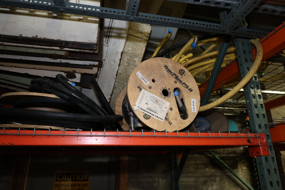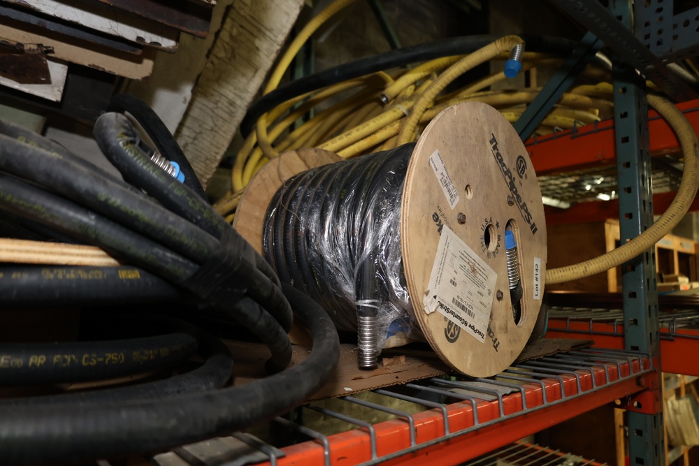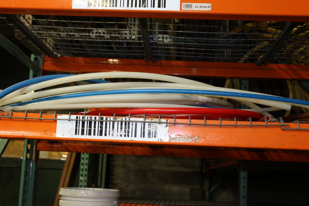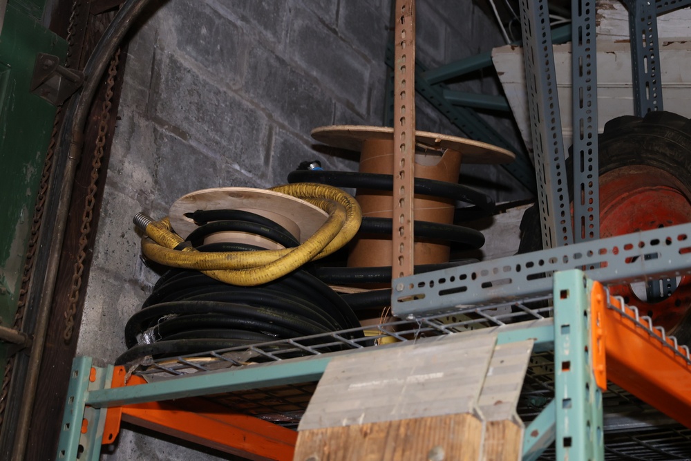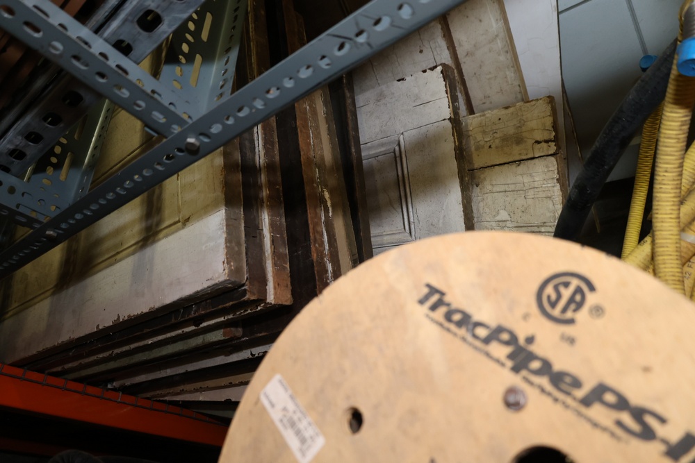 Contents of pallet racks including waste bin, electrical cables, antique doors, spreader, mop bucket, etc. Excludes pallet racks and other lots. Buyer must take all.