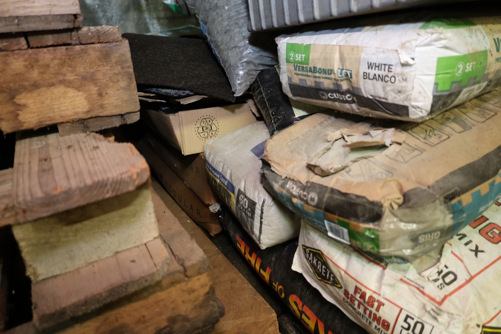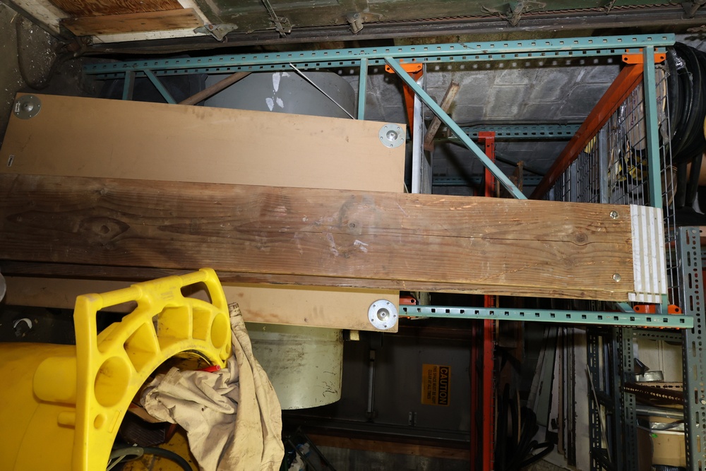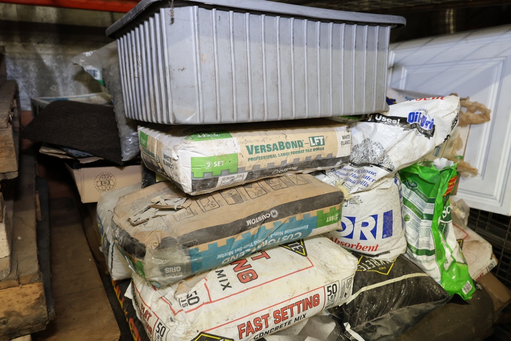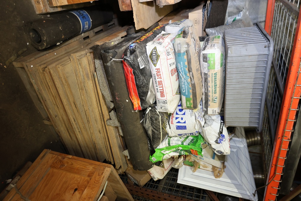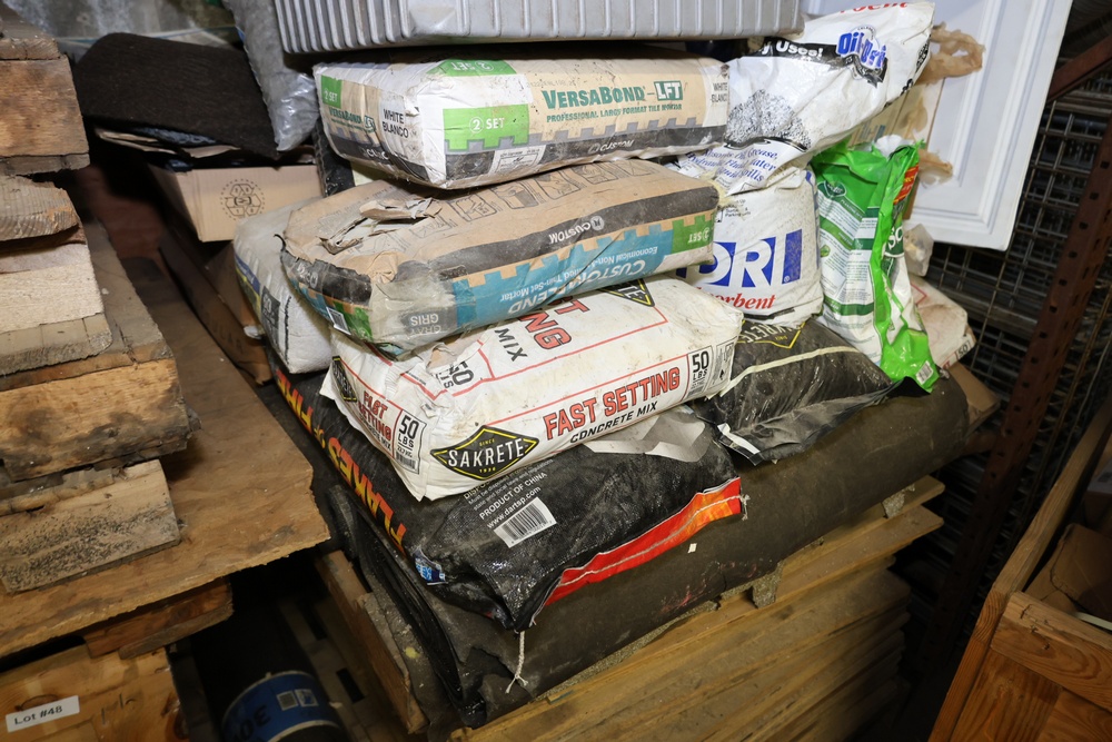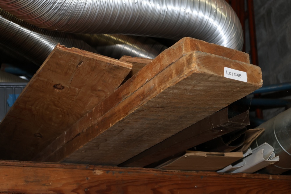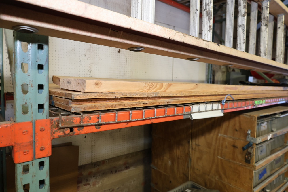 Various construction material including lumber, plywood, concrete, etc. Also includes wood shelves. Buyer must take all.