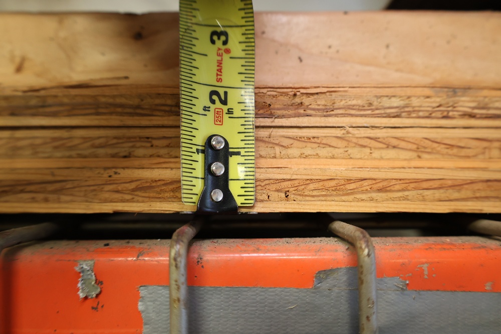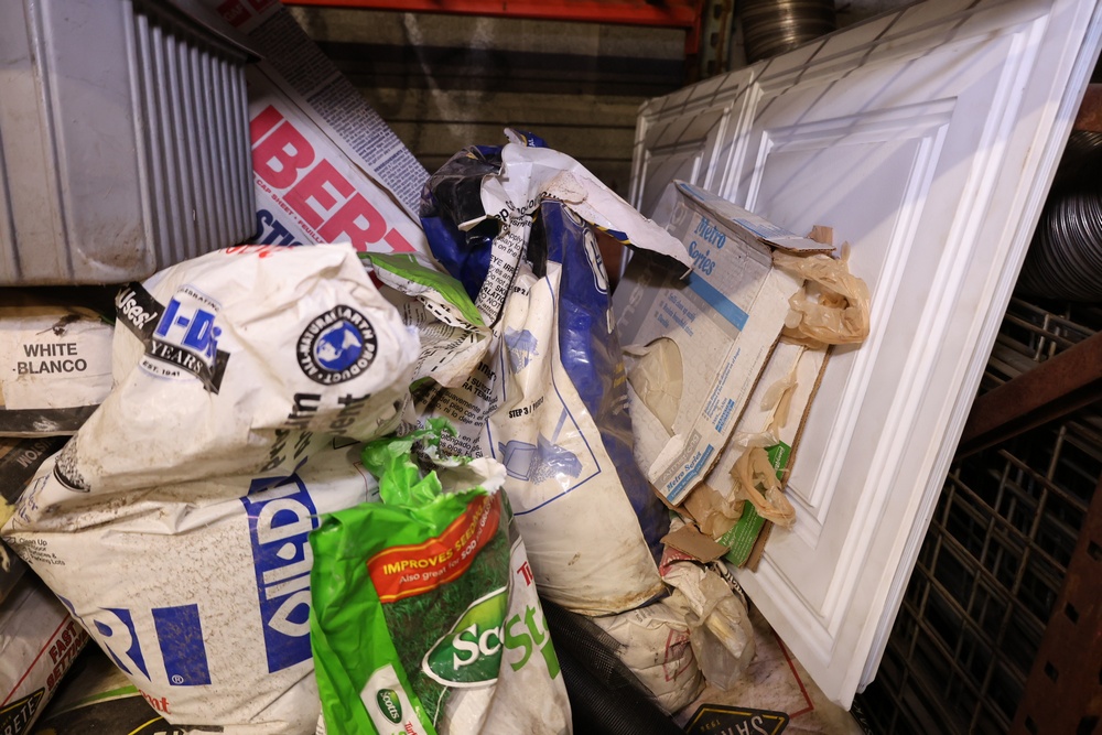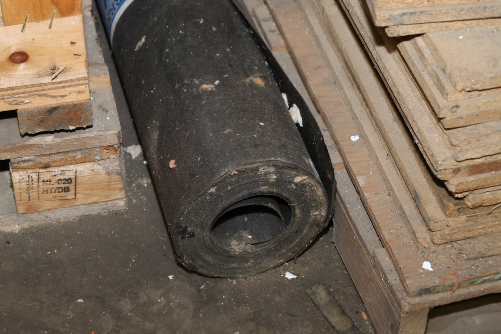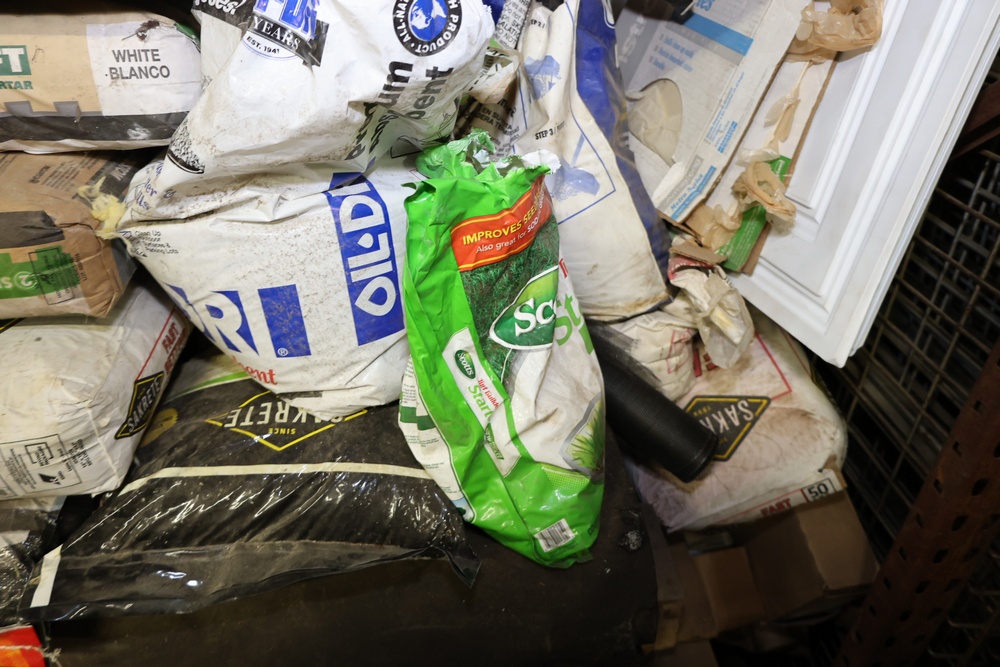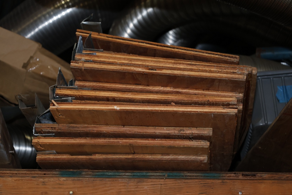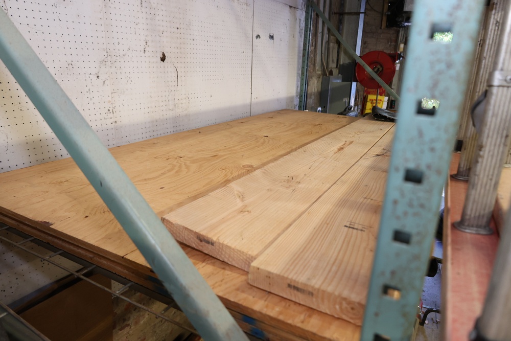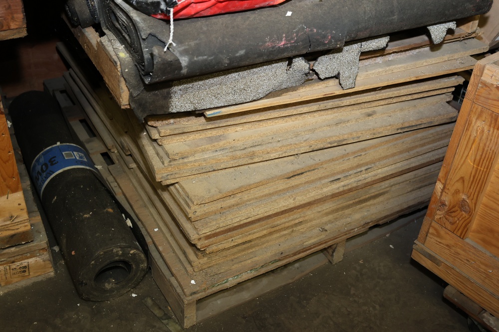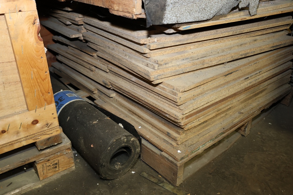 Various construction material including lumber, plywood, concrete, etc. Also includes wood shelves. Buyer must take all.