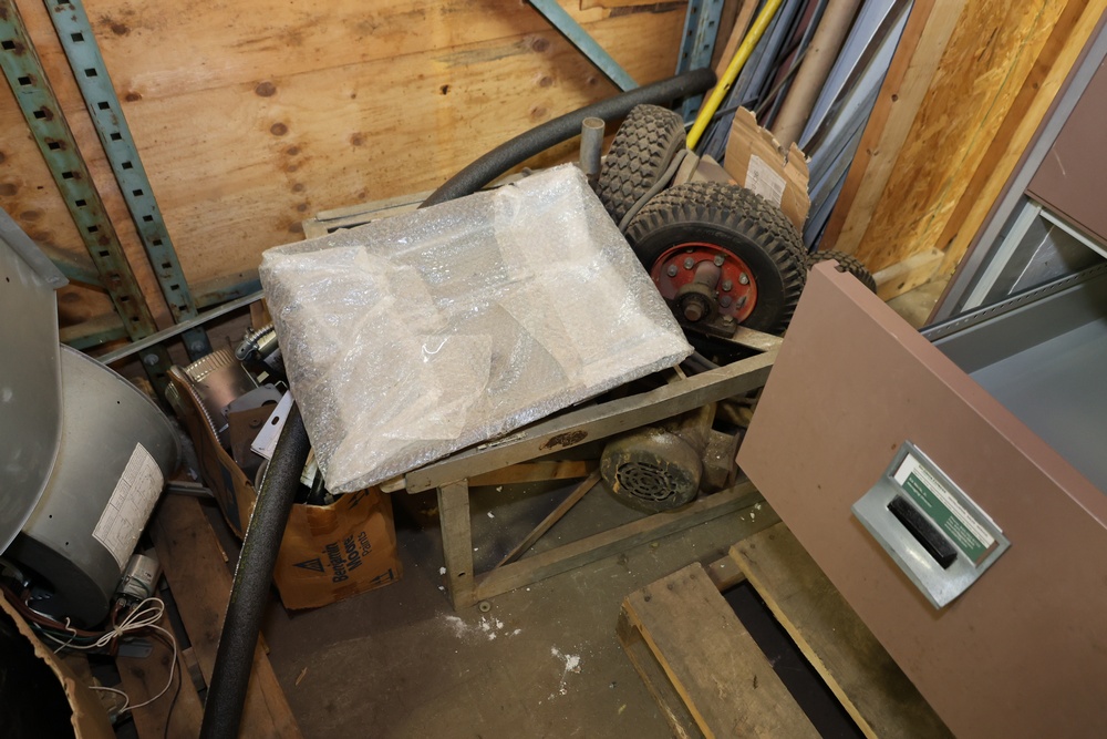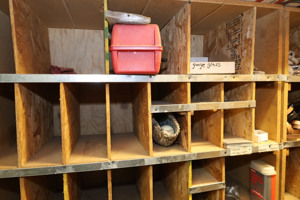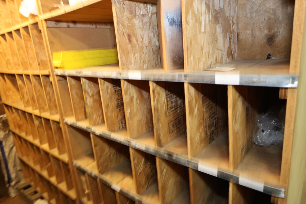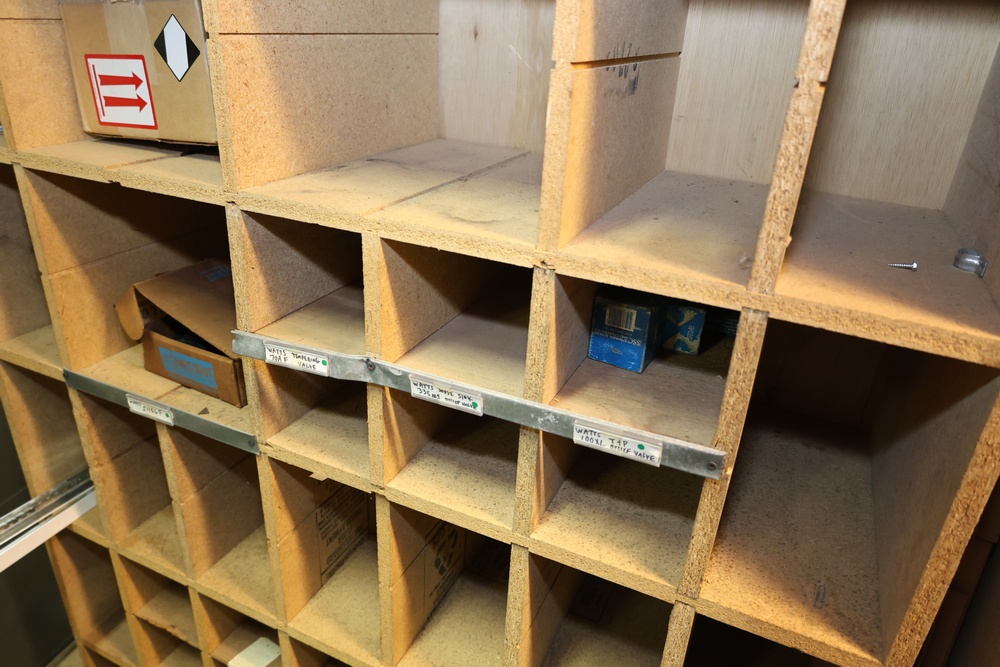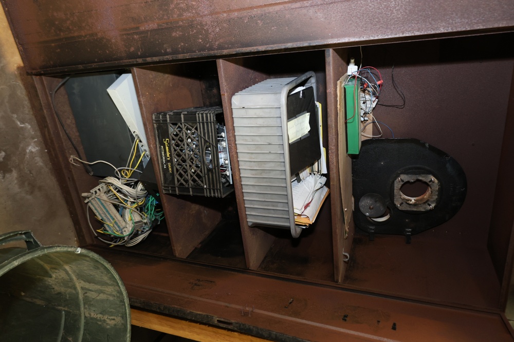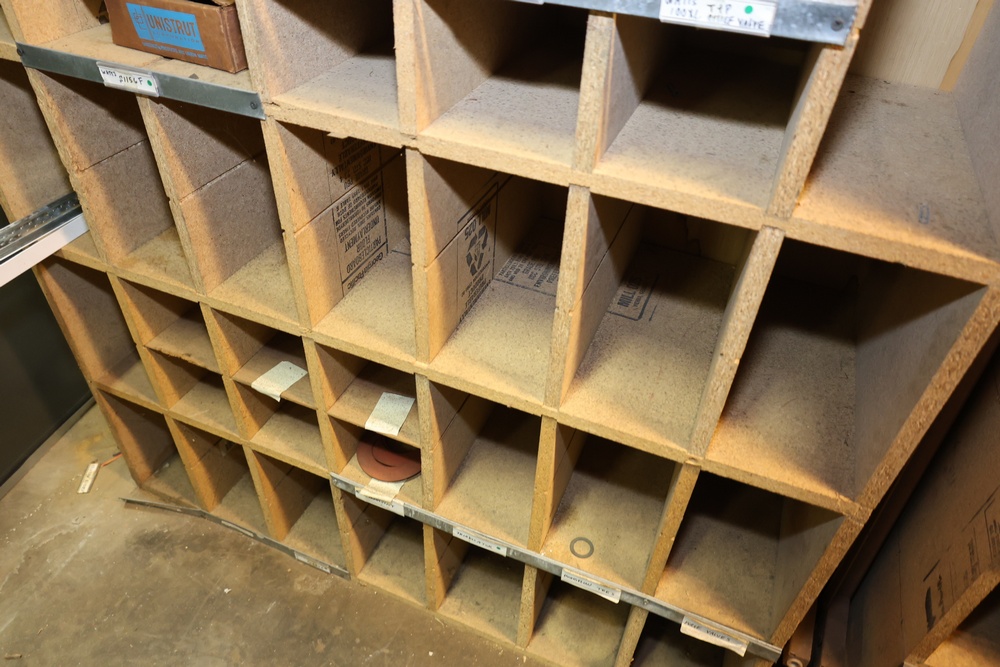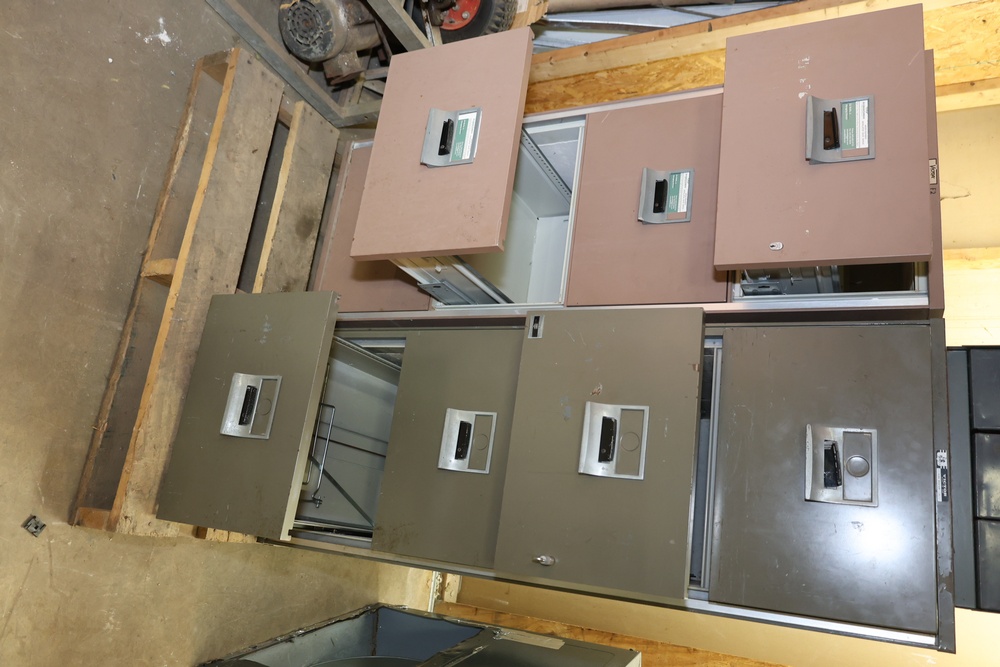 Contents of storage bins including parts, hardware, metal locker, fire resistant filing cabinets, etc. Buyer must take all.