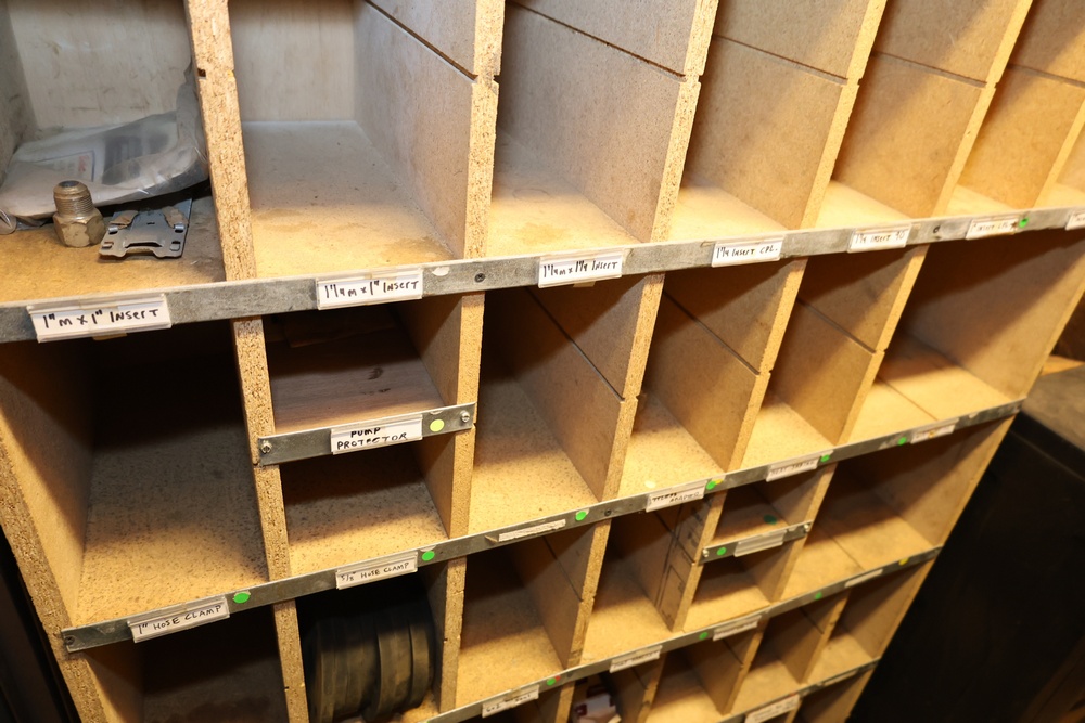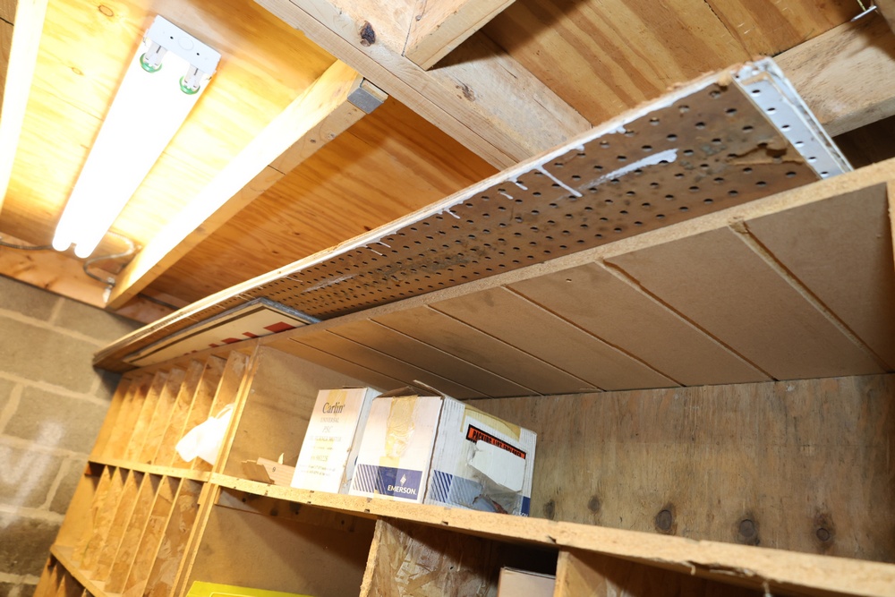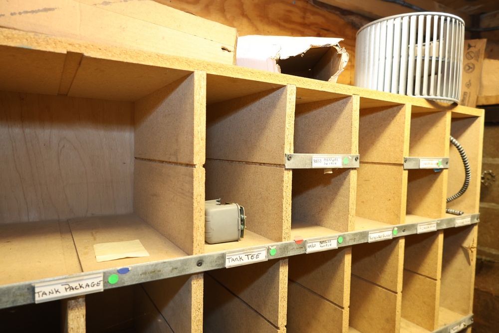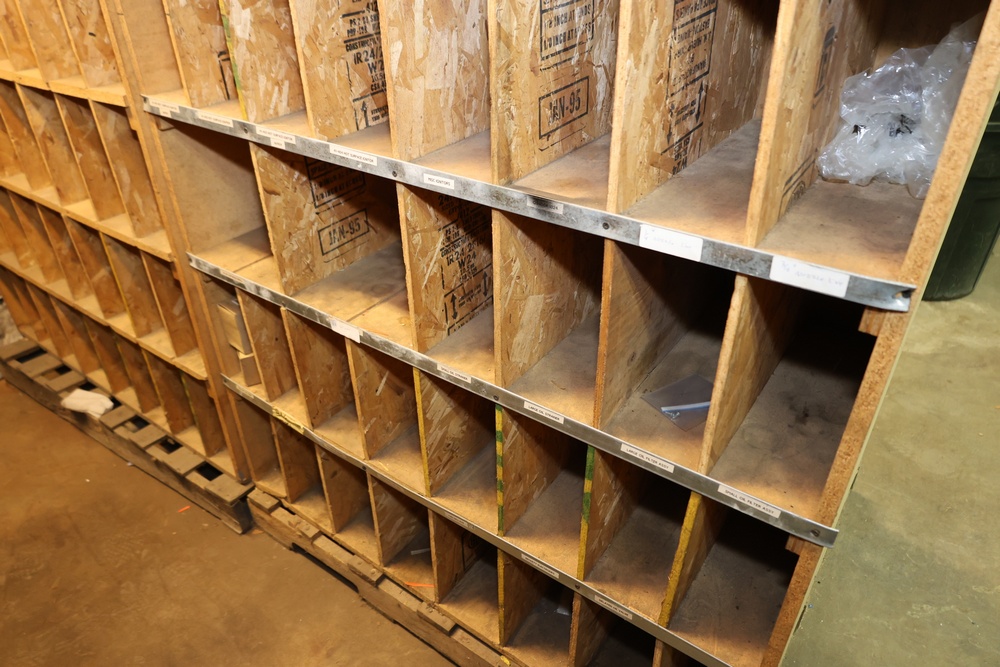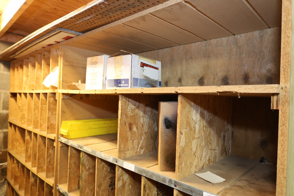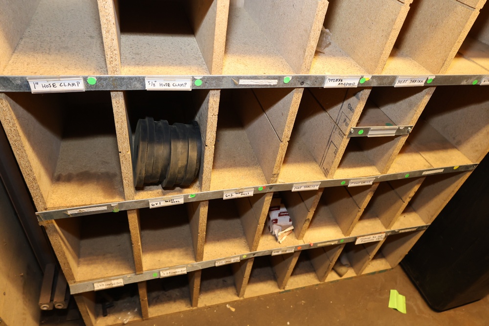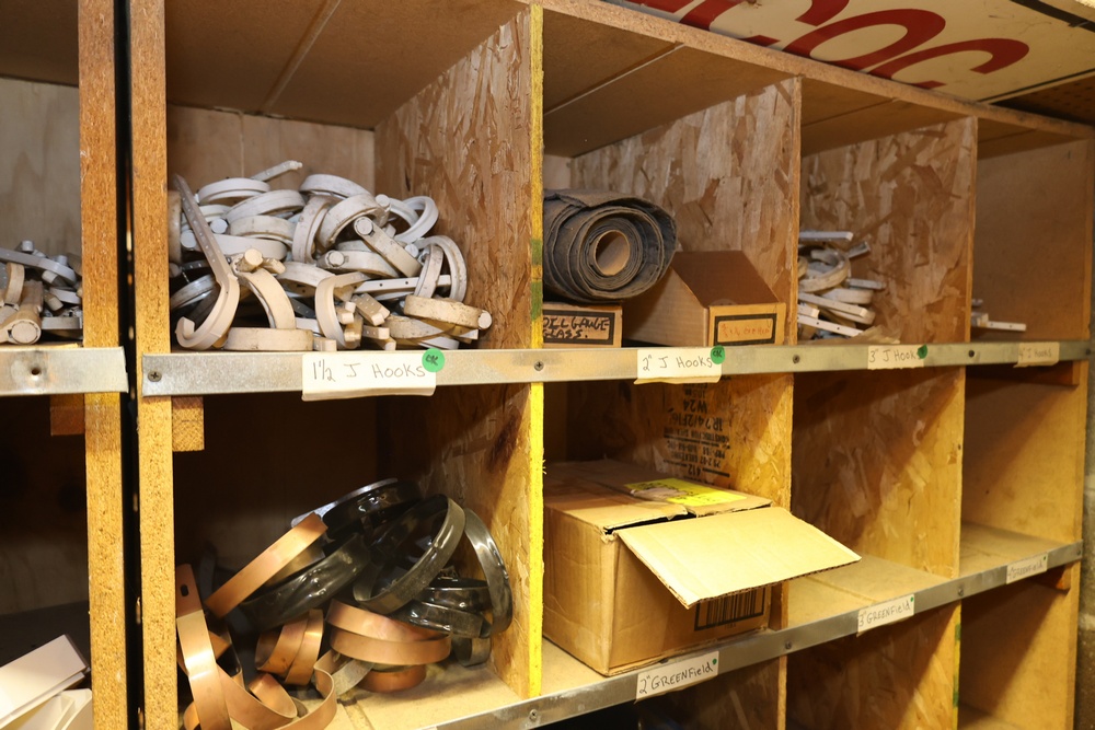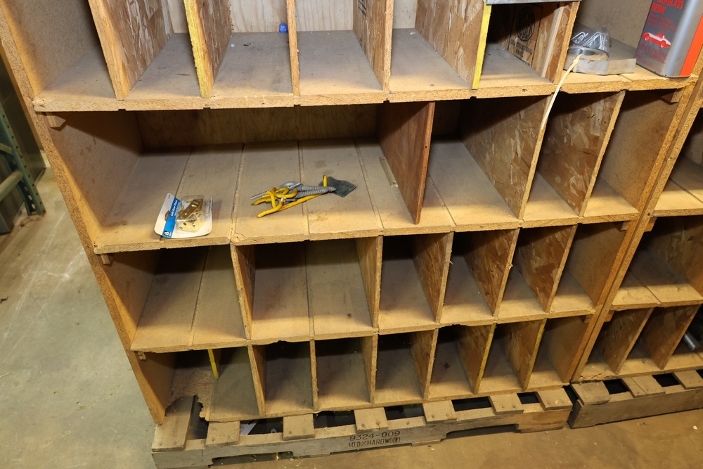 Contents of storage bins including parts, hardware, metal locker, fire resistant filing cabinets, etc. Buyer must take all.