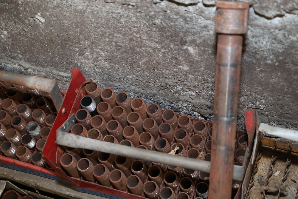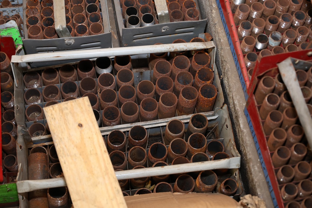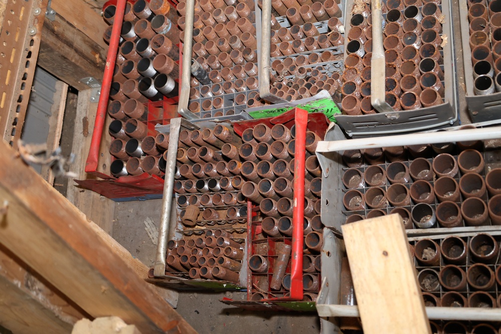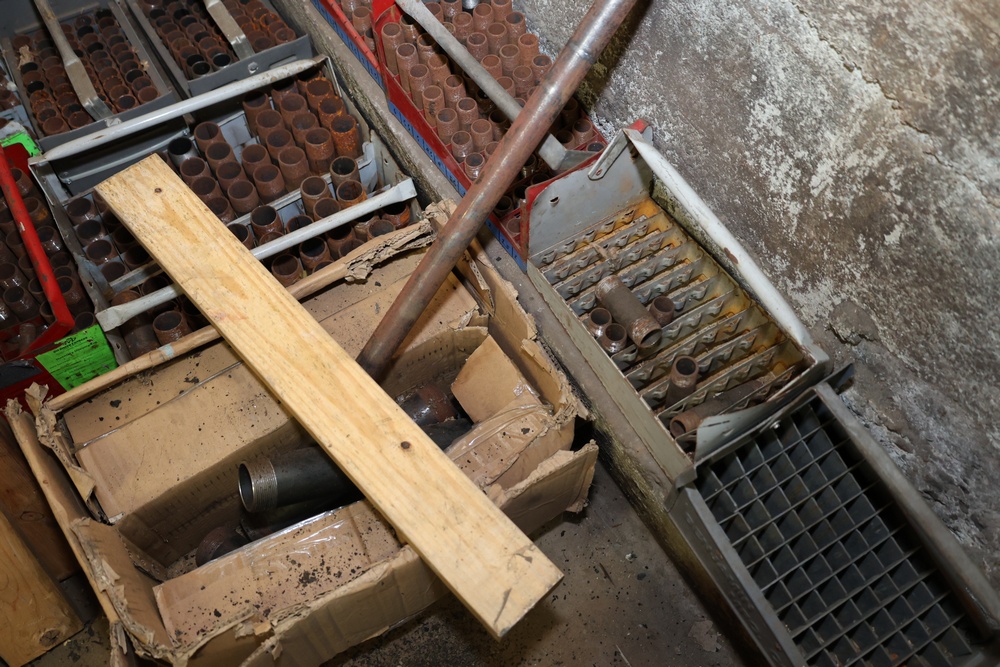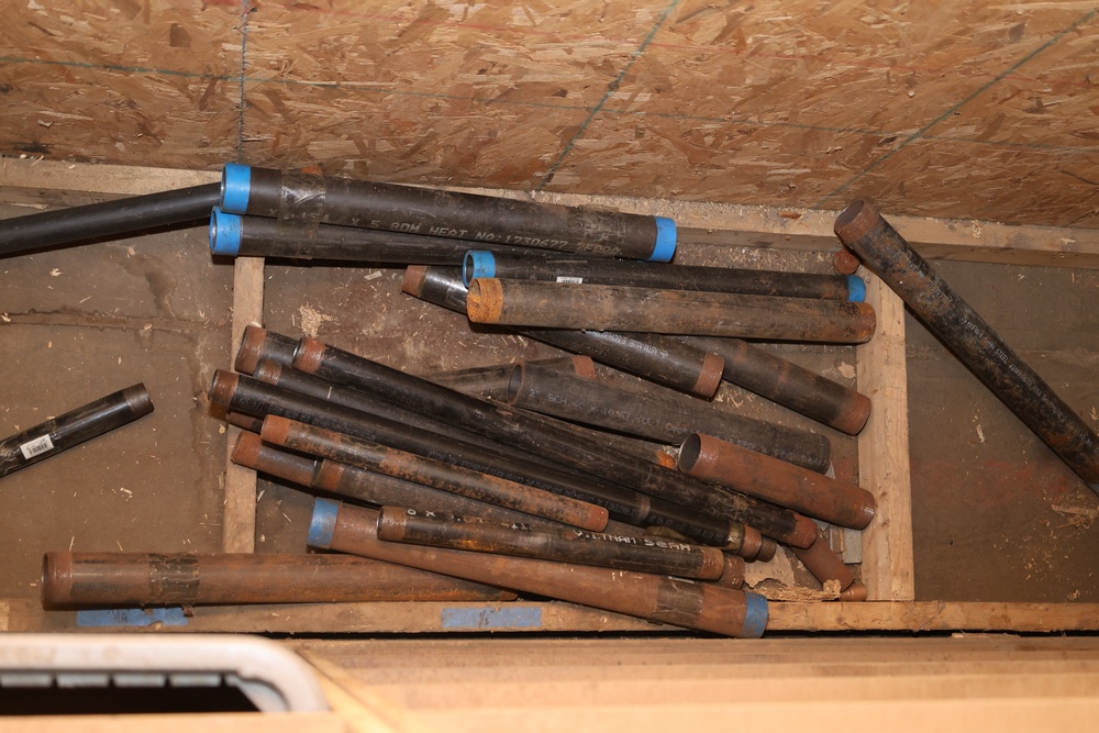 Metal Tubes and Pipes in Storage Racks. Includes multiple racks filled with cylindrical metal tubes in various diameters and lengths, alongside additional loose pipes. Some surfaces display signs of rust. Tools and other support materials are included. Buyer must take all.