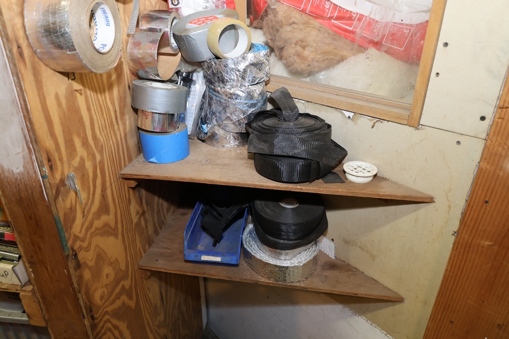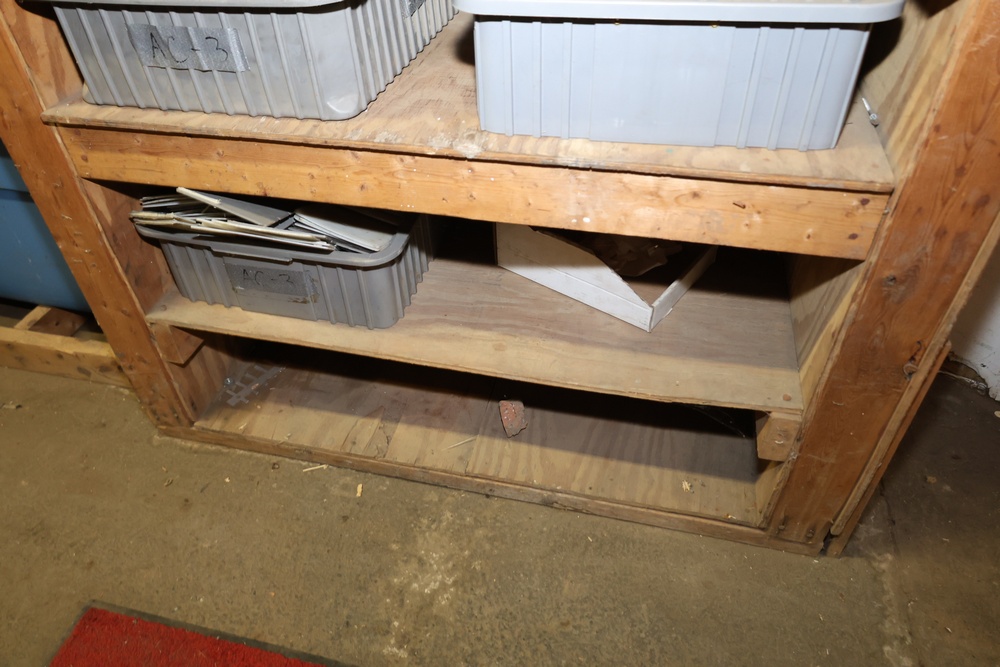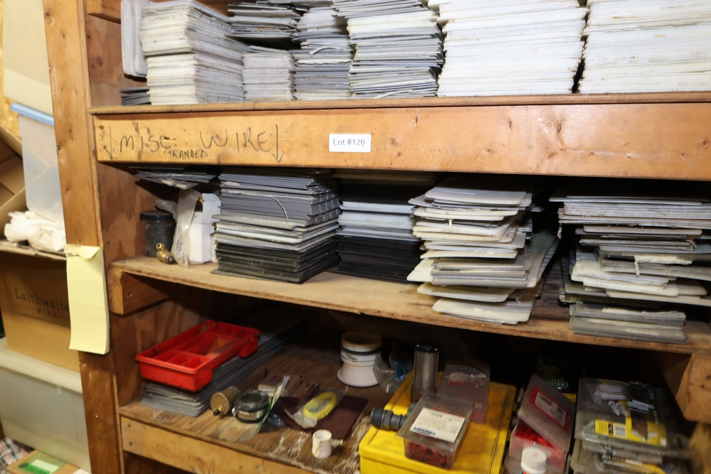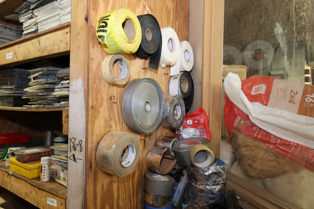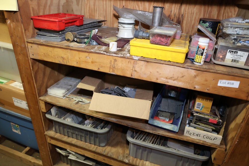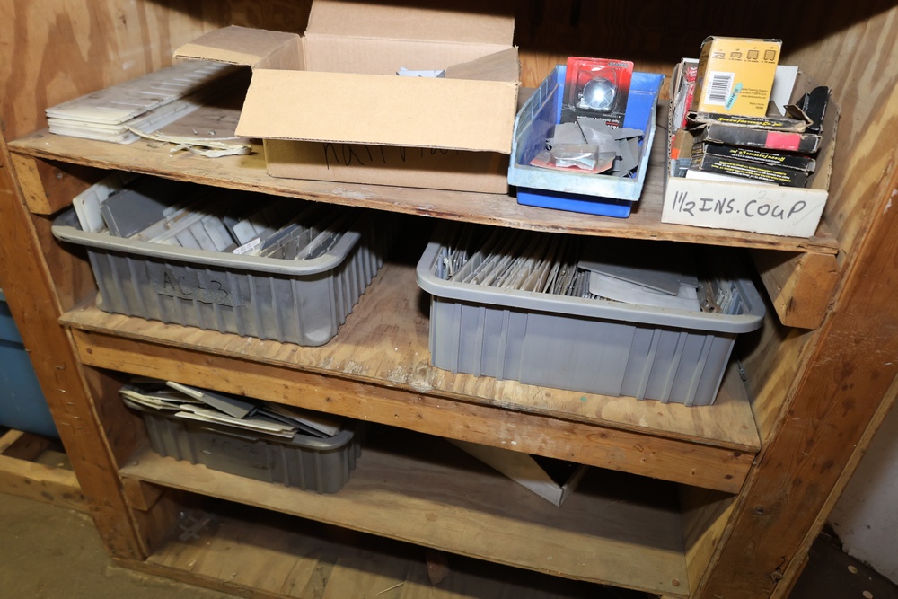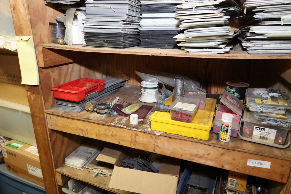 Hardware and Supplies. Includes plates, tapes, wires, small tools, and additional hardware. The unit features several shelves filled with categorized bins and boxes. Excludes shelving unit. Buyer must take all.