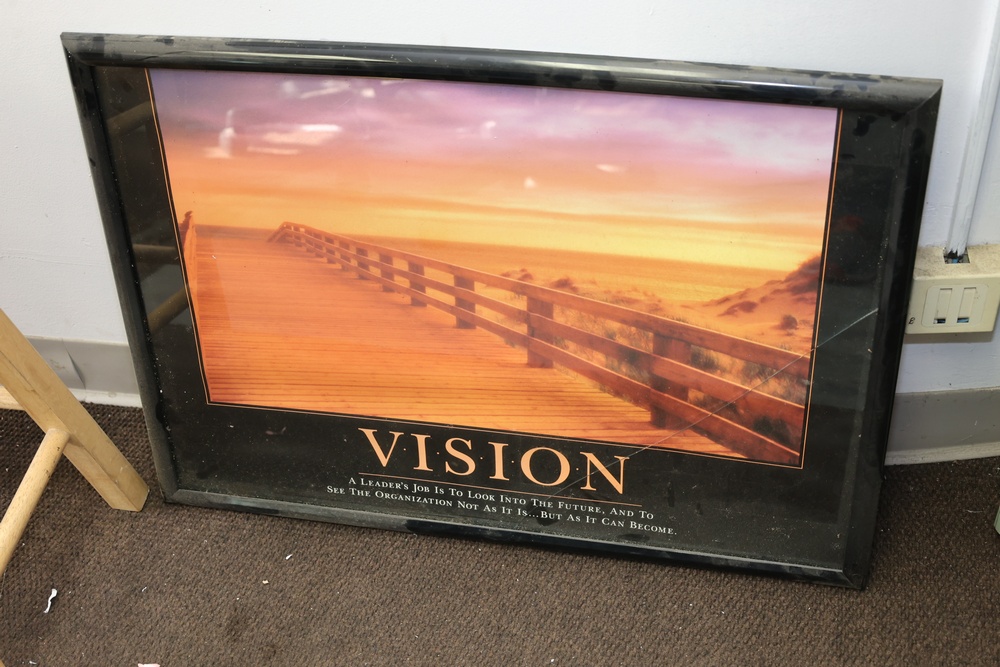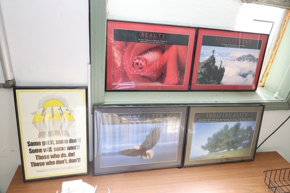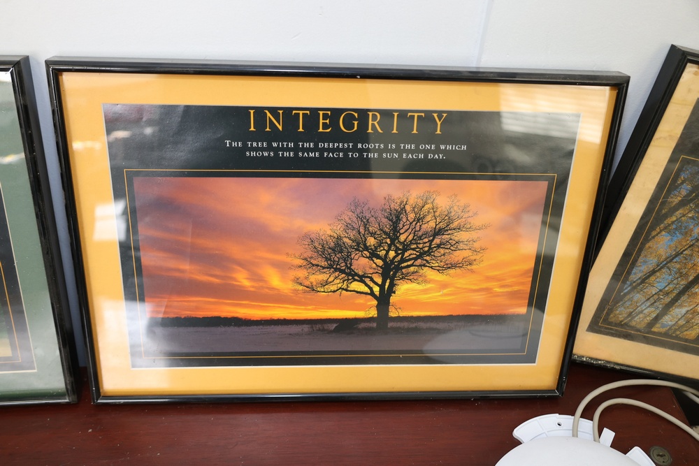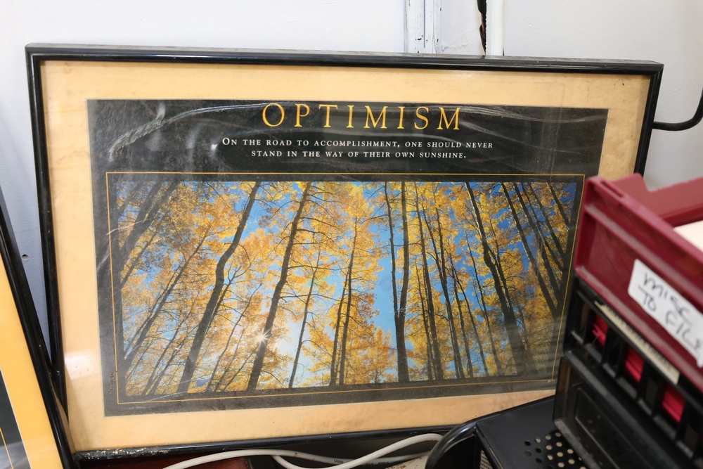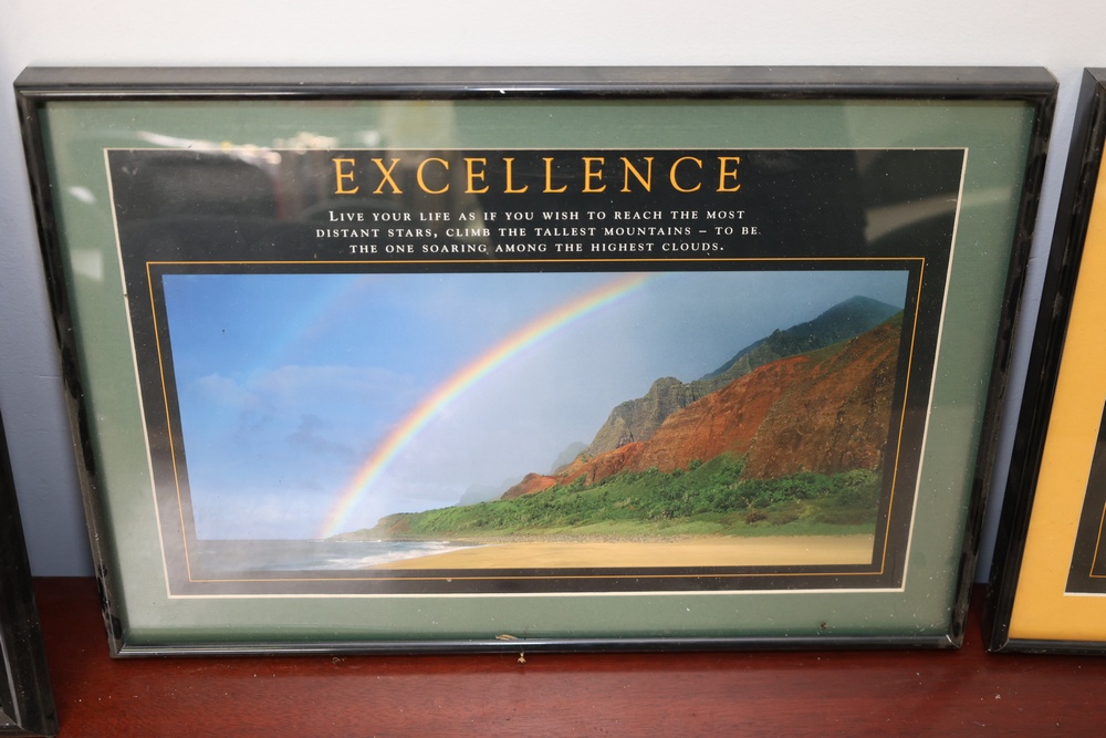 Framed Motivational and Inspirational Posters. Includes multiple themes such as Excellence, Communication, Service, Vision, Opportunity, Dream, Integrity, Risk, Optimism, and others. Each poster features unique artwork with corresponding motivational quotes. Buyer must take all.