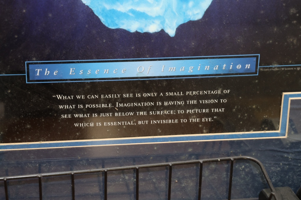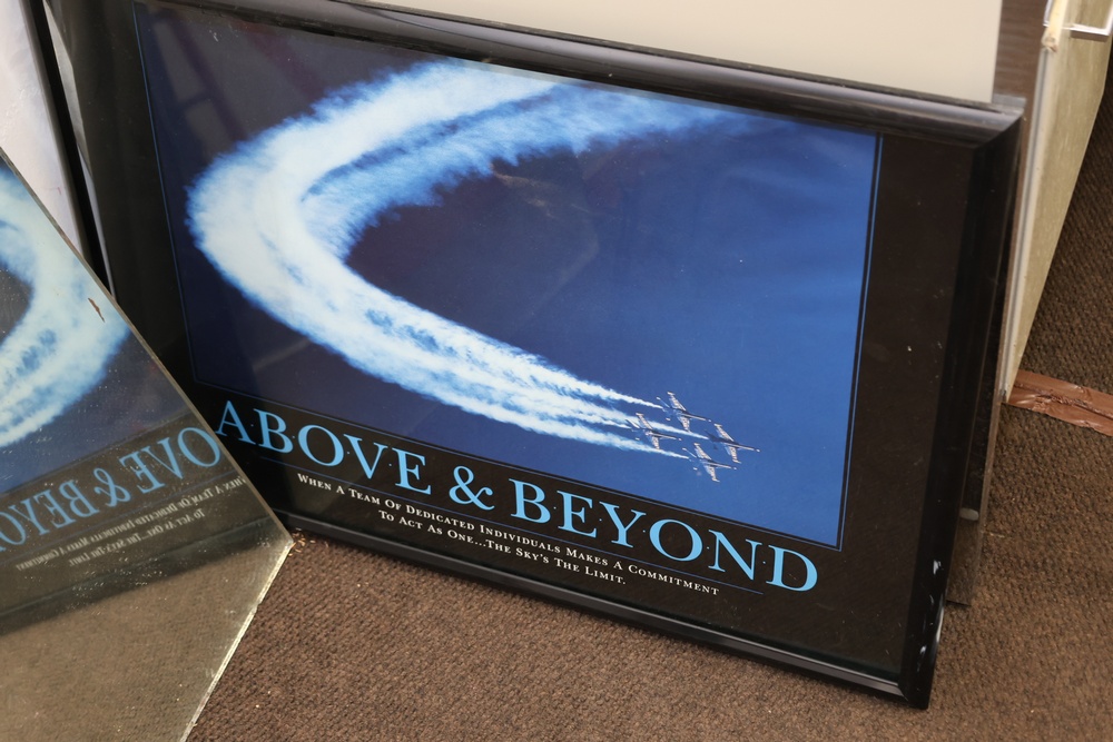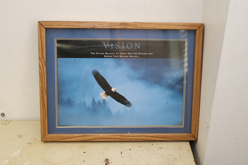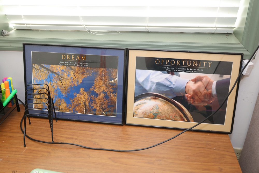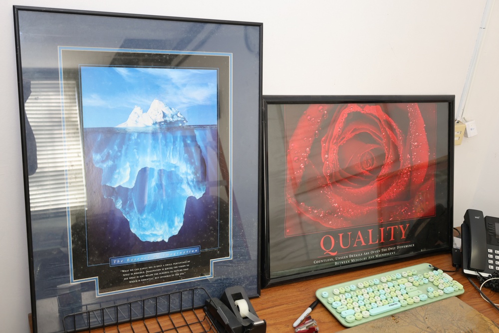 Framed Motivational and Inspirational Posters. Includes multiple themes such as Excellence, Communication, Service, Vision, Opportunity, Dream, Integrity, Risk, Optimism, and others. Each poster features unique artwork with corresponding motivational quotes. Buyer must take all.