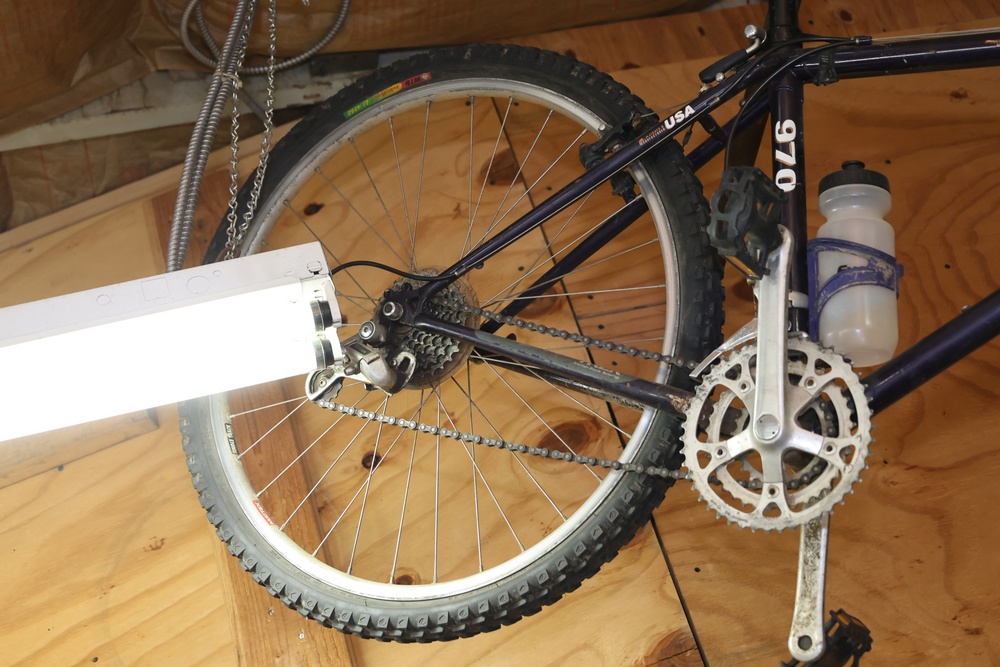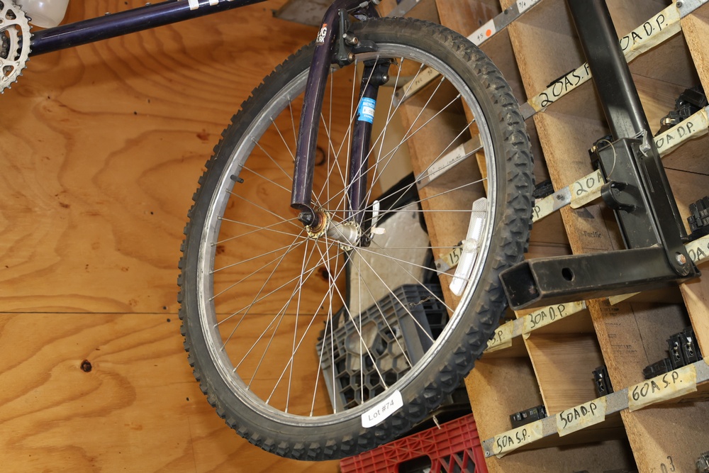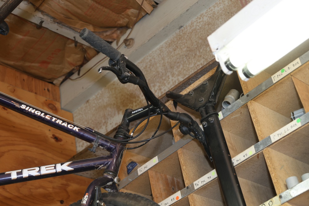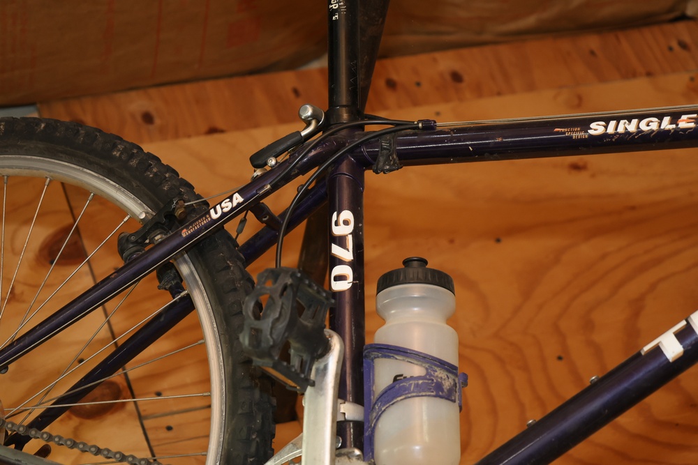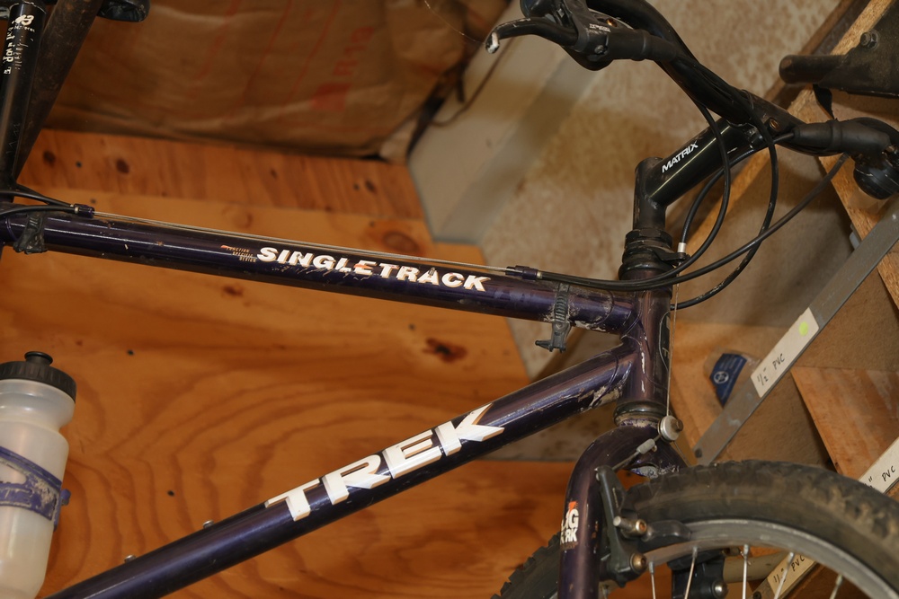 Trek Singletrack 970 Bicycle With Wall Mount. Features a purple Trek Singletrack frame with visible decals, handlebars, pedals, and tires. Includes a mounted water bottle holder.
