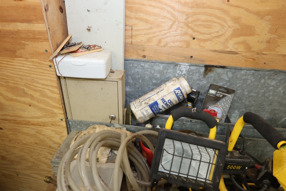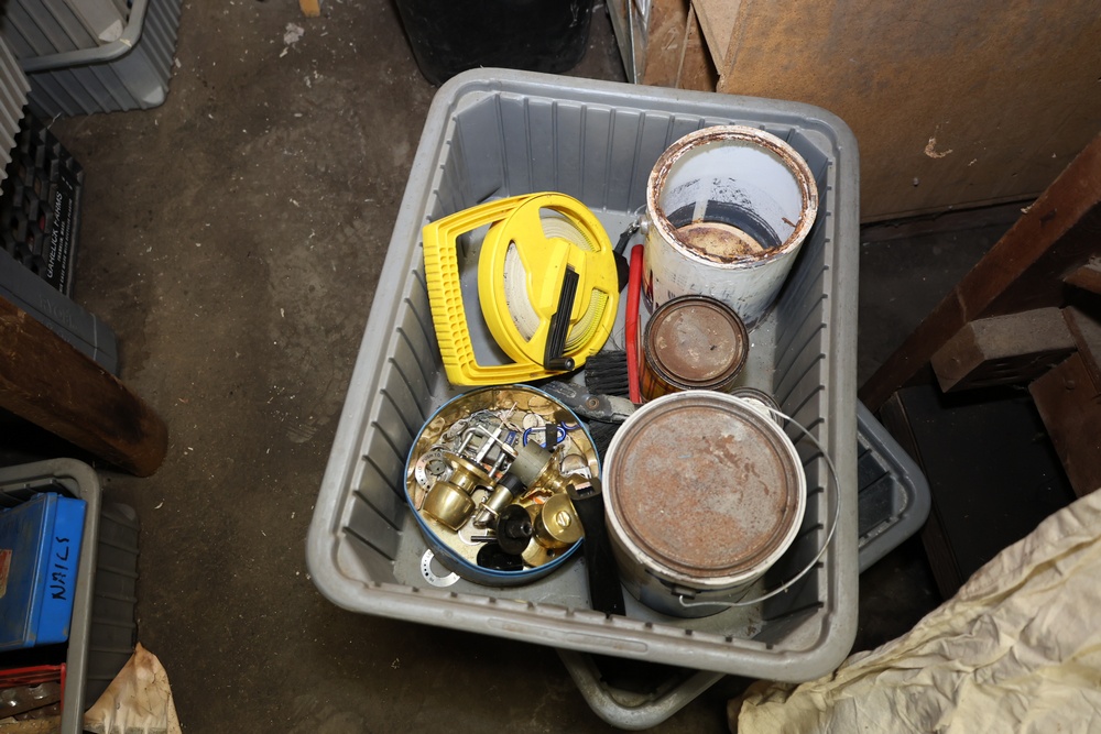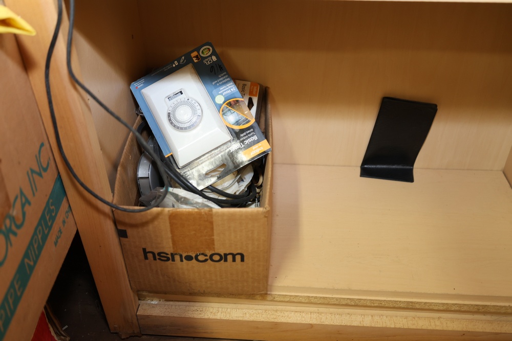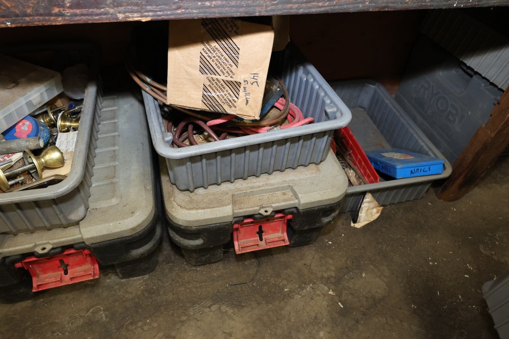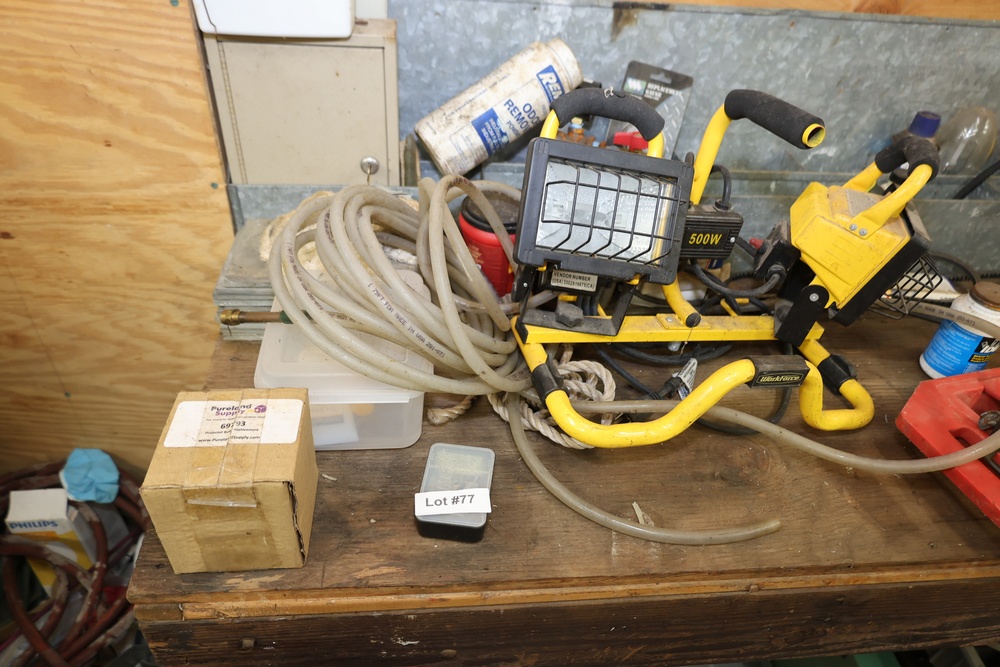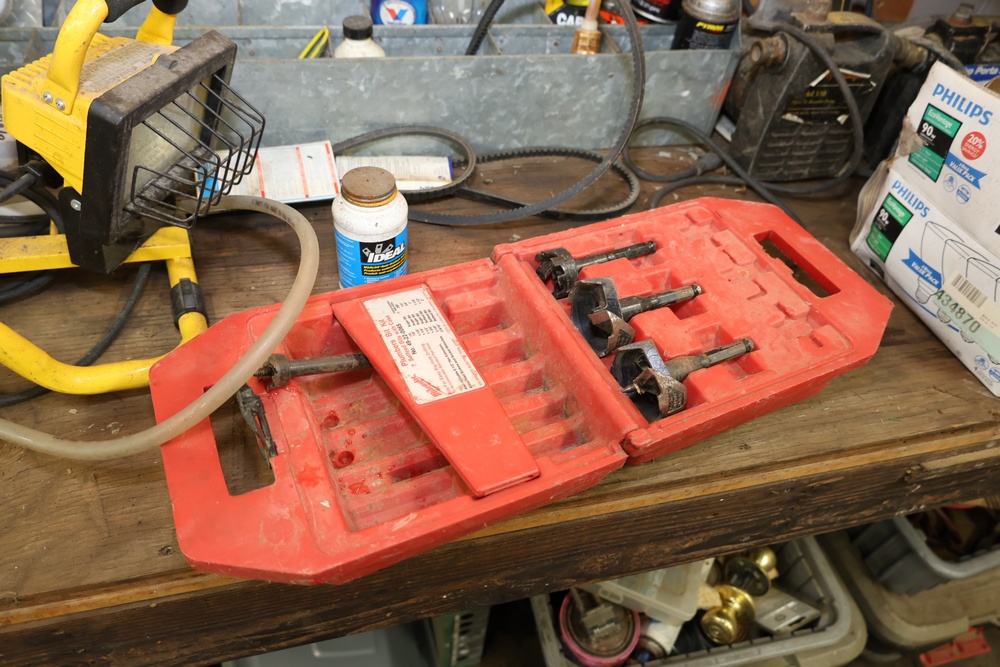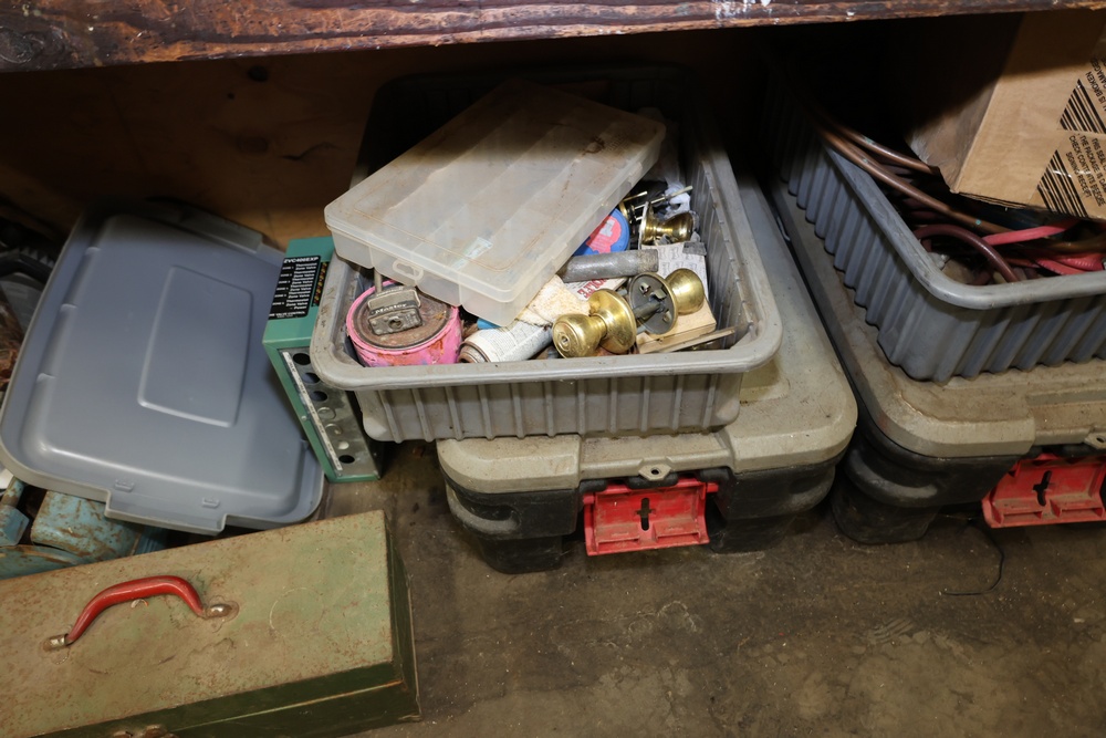 Workshop Tools with Lighting Equipment, Hand Tools, and Storage. Includes a variety of workshop items such as hand tools, hardware, lighting equipment, tool organizers, and storage bins. The lot also contains industrial cables, wood drill bits in a case, lubricants, fasteners, and miscellaneous workshop materials. Buyer must take all.