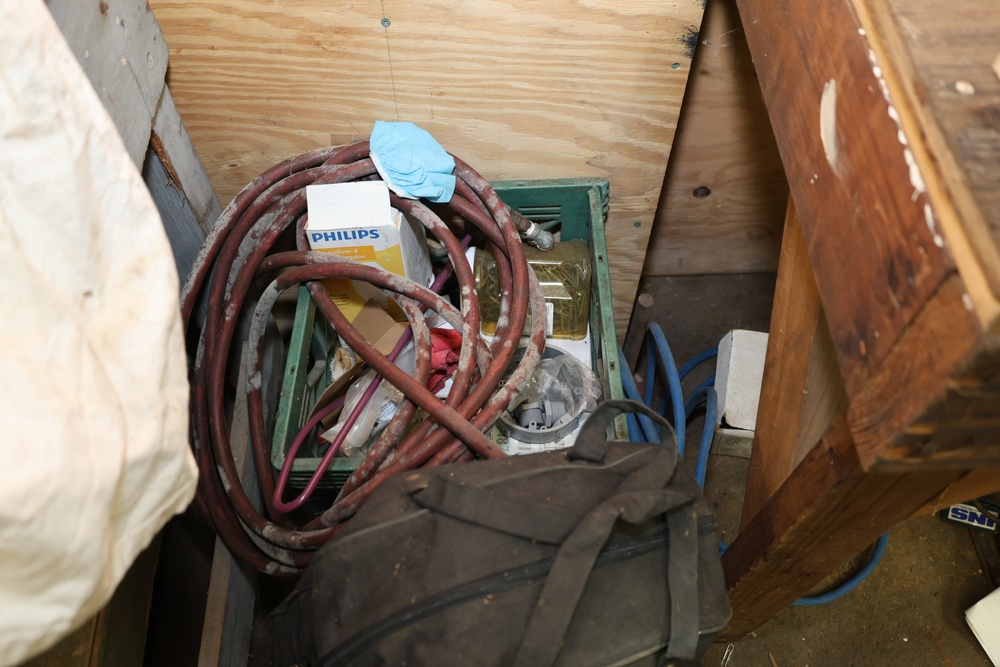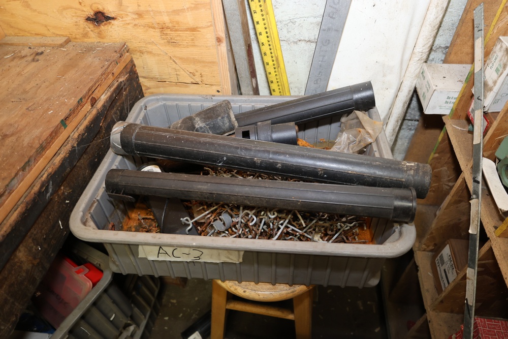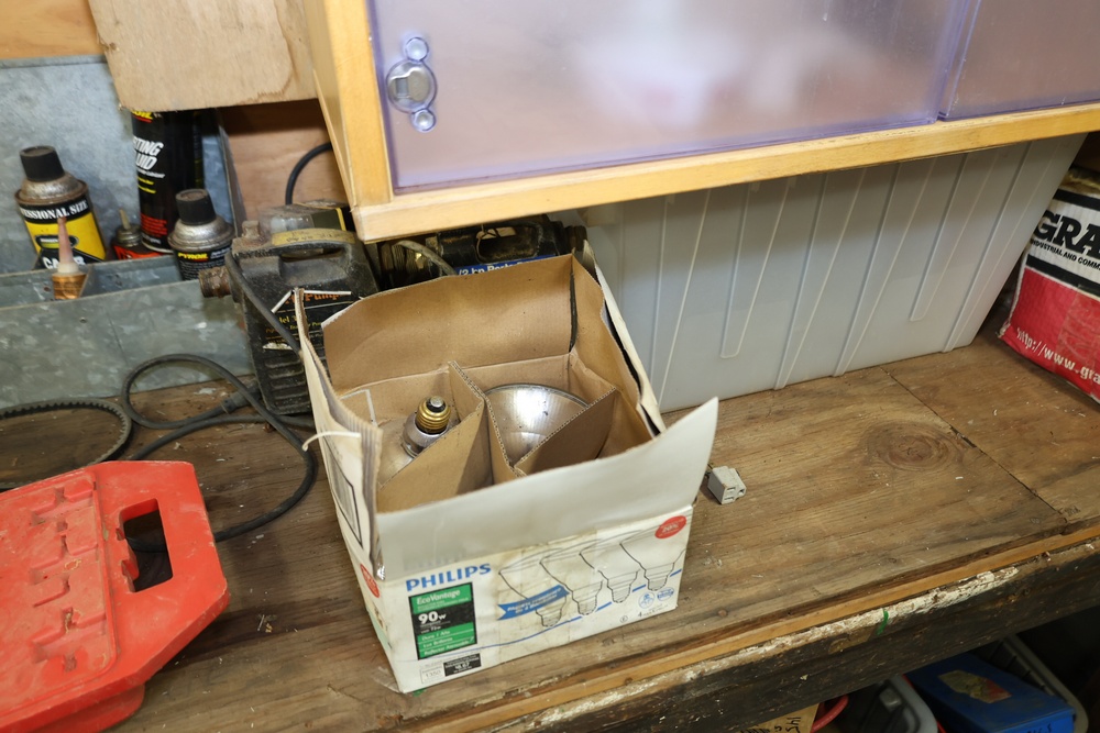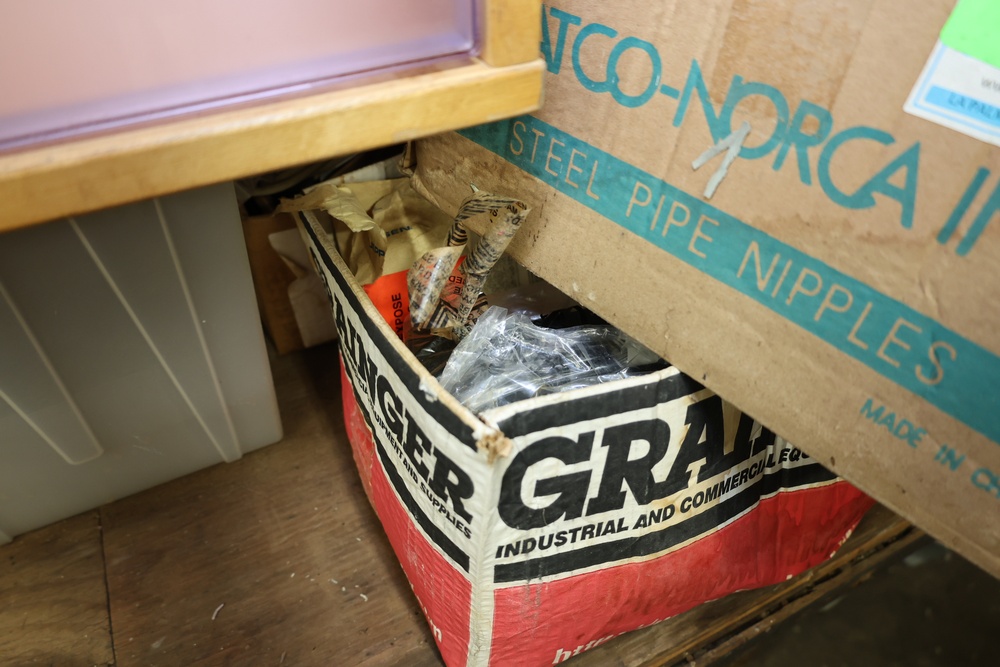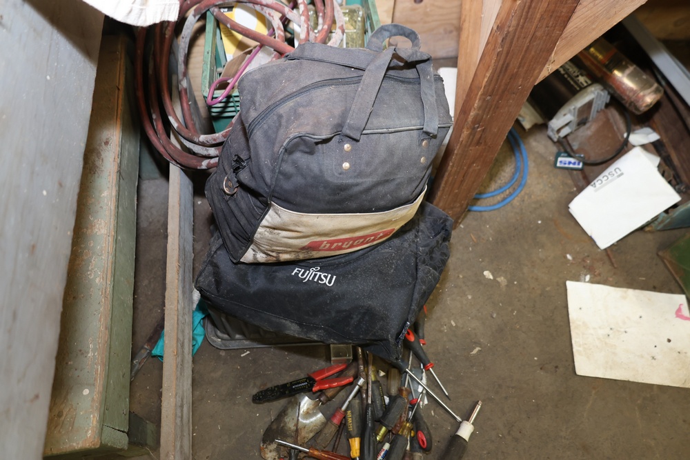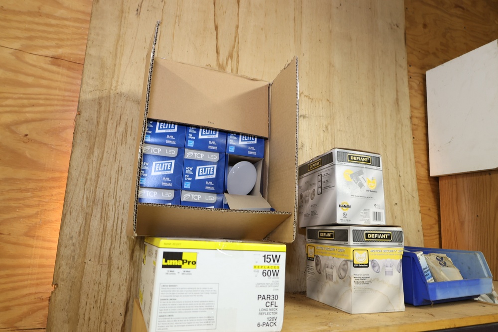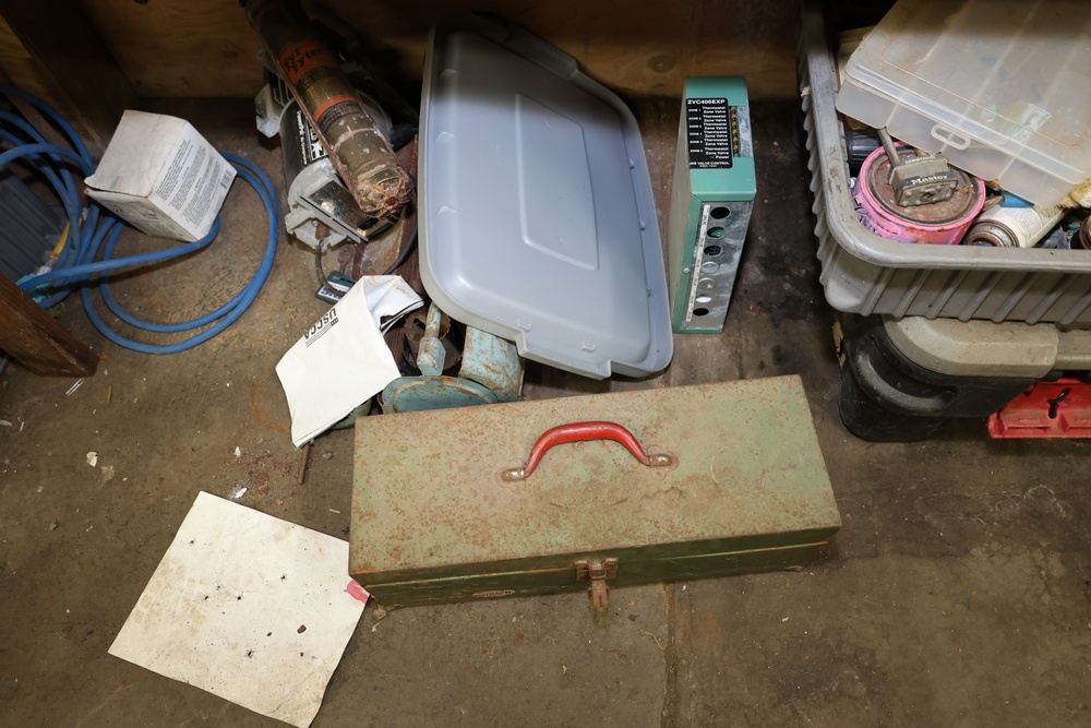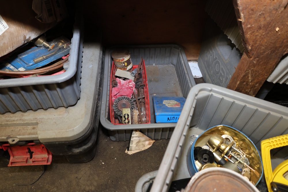 Workshop Tools with Lighting Equipment, Hand Tools, and Storage. Includes a variety of workshop items such as hand tools, hardware, lighting equipment, tool organizers, and storage bins. The lot also contains industrial cables, wood drill bits in a case, lubricants, fasteners, and miscellaneous workshop materials. Buyer must take all.