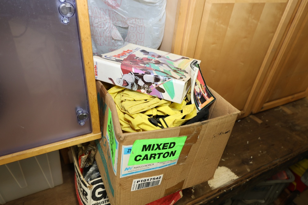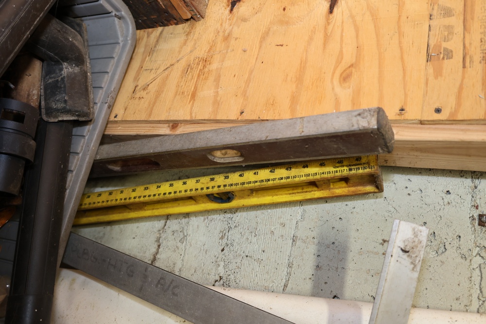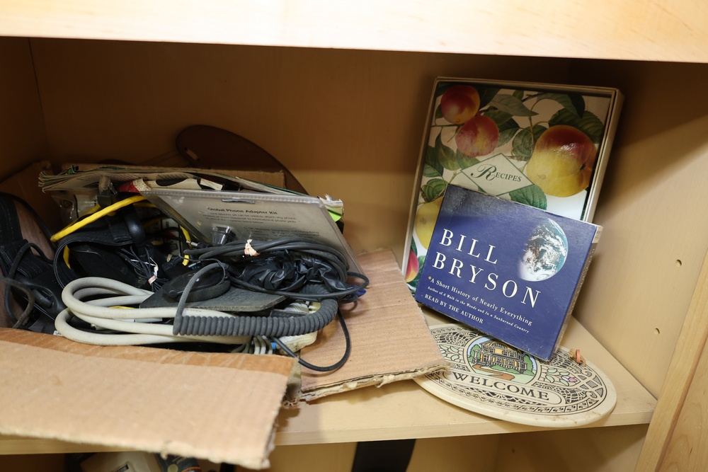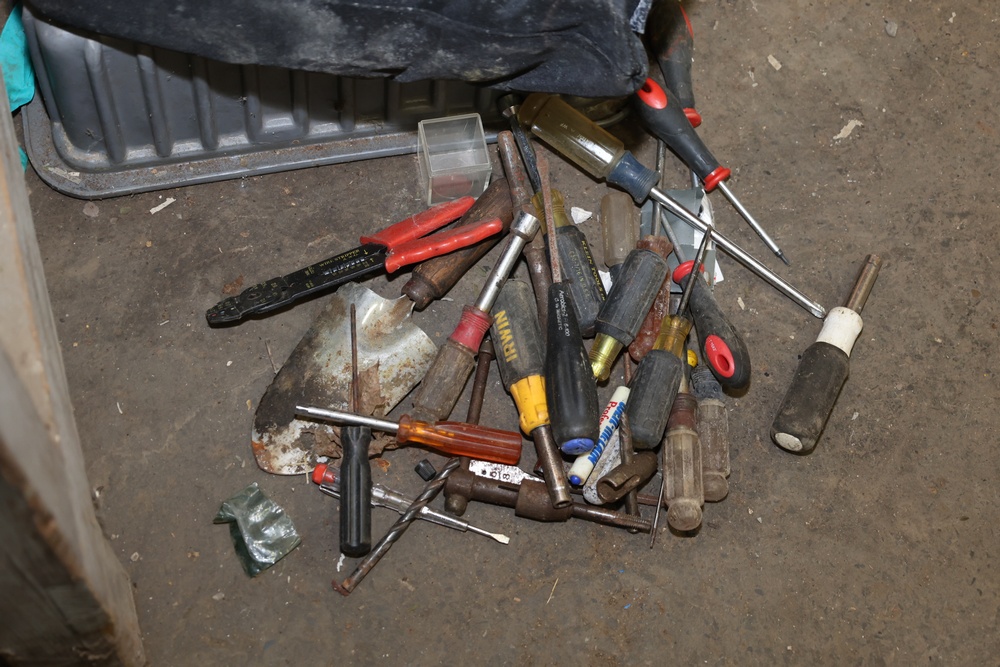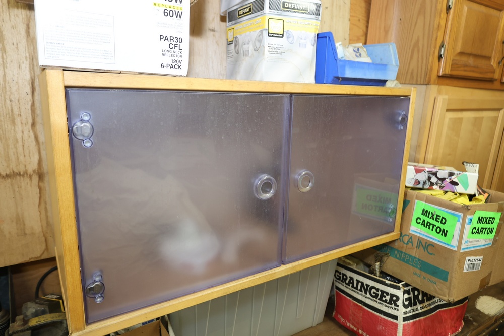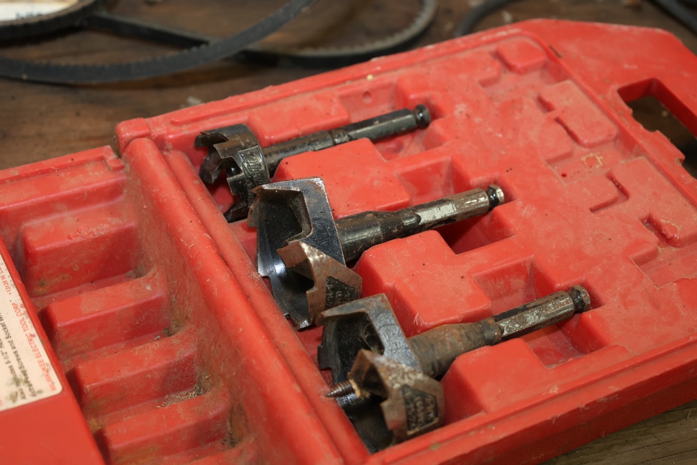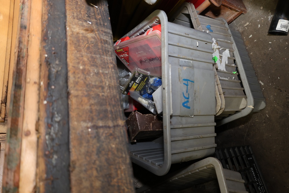 Workshop Tools with Lighting Equipment, Hand Tools, and Storage. Includes a variety of workshop items such as hand tools, hardware, lighting equipment, tool organizers, and storage bins. The lot also contains industrial cables, wood drill bits in a case, lubricants, fasteners, and miscellaneous workshop materials. Buyer must take all.