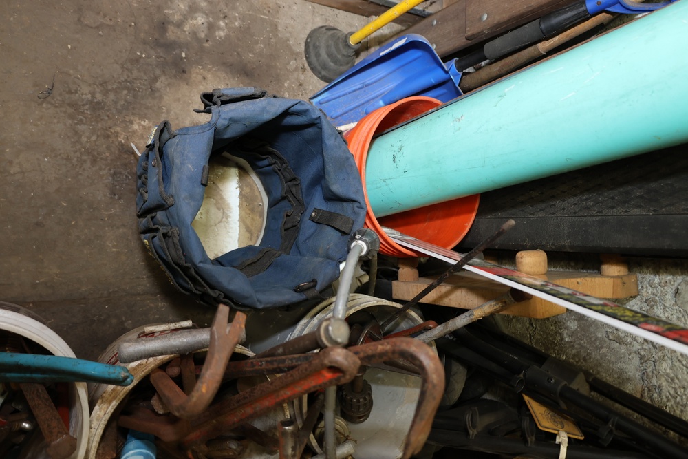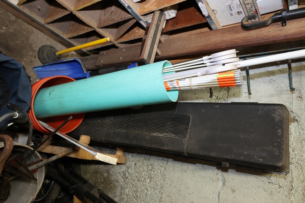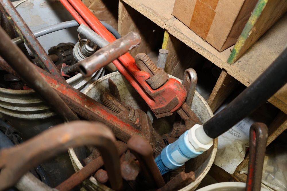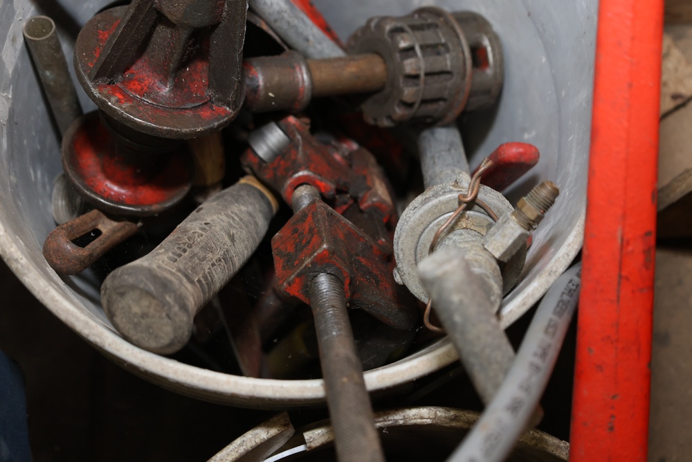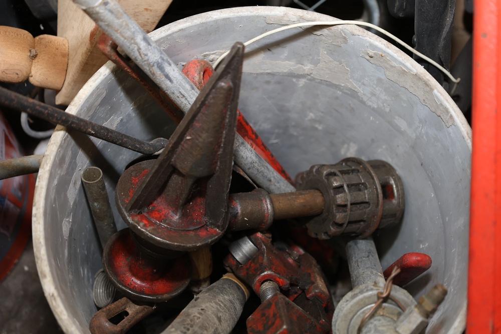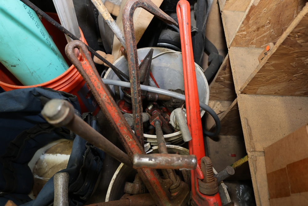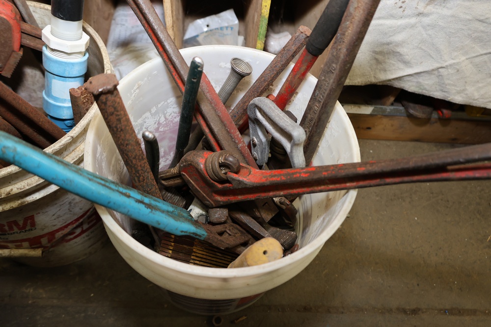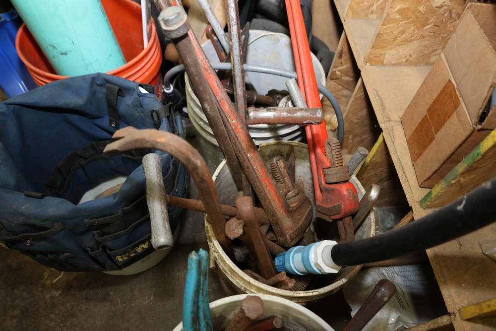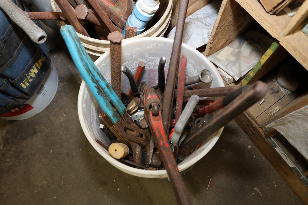 Hand Tools and Equipment in Buckets and Cases. Includes various hand tools such as pipe wrenches, crowbars, and plumbing tools stored in multiple buckets and containers. Also includes a portable carrying case and additional tools and accessories arranged nearby. Buyer must take all.
