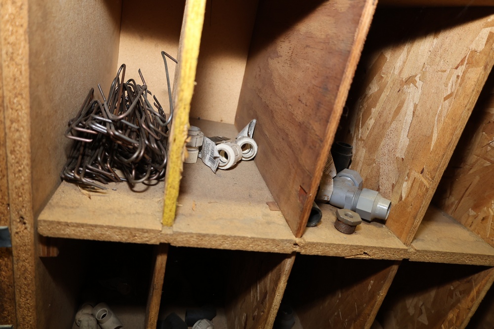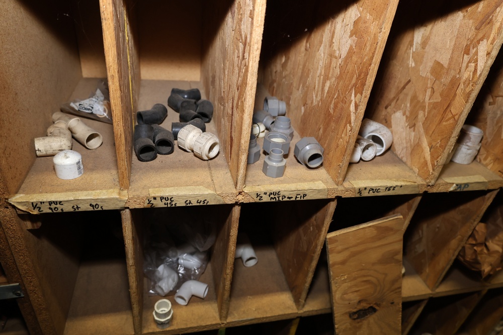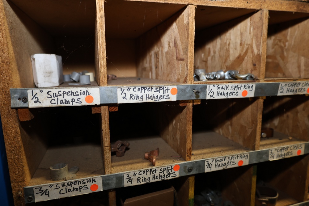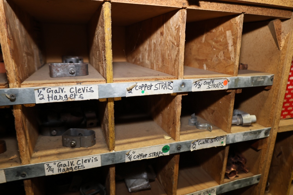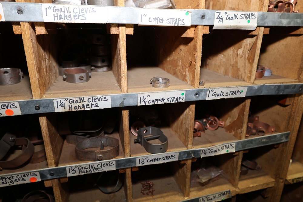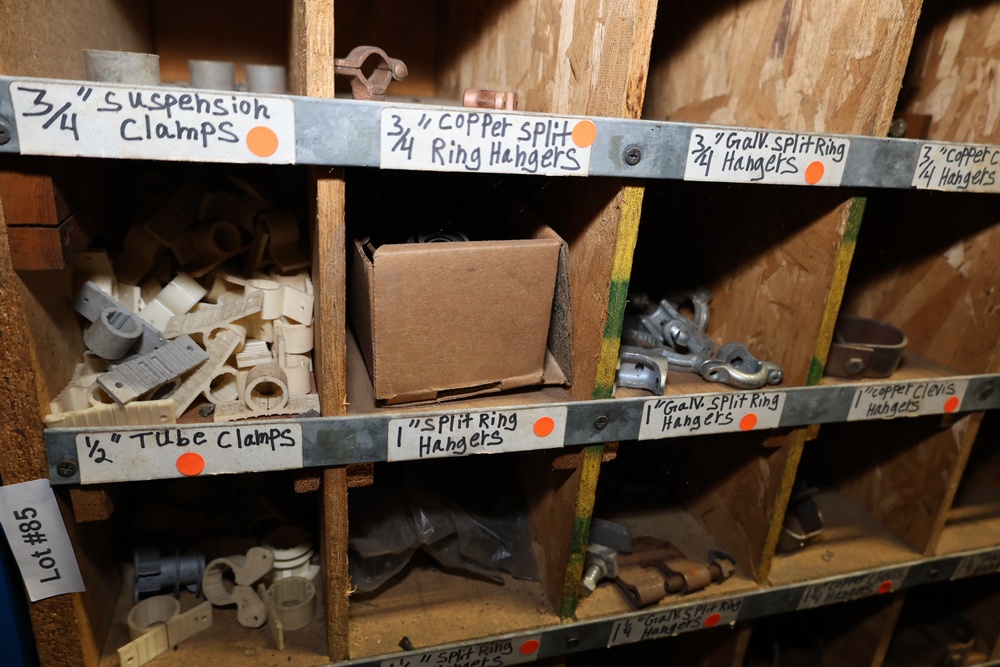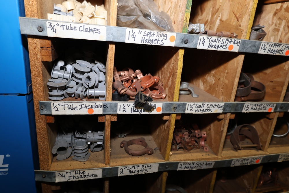 Assorted plumbing and hardware items, including clamps, hangers, insulators, and fittings. Some cubbies also hold boxed items and loose hardware pieces. Buyer must take all.