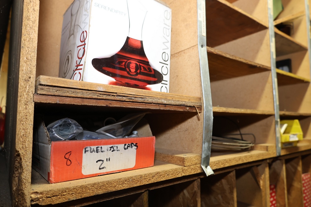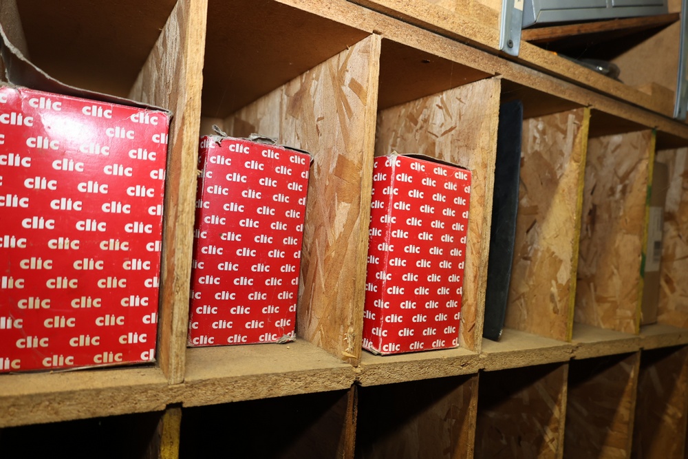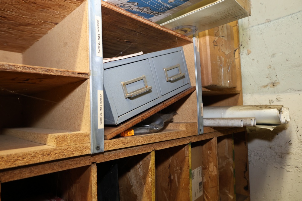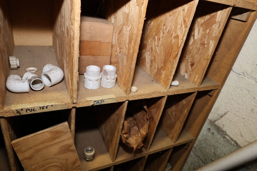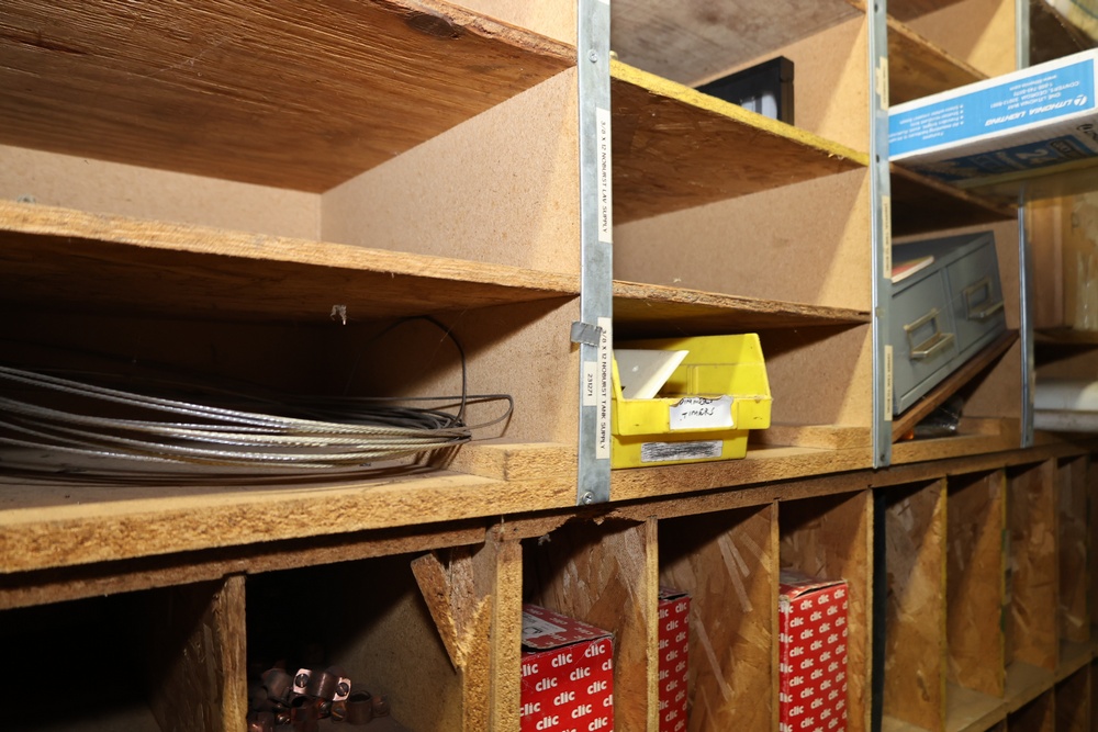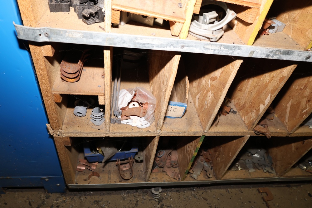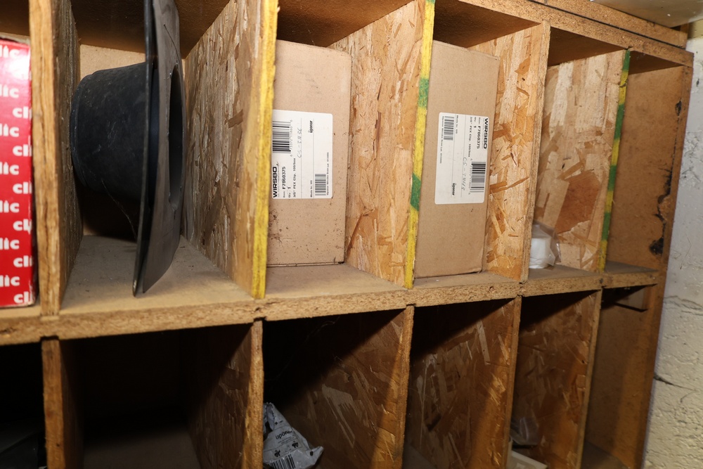 Assorted plumbing and hardware items, including clamps, hangers, insulators, and fittings. Some cubbies also hold boxed items and loose hardware pieces. Buyer must take all.
