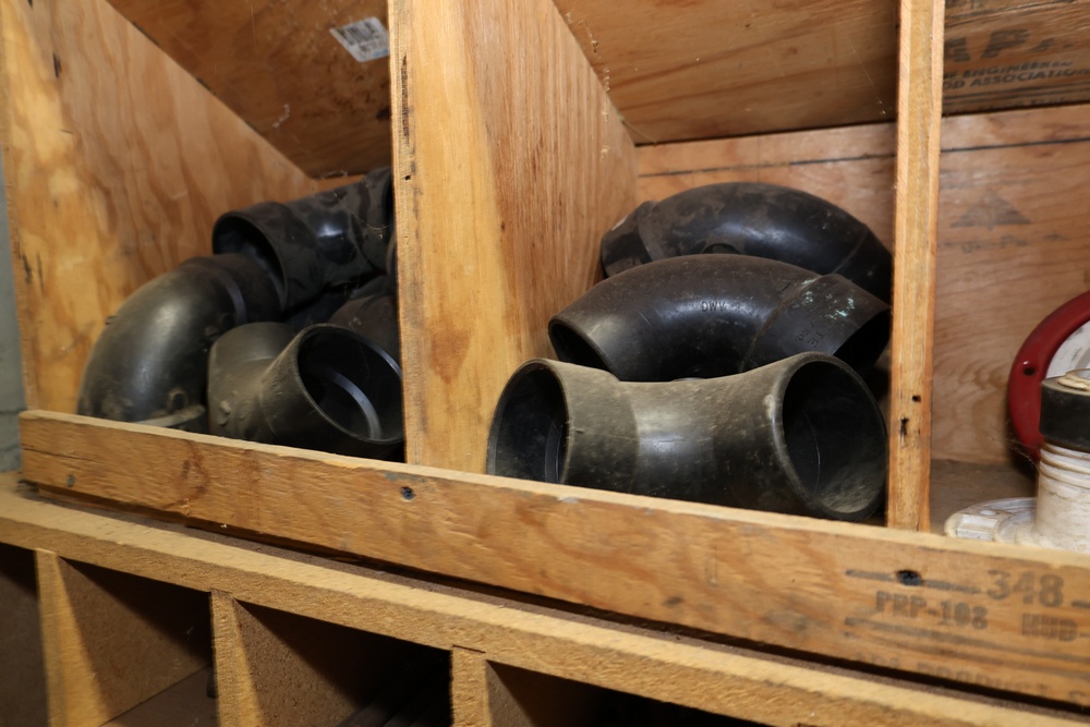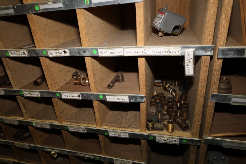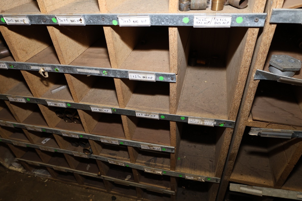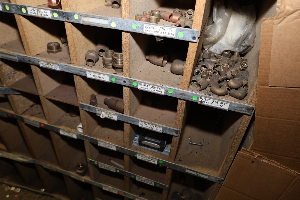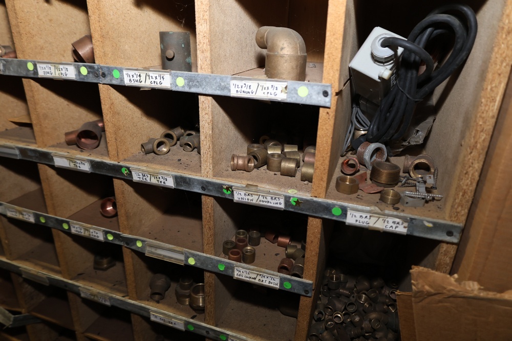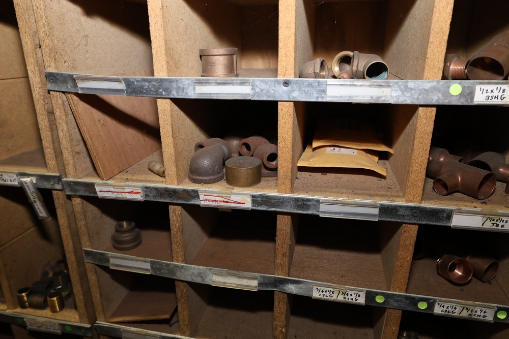 Plumbing and Hardware Components in Wooden Storage Bins. Includes various fittings, pipes, valves, and other hardware components. Buyer must take all.