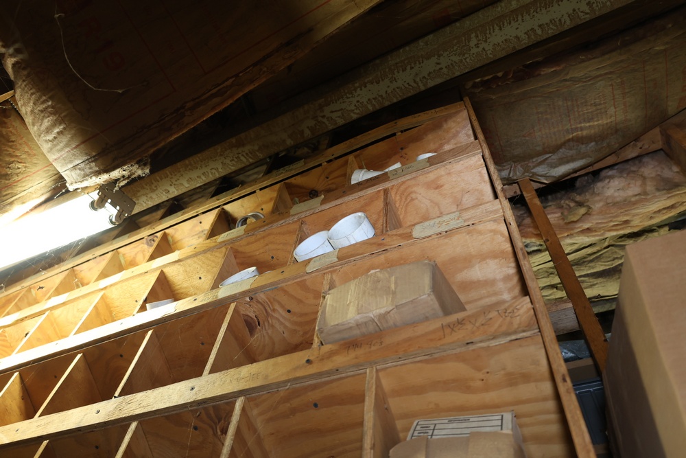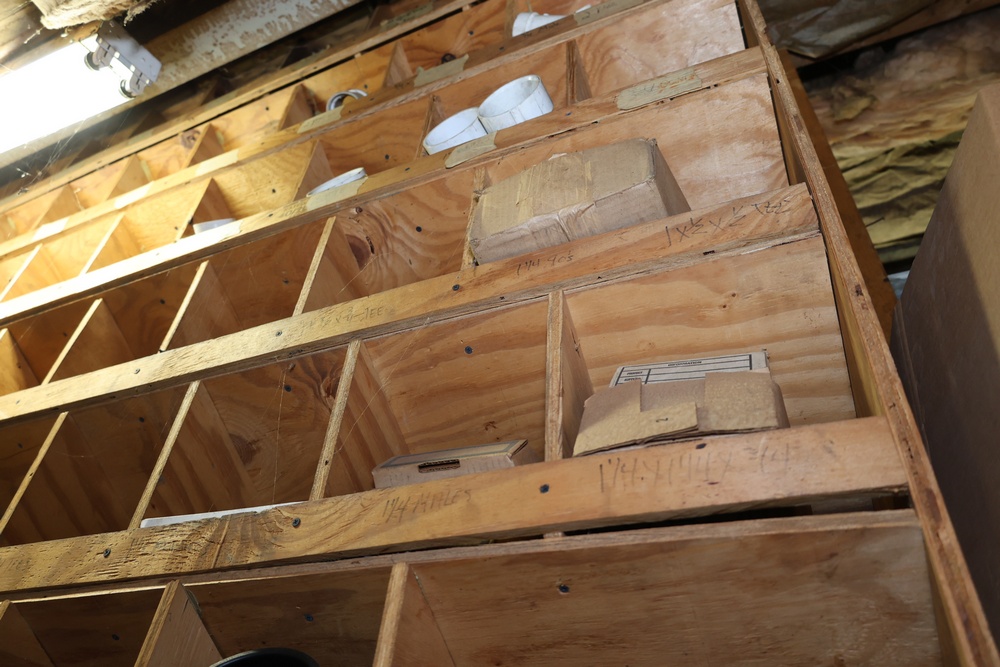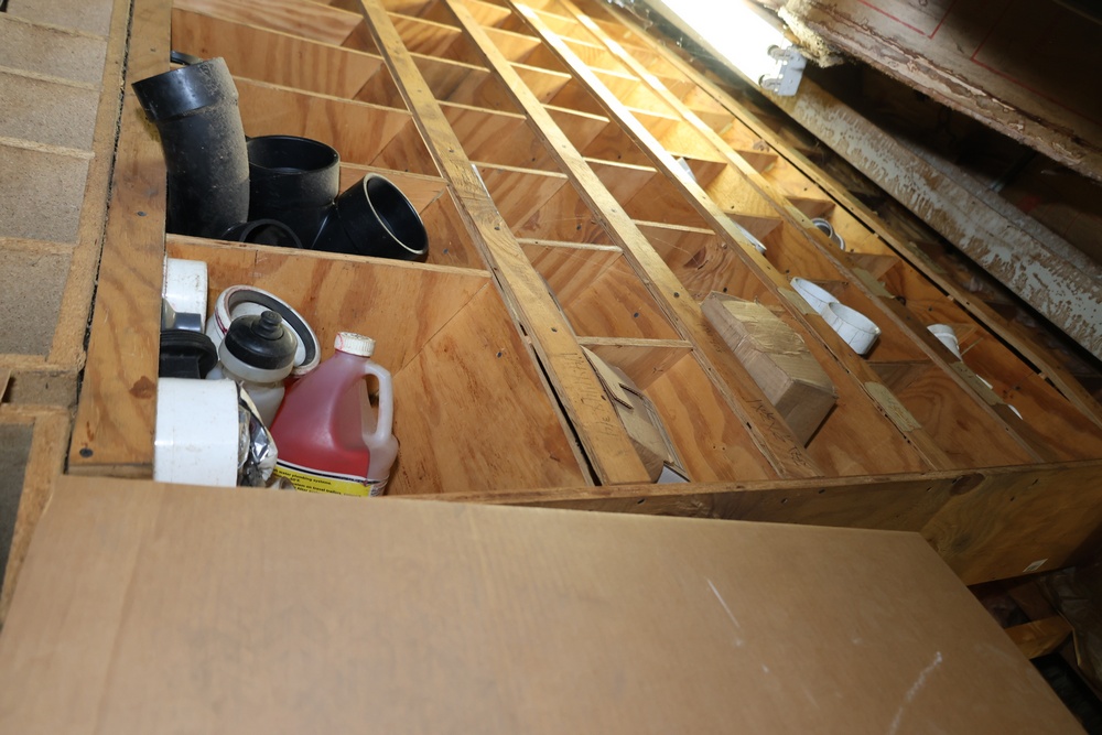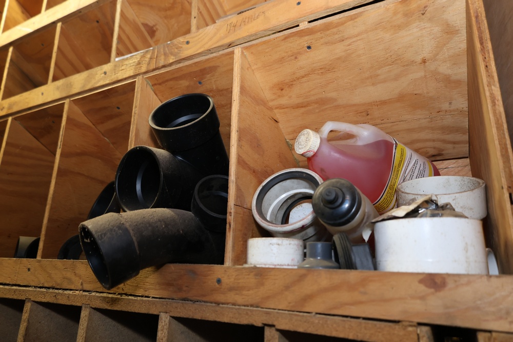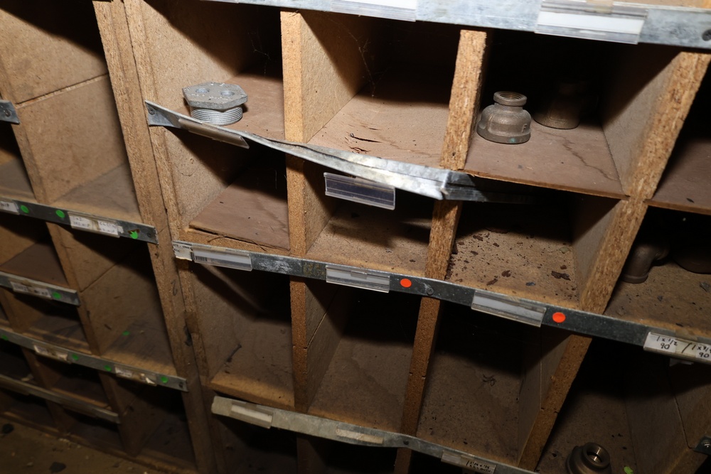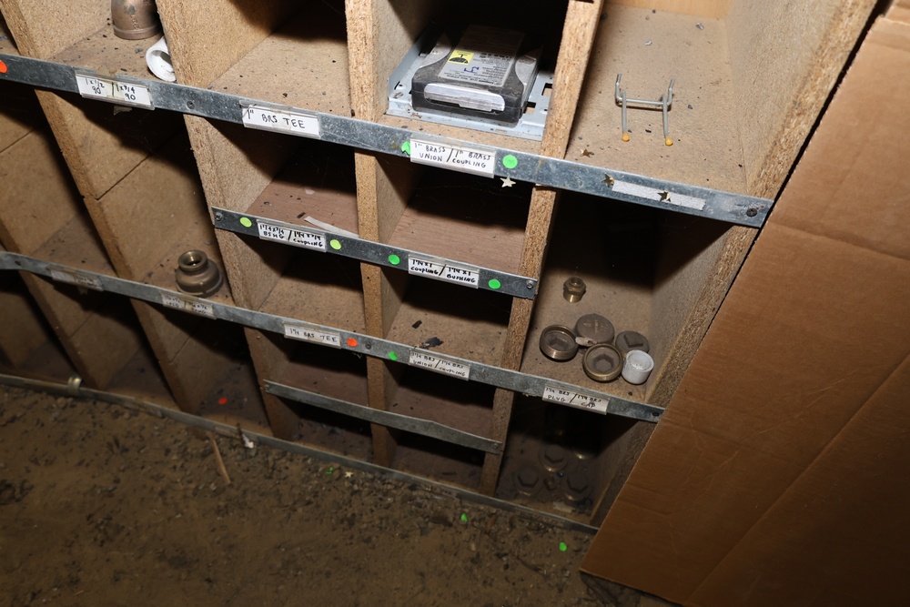 Plumbing and Hardware Components in Wooden Storage Bins. Includes various fittings, pipes, valves, and other hardware components. Buyer must take all.