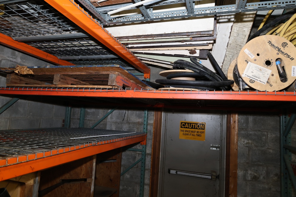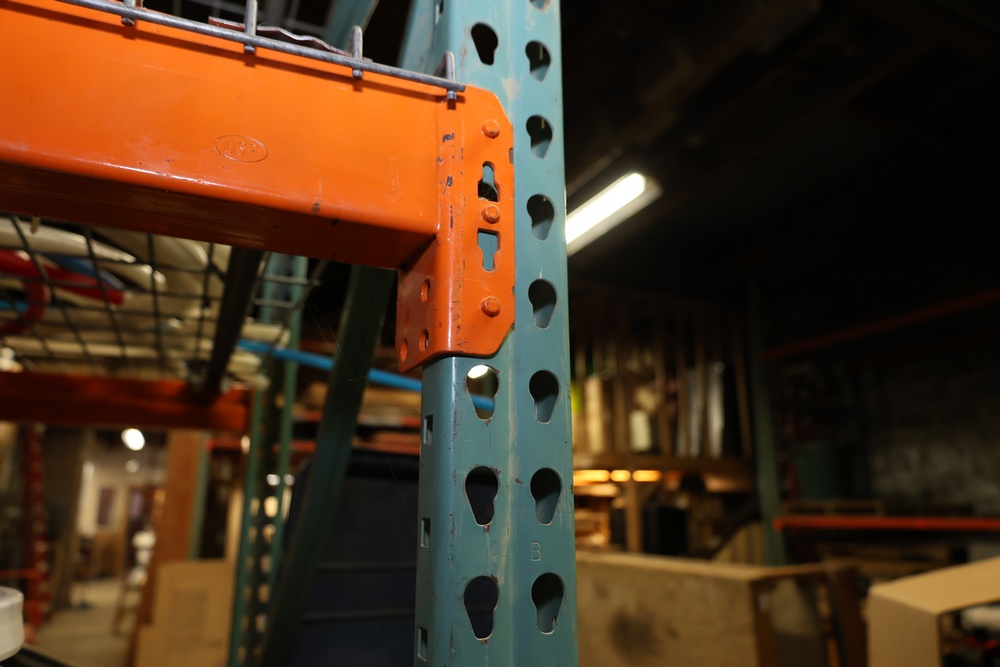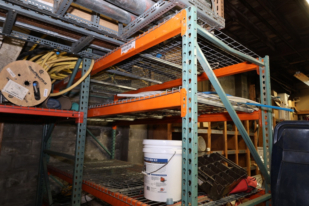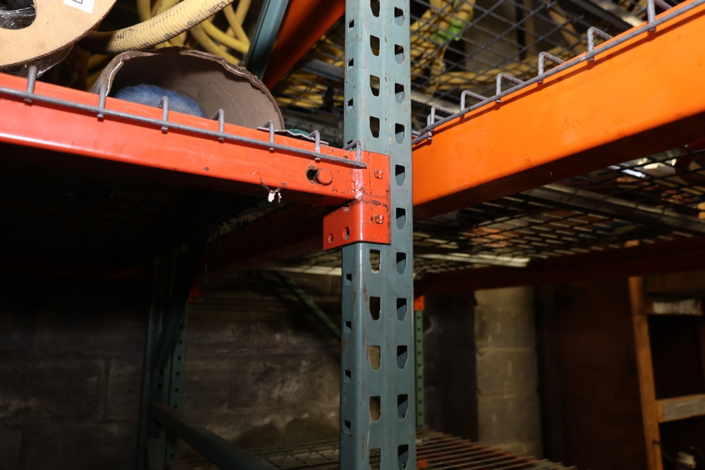 Pallet racks including six uprights and seven shelves. This is not bolted to the floor. Excludes all contents. Please note that some of these uprights and shelves do not work with other units. NOTE - This lot must be picked up on Saturday October 25th at 9AM no exceptions.