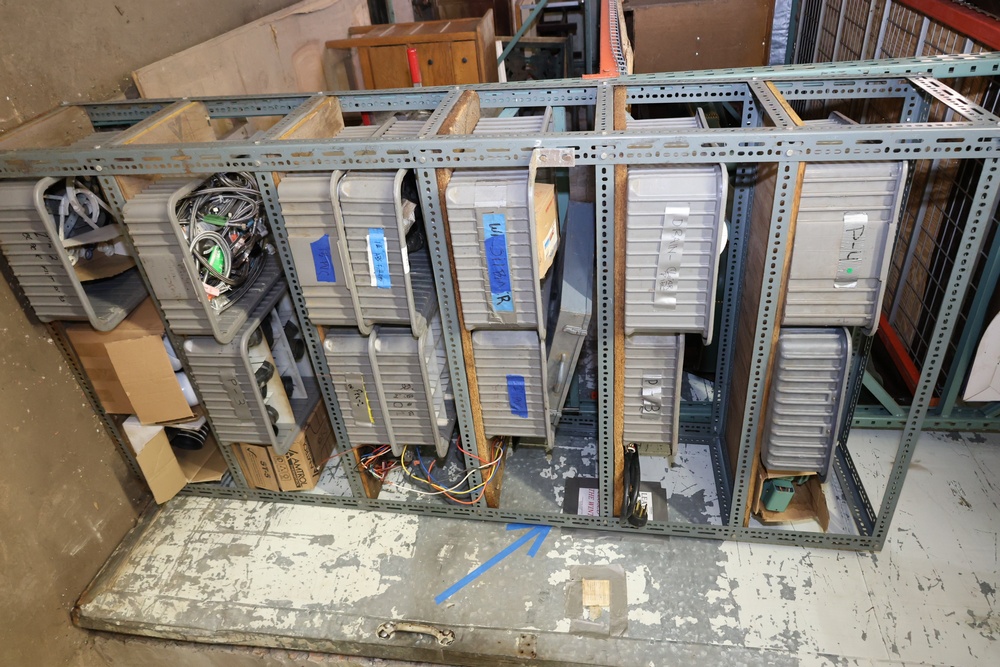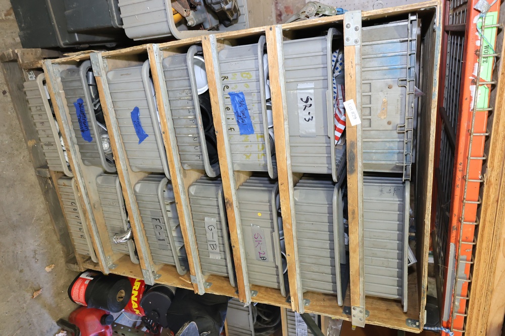 Remaining contents of shelving units in room. Includes assorted tools, hoses, boxes, and equipment stored on the units, empty tool boxes, hardware, tools, etc. Excludes shelving, mowers, tools and equipment in corner (not shown in photos) and other lots. Buyer must take all.