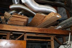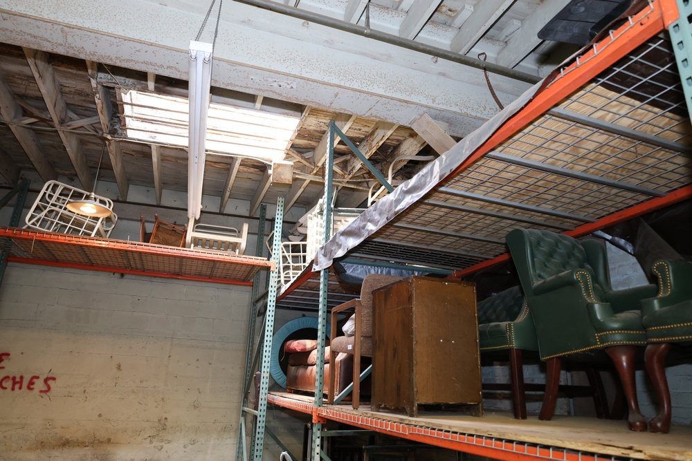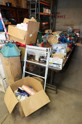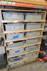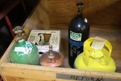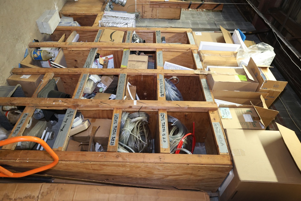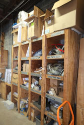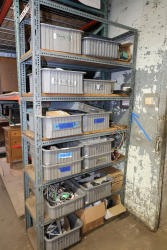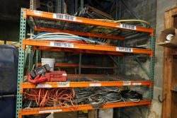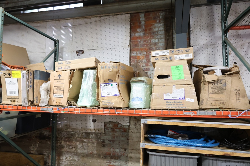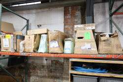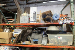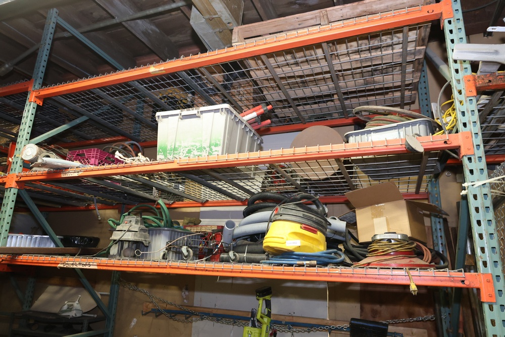 Contents of the shelving units includes vinyl tubing rolls, assorted cleaning chemicals, small tools, air ventilator parts, and miscellaneous hardware. Excludes scaffolding parts. Buyer must take all.