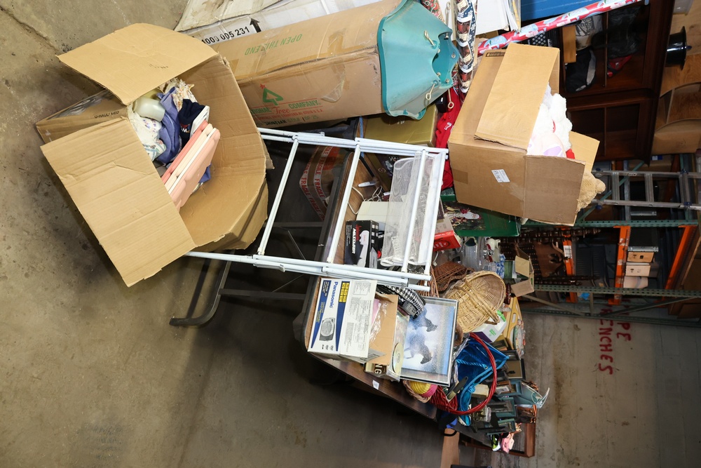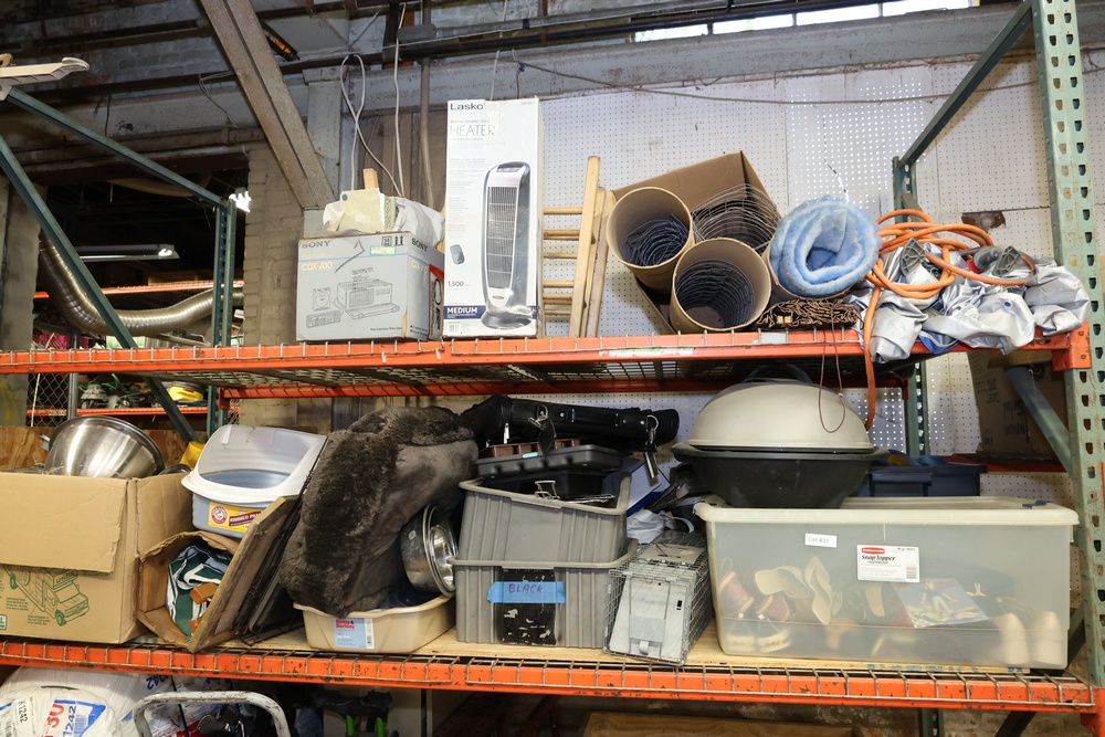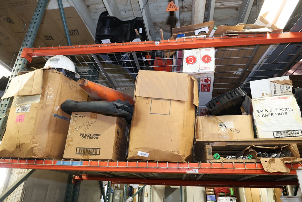 Contents of pallet racks including Igloo beverage cooler, boxes of miscellaneous supplies, shoes, safety equipment, plastic storage bins, rolled materials, a small TV, and more. Shelving units, racks, and cabinets are not included in this offer. Buyer must take all.