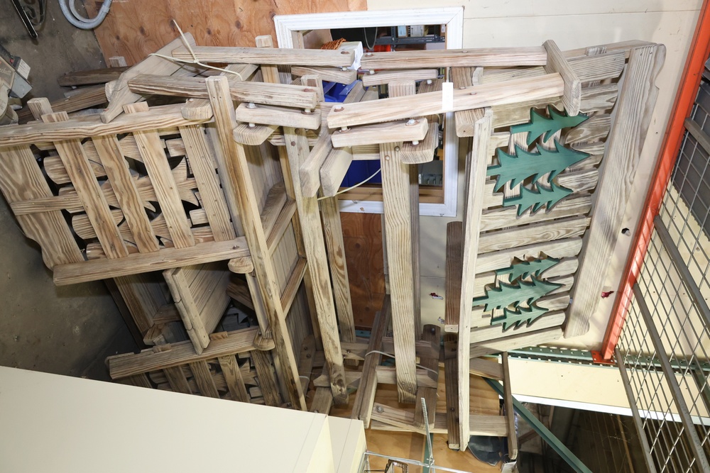 4 Wooden Adirondack Rocking Benches with Tree Design. Each bench features a slatted wooden design with green tree cutout accents on the backrest. Made of durable wood construction and ideal for outdoor seating. Pickup only.