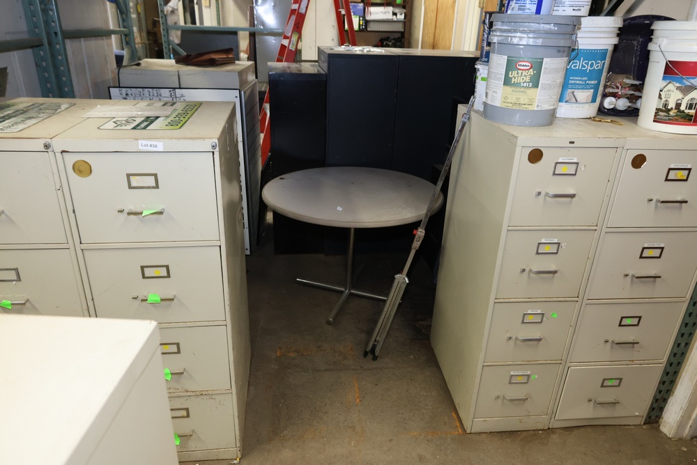 Office Storage Cabinets and Furniture. Includes metal lockers, multiple four-drawer filing cabinets, a round office table with steel base, and miscellaneous shelving. Filing cabinets show signs of use with minor wear and scratches. Buyer must take all.