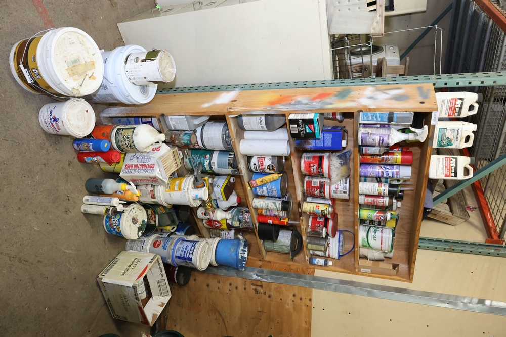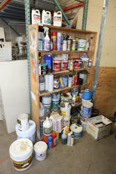 Partially Used Paints, Chemicals, and Supplies Excluding Shelving Unit. Includes a range of pails, cans, bottles, and containers of various paints, sprays, and chemicals. Most items are partially used. Excluded shelving unit. Pickup only.