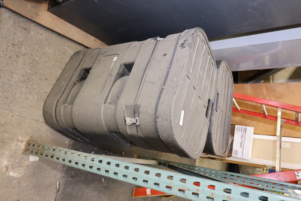 Two Trade Show Signs and Graphics in Hard-Shell Storage Cases. Includes rolled graphic banners, stand components, and related items stored in secure plastic transport containers. Some wear is visible on the storage cases. Pickup only.