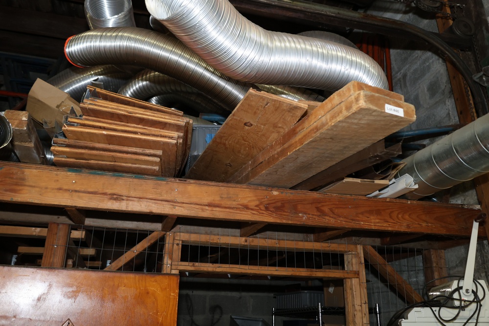 Various construction material including lumber, plywood, concrete, etc. Also includes wood shelves. Buyer must take all.