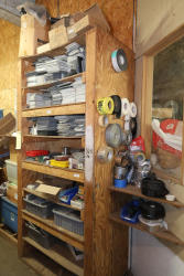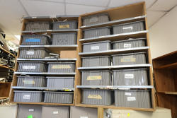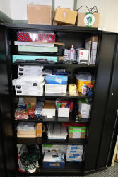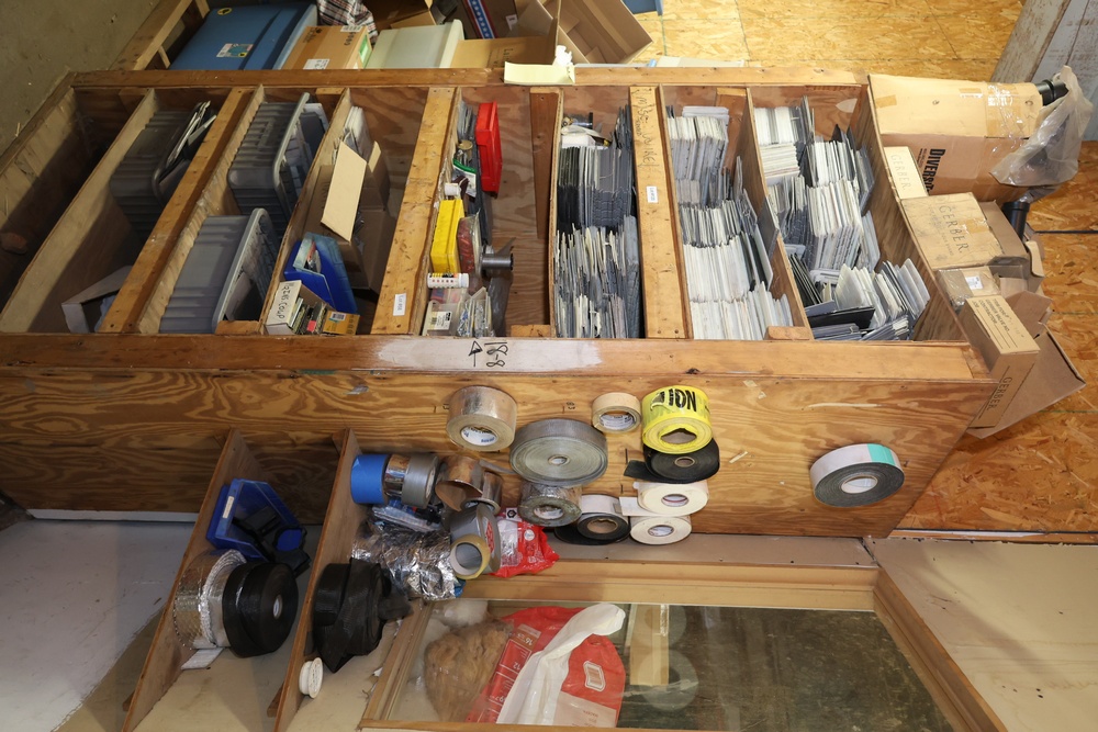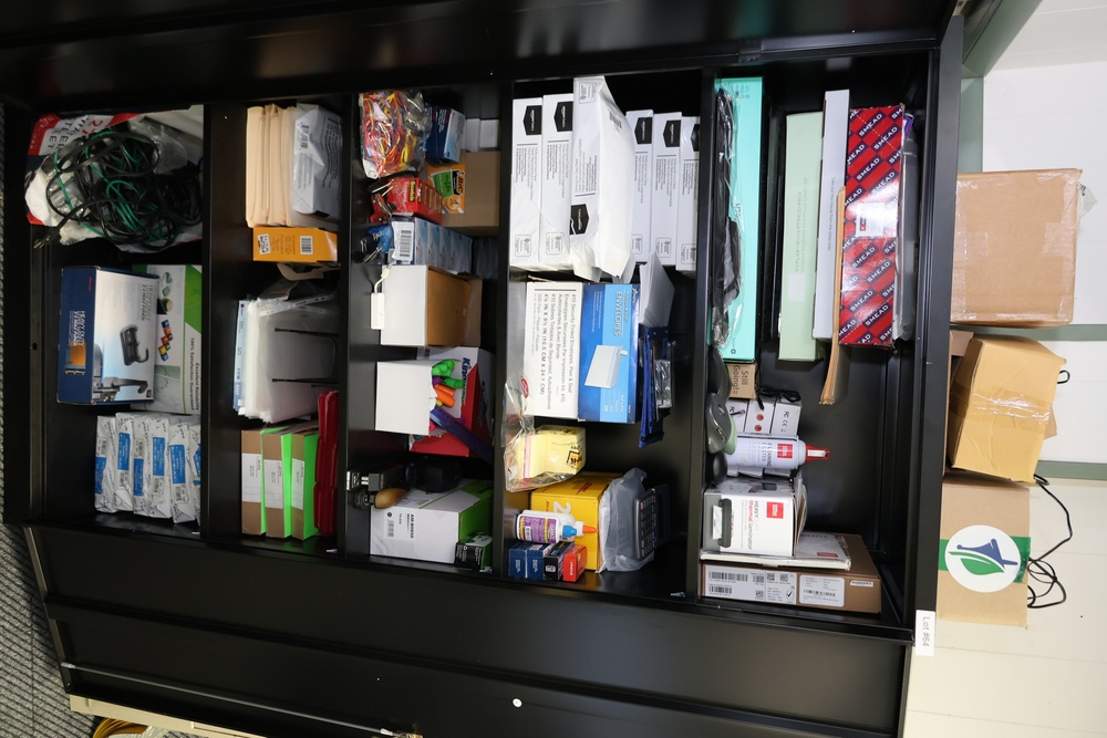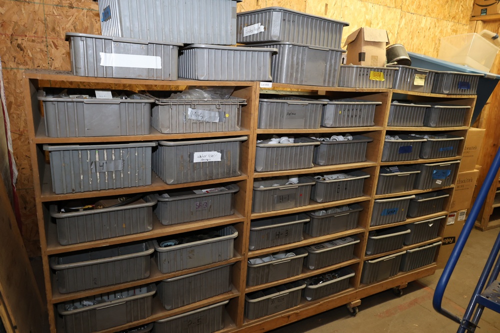 Contents of storage room including metal shelves, wood dividers, contents of storage compartments, metal locker, fittings, hardware, etc. Excludes computers and electronics in storage room. Buyer must take all.
