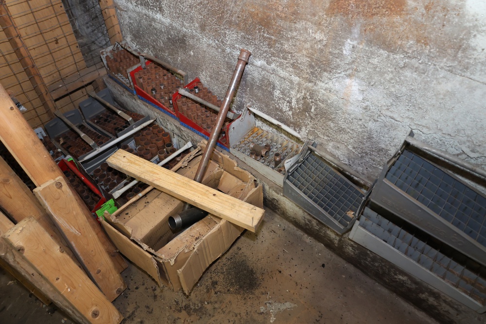 Metal Tubes and Pipes in Storage Racks. Includes multiple racks filled with cylindrical metal tubes in various diameters and lengths, alongside additional loose pipes. Some surfaces display signs of rust. Tools and other support materials are included. Buyer must take all.