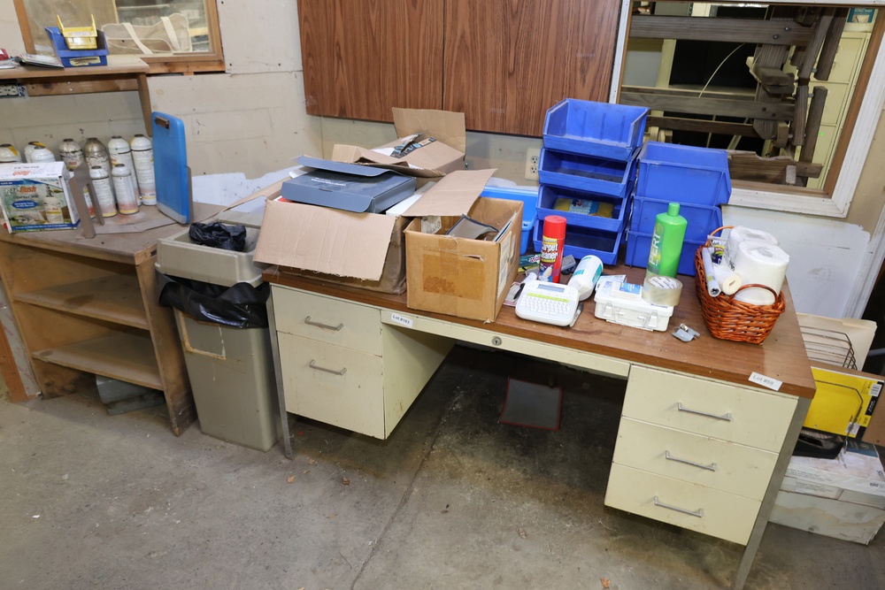 Office Desk, Storage Shelving, Supplies, and Miscellaneous Items. Includes a metal office desk with drawers, storage shelving with multiple shelves, and assorted office supplies, including boxed items, small bins, and cleaning supplies. Items are in various conditions. Buyer must take all.