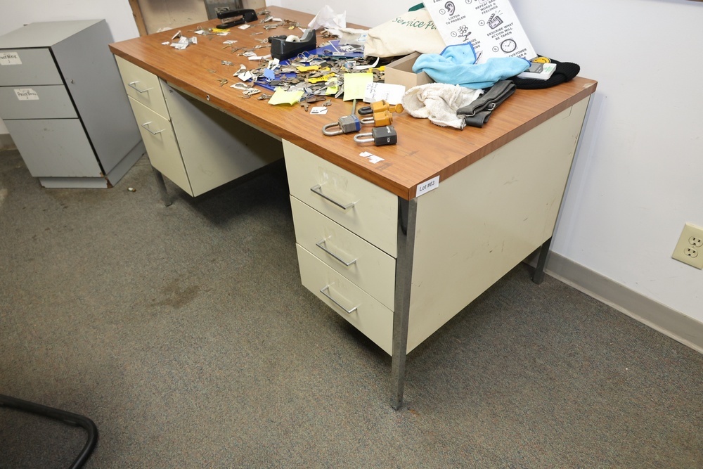 Two metal desks with wood laminate top measuring approximately 60 inches in width. Features four drawers for storage and a separate three-drawer filing cabinet. Desk and cabinet show signs of use, including stains and wear. Buyer must take all.