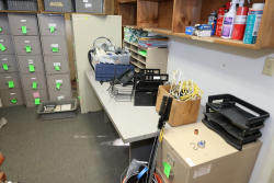 Office supplies and furniture including metal file cabinets, desk, shelving units, wire organizers, phone, assorted brushes, rolls of paper, cables, and other related items. Buyer must take all.