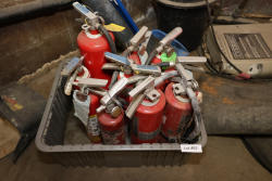Red fire extinguishers in a plastic storage bin. Includes units with hoses, tags, and metal handles. Conditions vary, with some showing visible wear and labels intact. Items have not been tested for function.