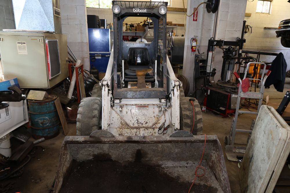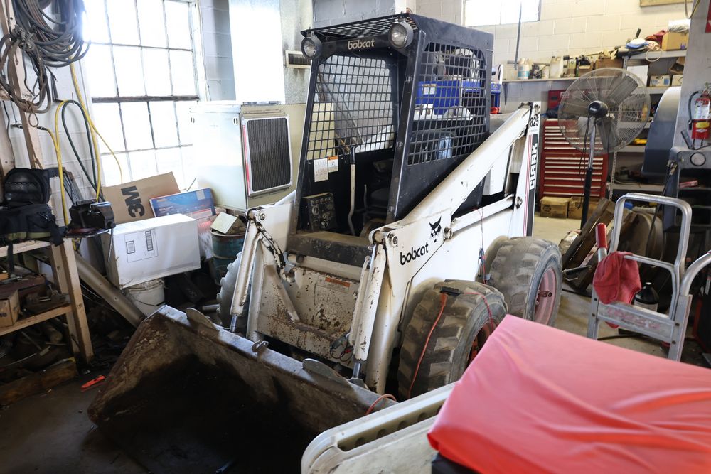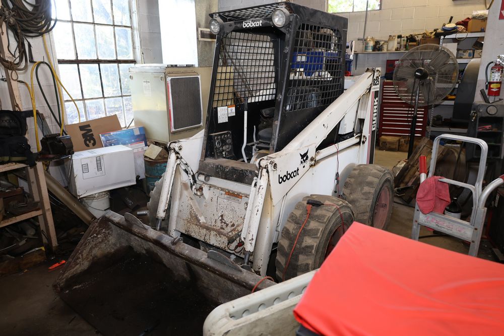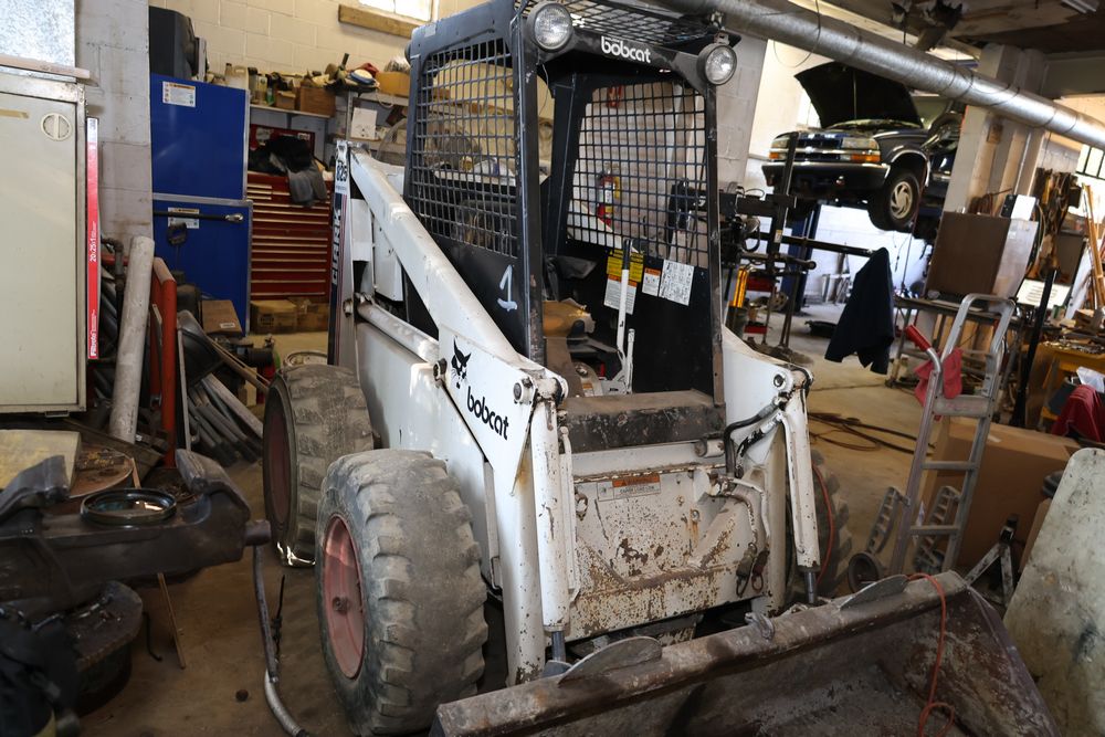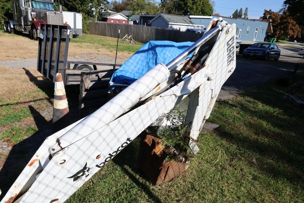 Items include Clark Bobcat Model 825 Hydrostatic Skid Steer Loader, Portable metal-sided office trailer, Conex containers, Micro-Grade Laser System, building materials, tools, tires and more. Items are located in Beacon, NY.