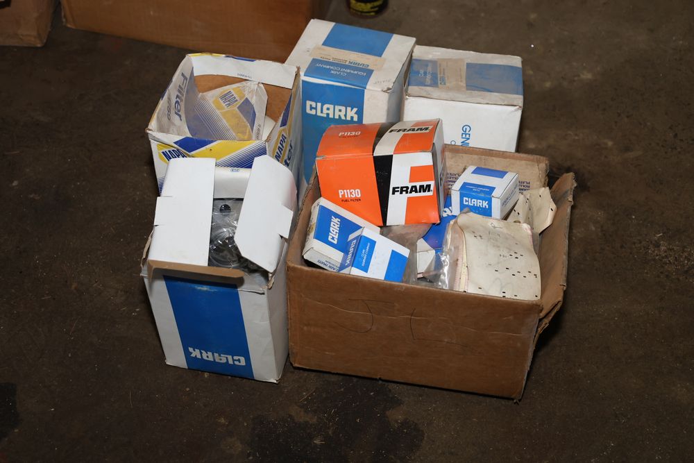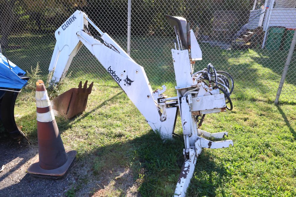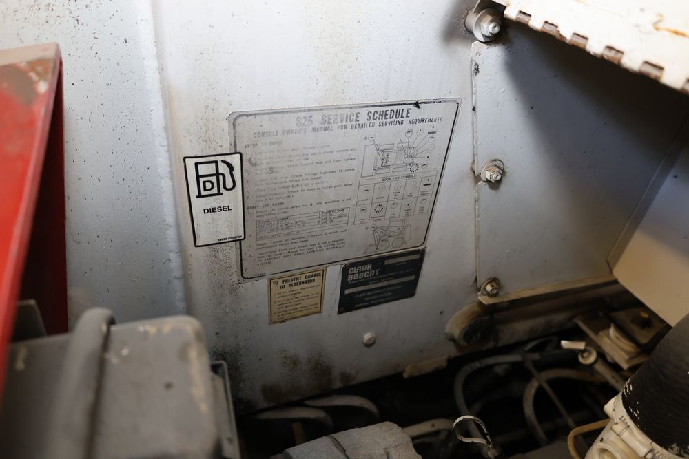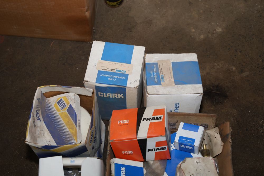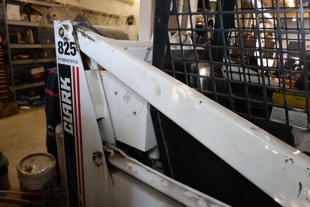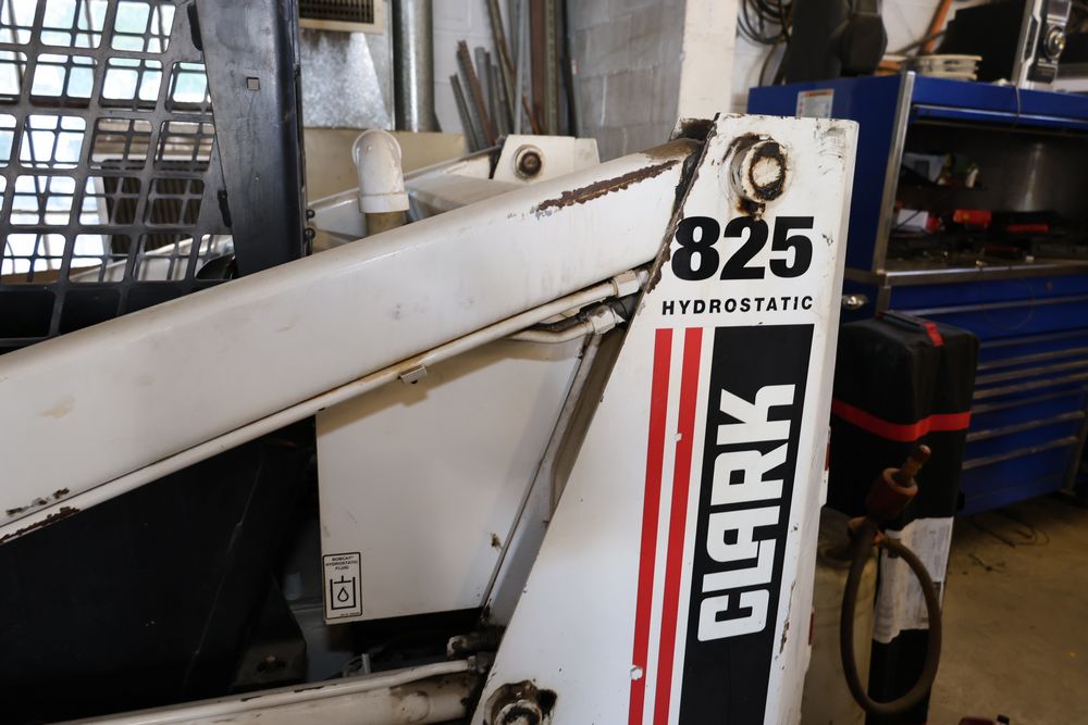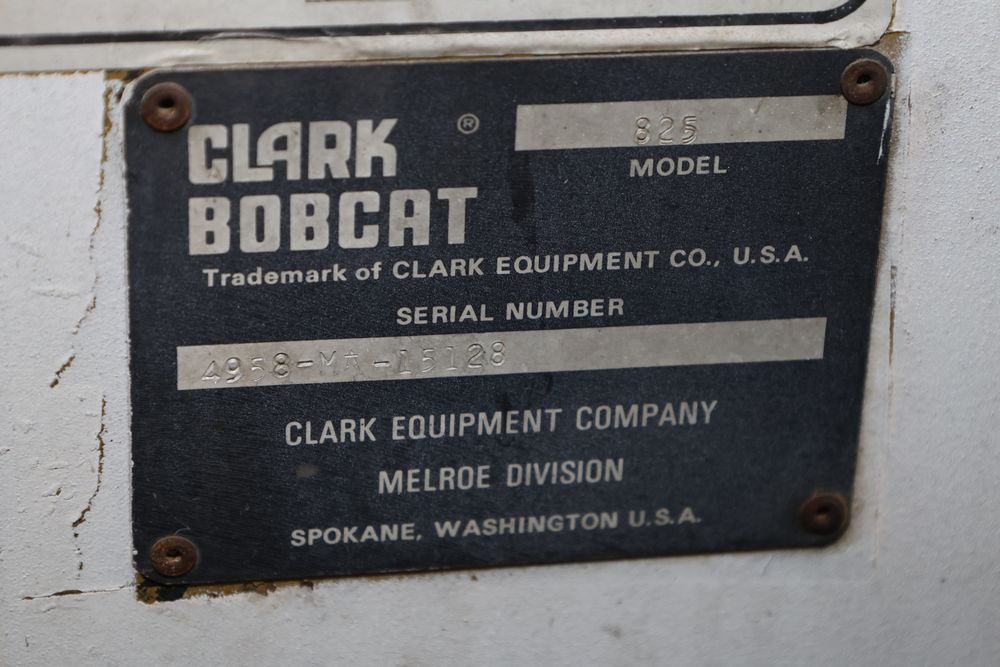 Clark Bobcat Model 825 Hydrostatic Skid Steer Loader. Serial Number: 4958-MA-15128. Unit features an open ROPS operator station, front bucket attachment, and hydraulic controls. Includes assorted attachments and implements shown, including a Bobcat-branded backhoe attachment, additional buckets, mounting frames, and miscellaneous steel components. Lot also contains assorted Clark, Fram, and NAPA boxed filters and small parts as pictured. Runs and operates. Seller reports: backhoe attachment was in working condition when removed, hasn't been used in years.