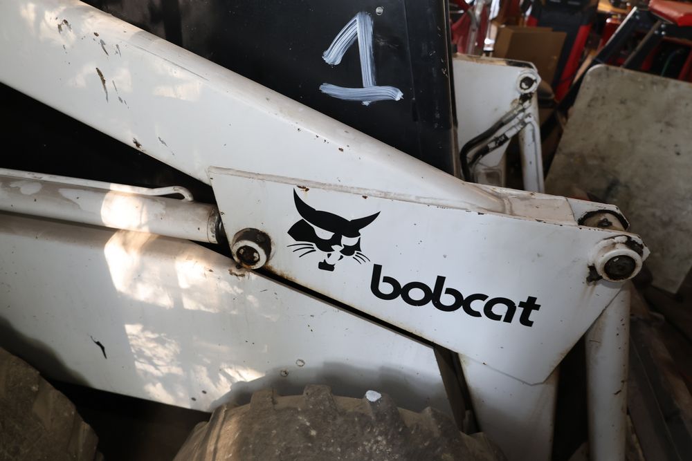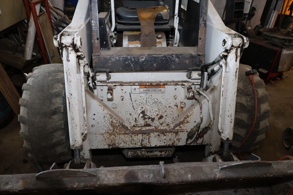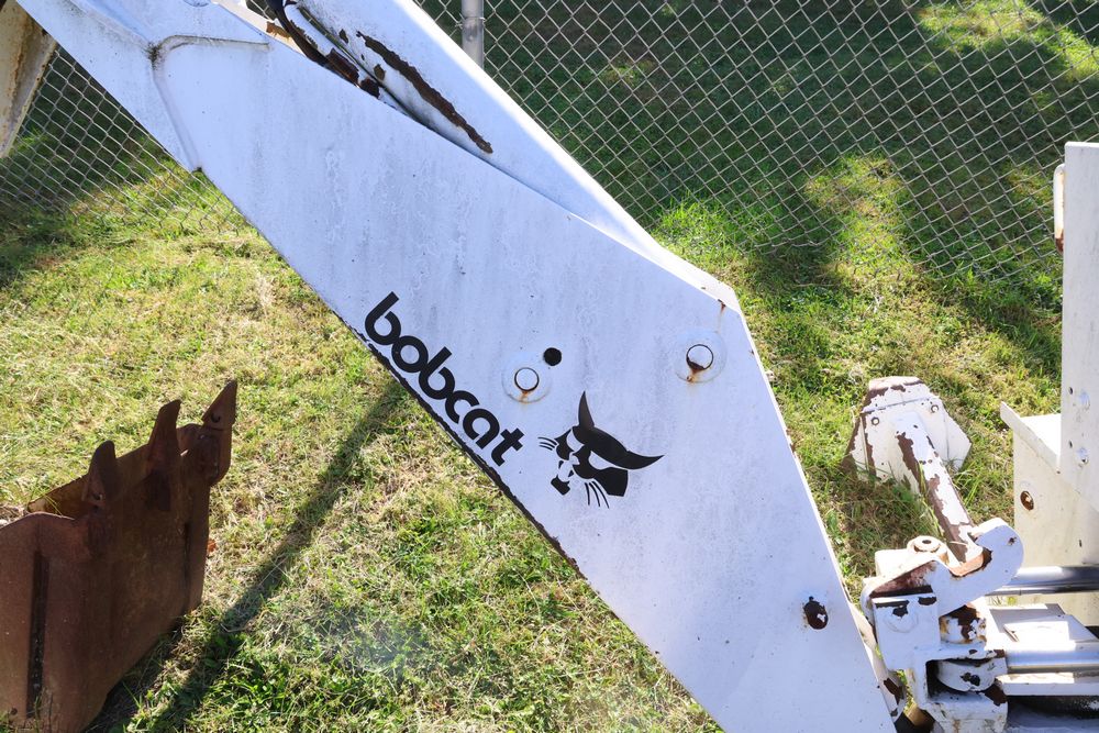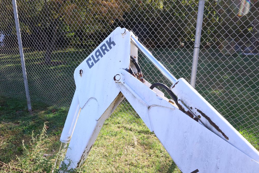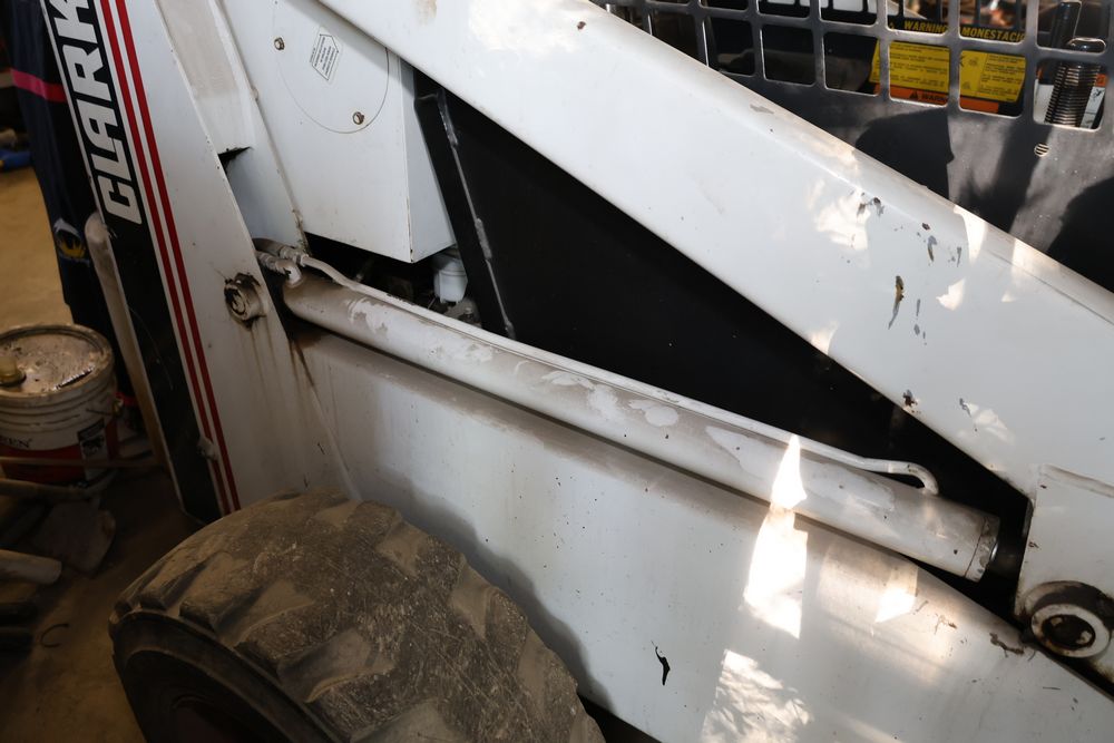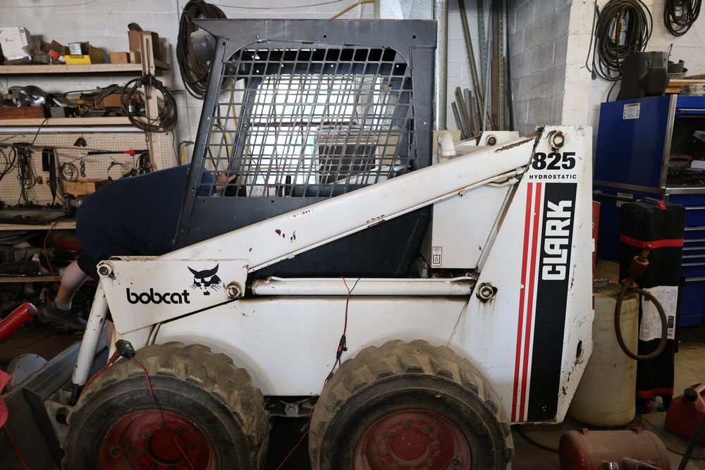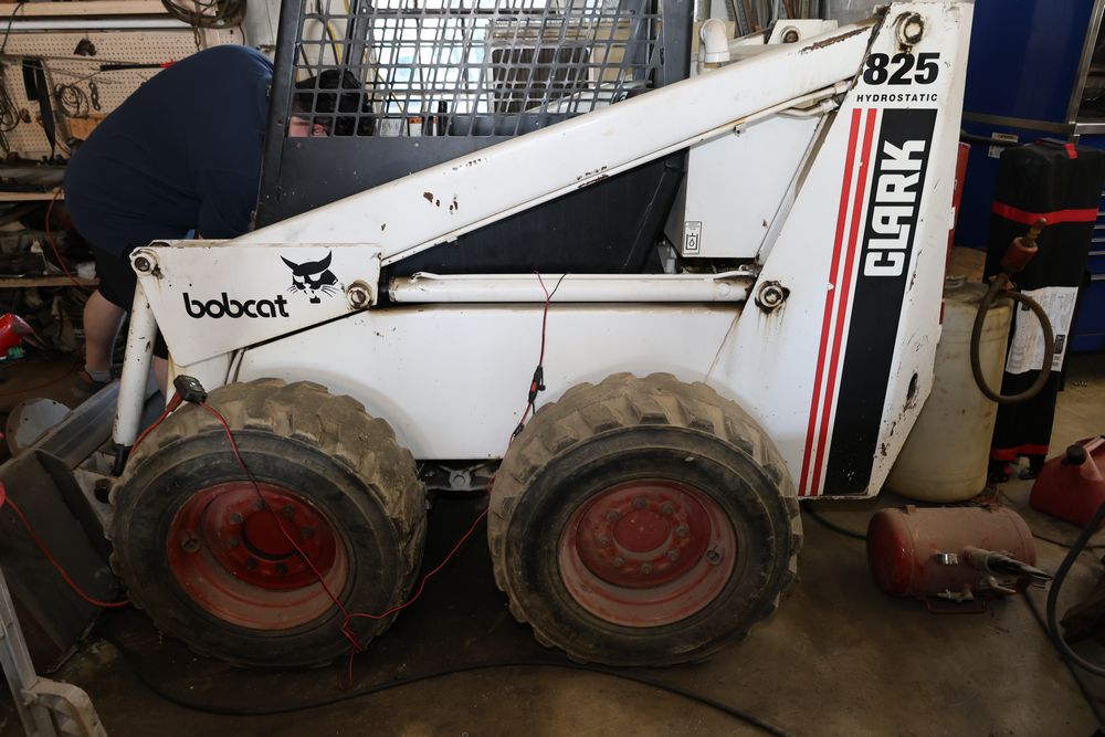 Clark Bobcat Model 825 Hydrostatic Skid Steer Loader. Serial Number: 4958-MA-15128. Unit features an open ROPS operator station, front bucket attachment, and hydraulic controls. Includes assorted attachments and implements shown, including a Bobcat-branded backhoe attachment, additional buckets, mounting frames, and miscellaneous steel components. Lot also contains assorted Clark, Fram, and NAPA boxed filters and small parts as pictured. Runs and operates. Seller reports: backhoe attachment was in working condition when removed, hasn't been used in years.