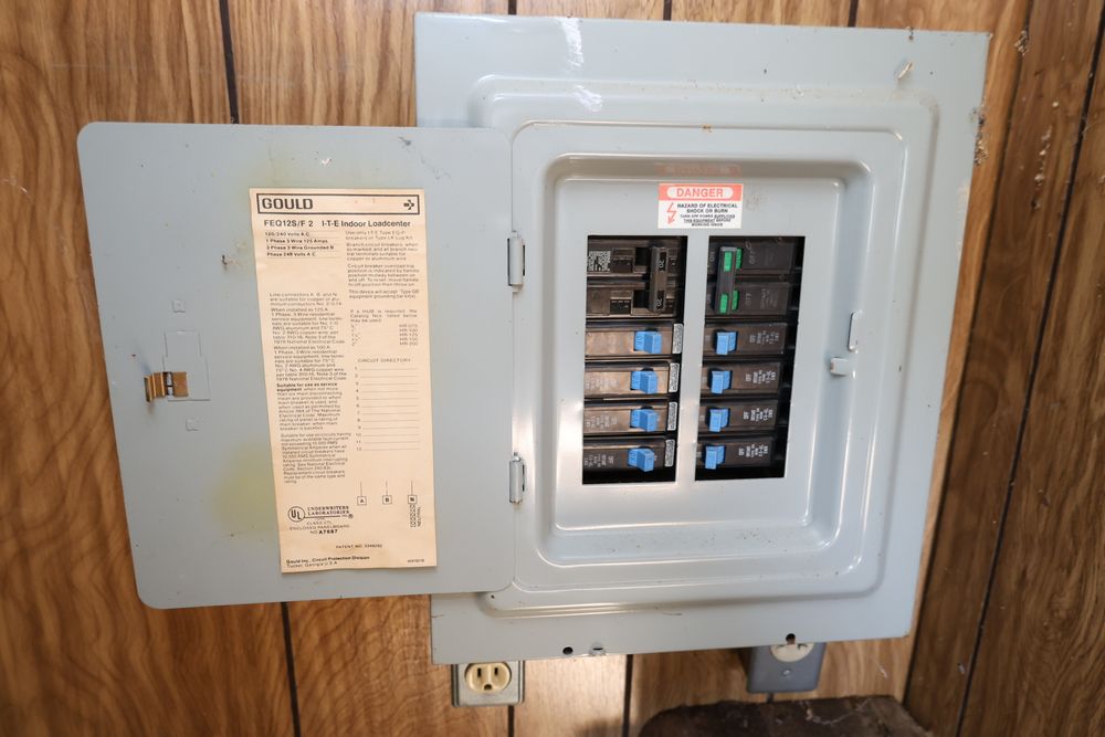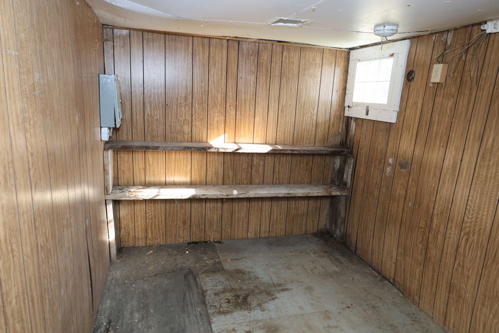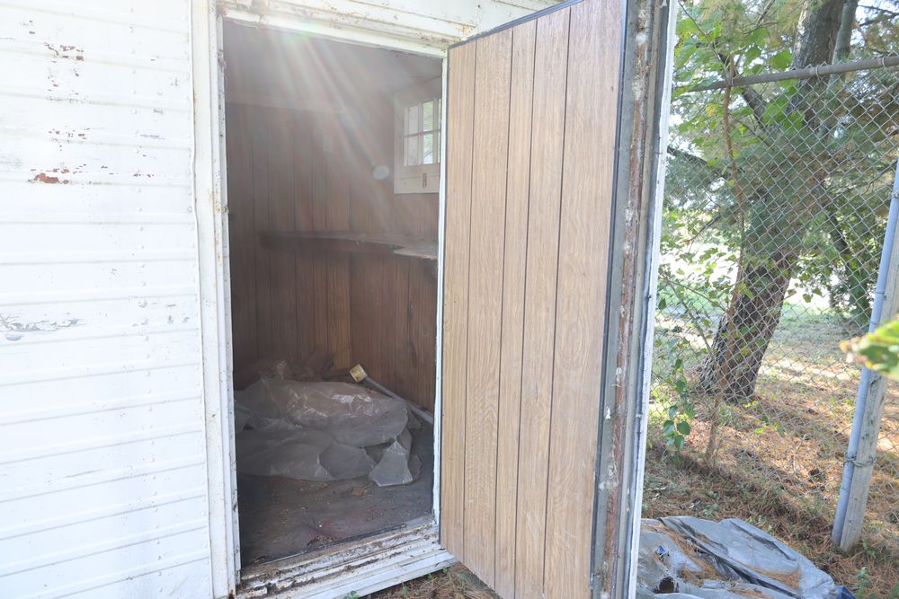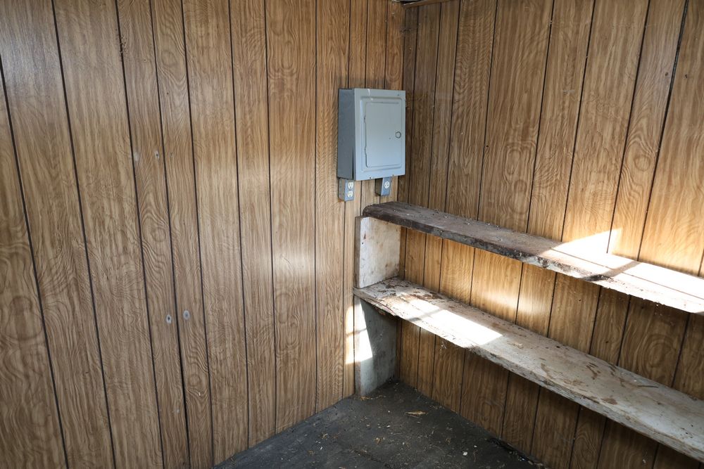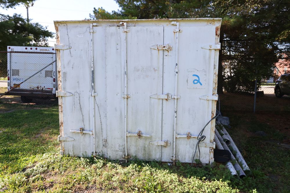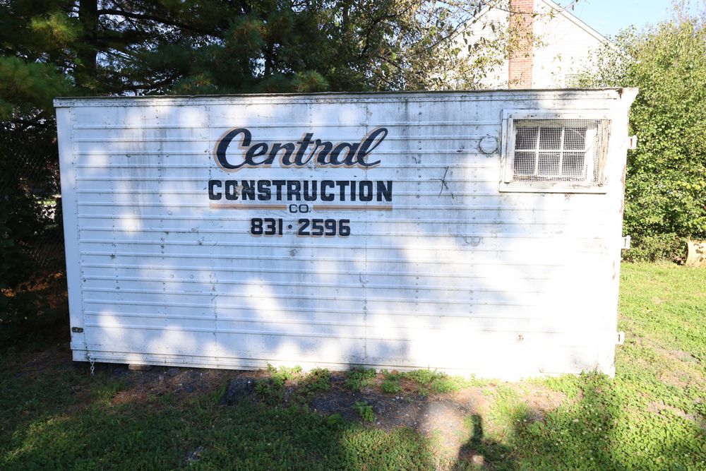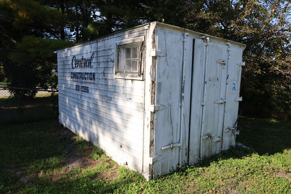 Portable metal-sided office trailer labeled “Central Construction Co.” with single entry door and two small windows. Interior features wood-paneled walls, plywood flooring, and built-in wooden shelving. Equipped with an electrical panel (Gould FEQ1215/F2 Indoor Loadcenter) and standard outlets. Approximate size consistent with small portable jobsite office or storage building. Measuring 172" L x 92" W x 74"T. Pickup only. Buyer responsible for finding third party transport company to load and move, if necessary.