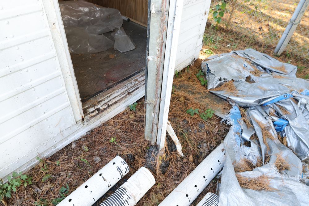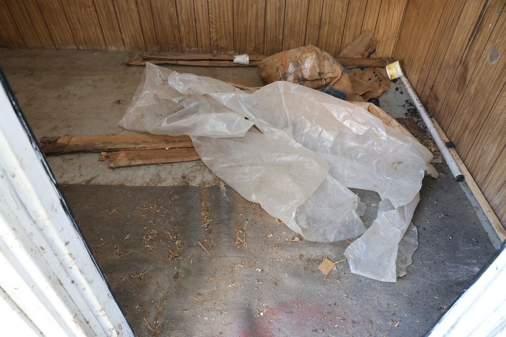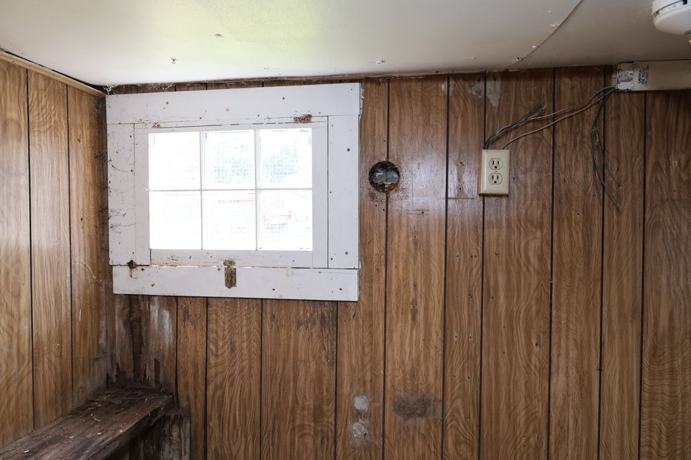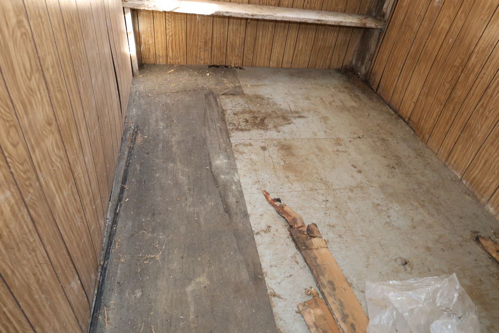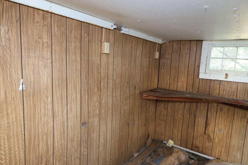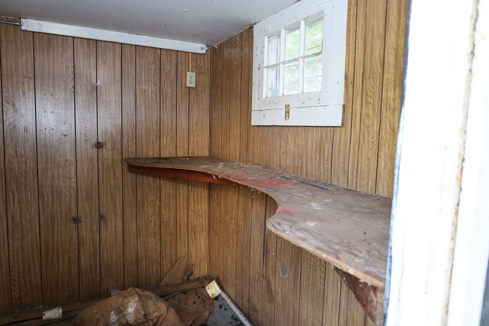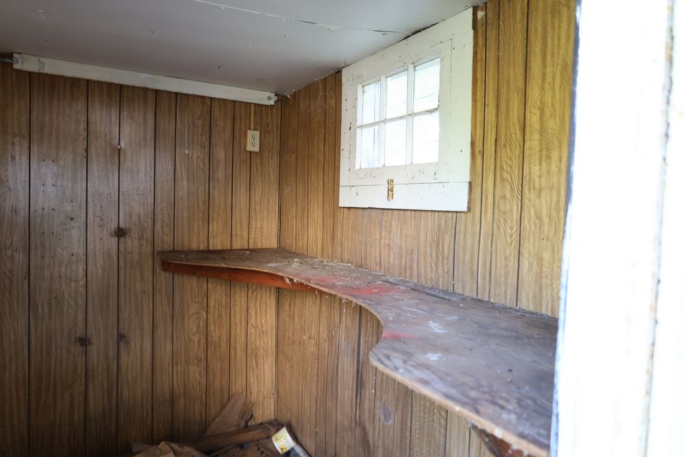 Portable metal-sided office trailer labeled “Central Construction Co.” with single entry door and two small windows. Interior features wood-paneled walls, plywood flooring, and built-in wooden shelving. Equipped with an electrical panel (Gould FEQ1215/F2 Indoor Loadcenter) and standard outlets. Approximate size consistent with small portable jobsite office or storage building. Measuring 172" L x 92" W x 74"T. Pickup only. Buyer responsible for finding third party transport company to load and move, if necessary.