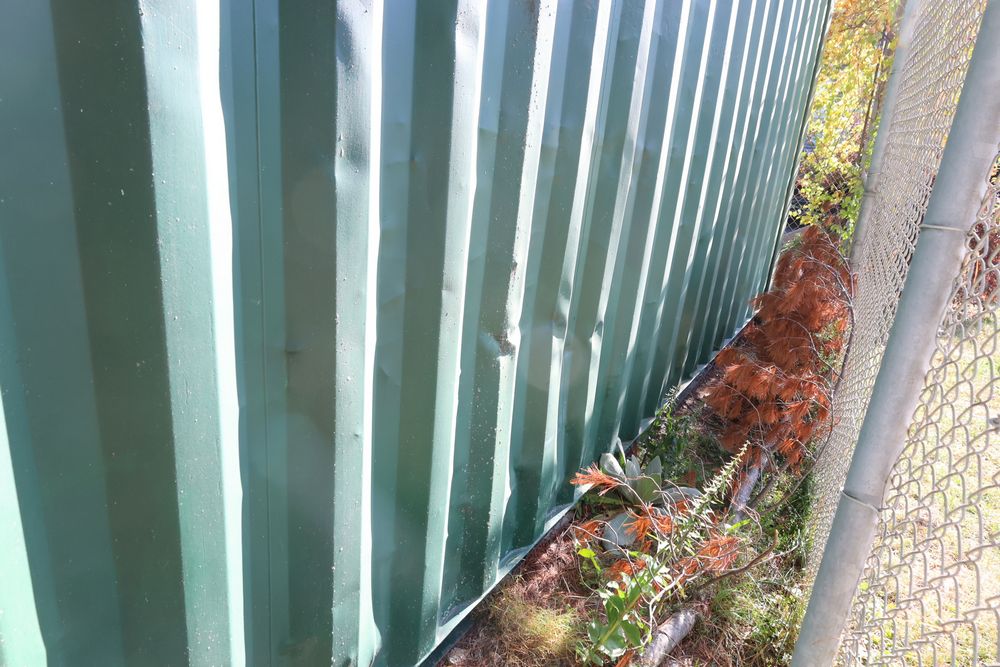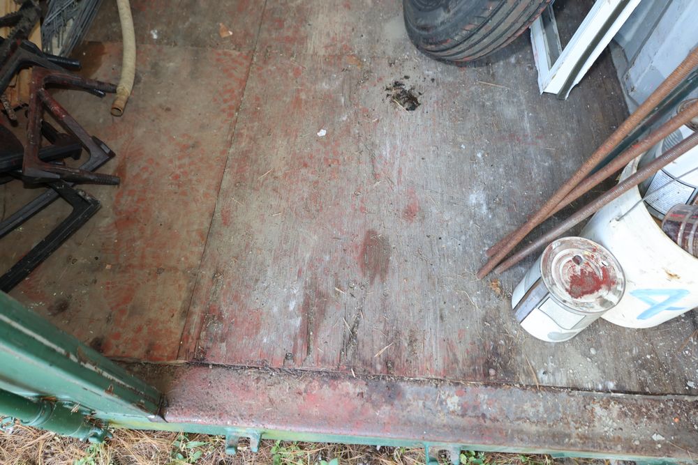 Green Conex container measuring 20'L x 8'W x 102"T. Features exterior and interior visible wear, including dents on the sides and some surface rust. The interior has a wooden floor with signs of use. Pickup only. Buyer responsible for finding third party transport company to load and move, if necessary. Contents not included.