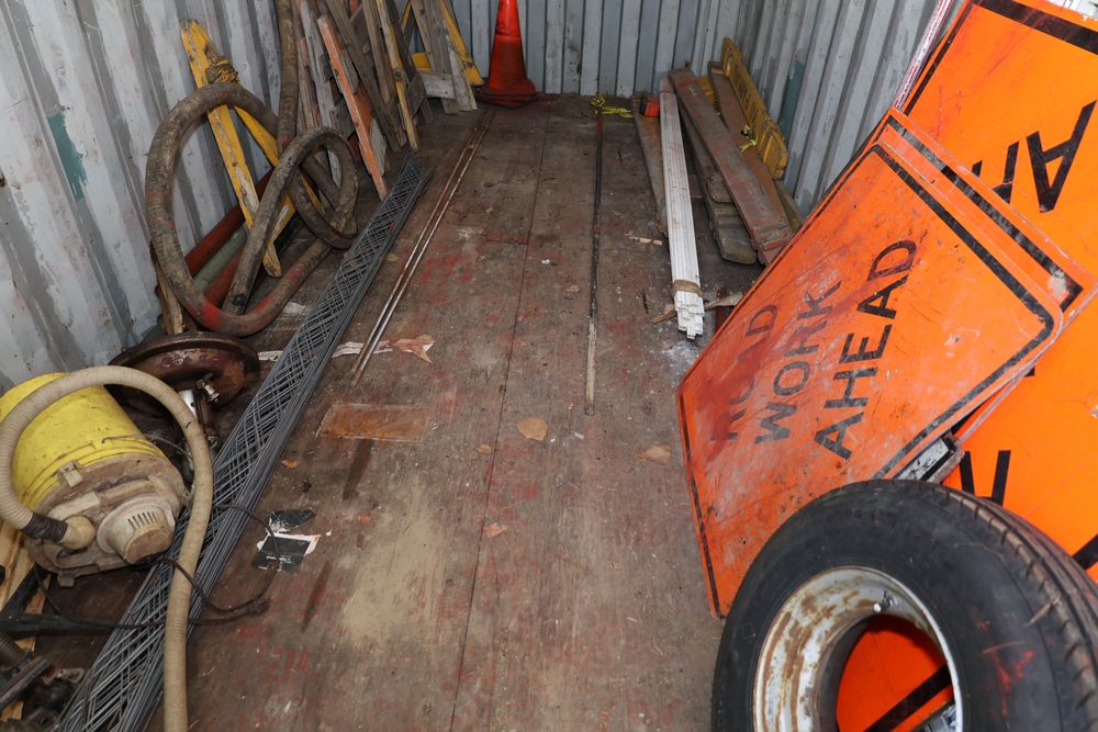 Items include Clark Bobcat Model 825 Hydrostatic Skid Steer Loader, Portable metal-sided office trailer, Conex containers, Micro-Grade Laser System, building materials, tools, tires and more. Items are located in Beacon, NY.