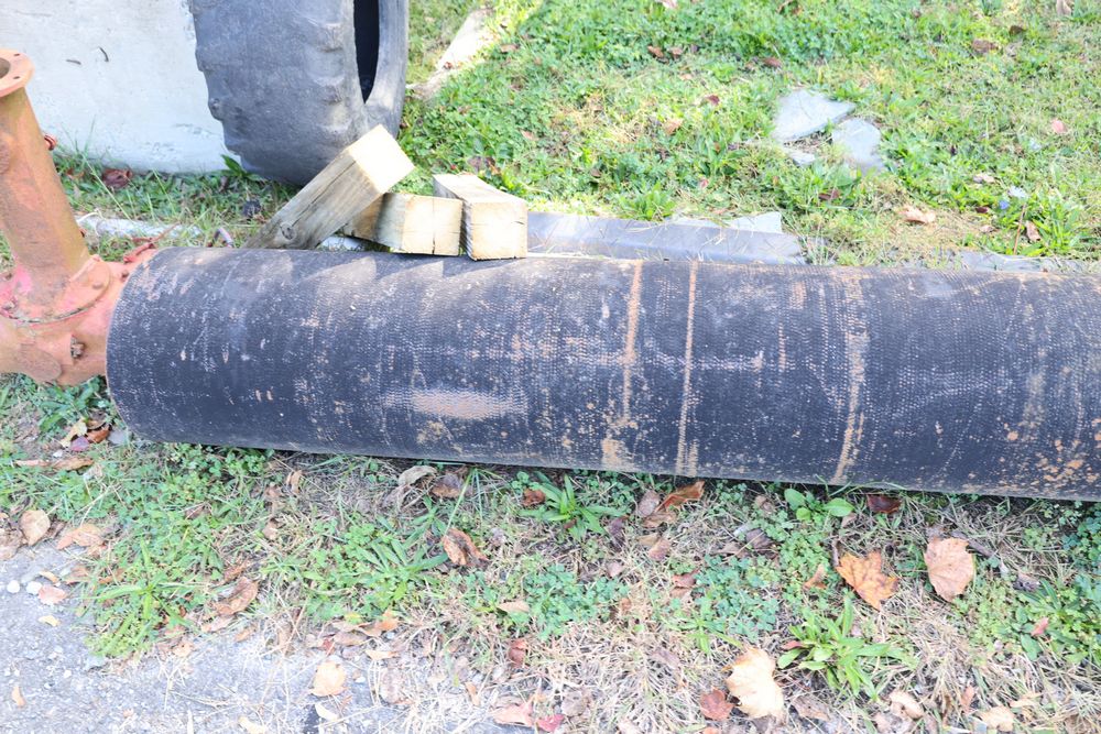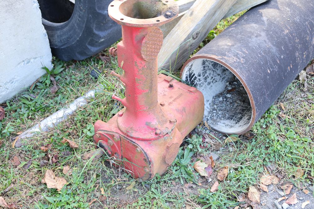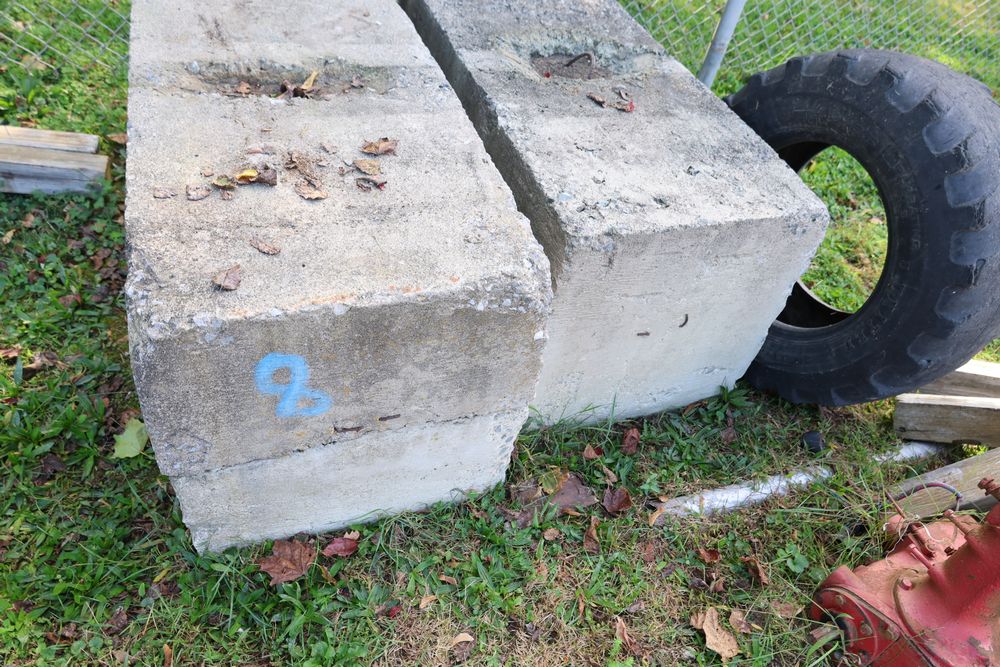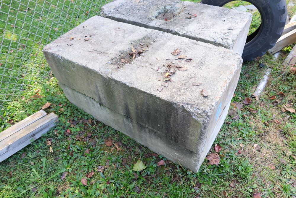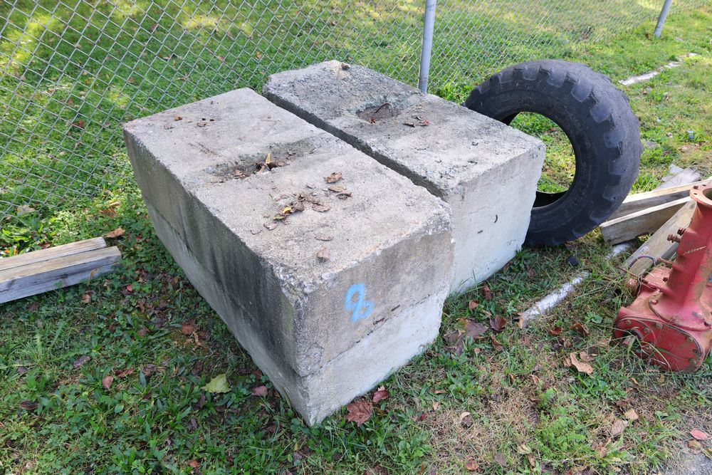 Concrete blocks, pipe, pump, and plow bracket. Pipe measuring 114"L x 14" ID large side x 12" ID small side. Blocks measuring 4'L x 22"W x 2'T. Items include various metal components, drums, and additional items identifiable in the photos. Buyer must take all. Pickup only. Buyer responsible for finding third party transport company to load and move, if necessary.