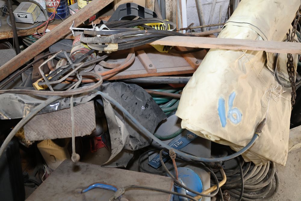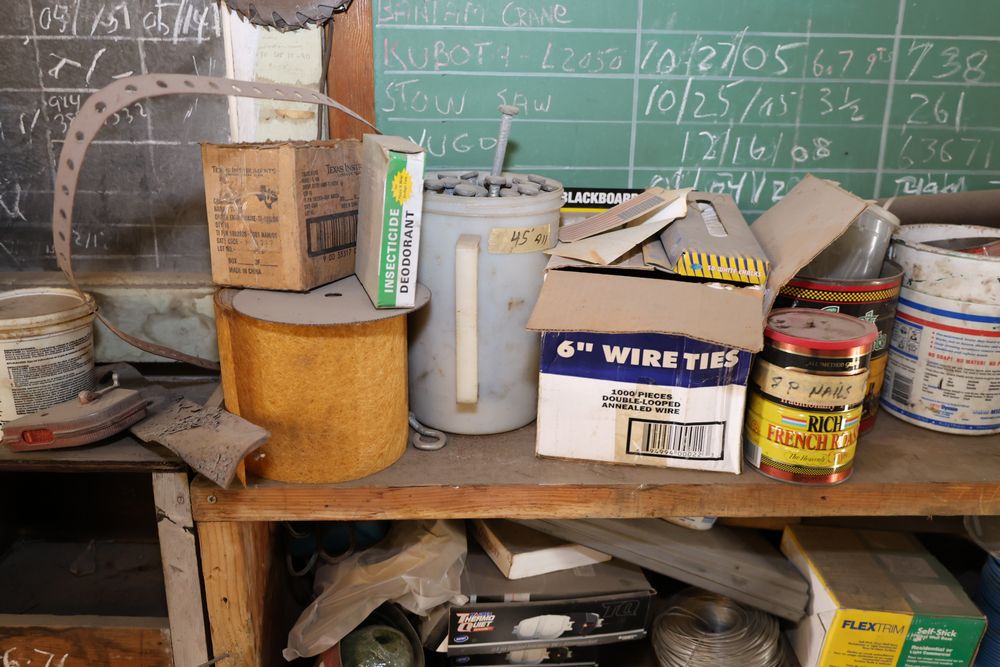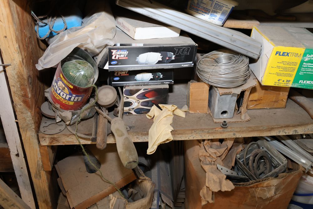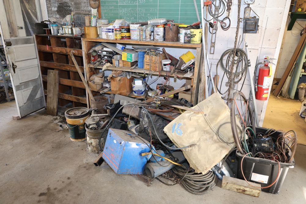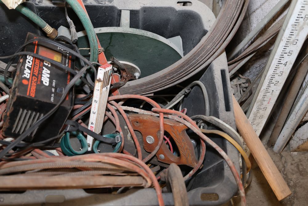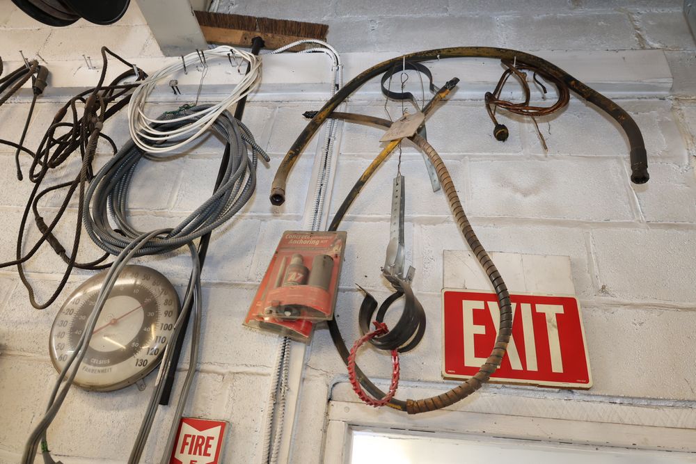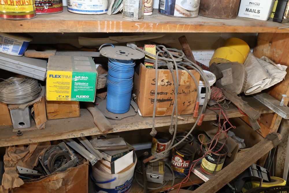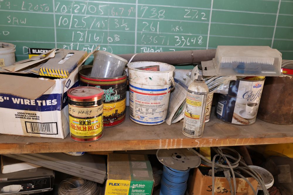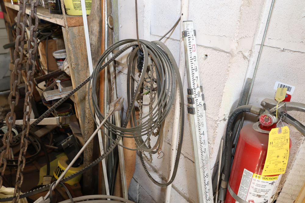 Contents of wall including pipe snake, hoses, chains, HDX tough tote, cables, saw blades, and more. Various tools, hardware items, and materials are present on the shelving and surrounding area in the space. Does not include the shelves and blackboards. Buyer must take all. Pickup only.