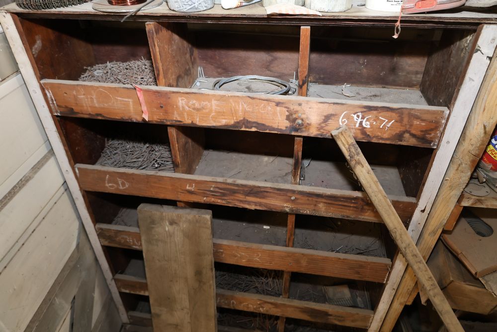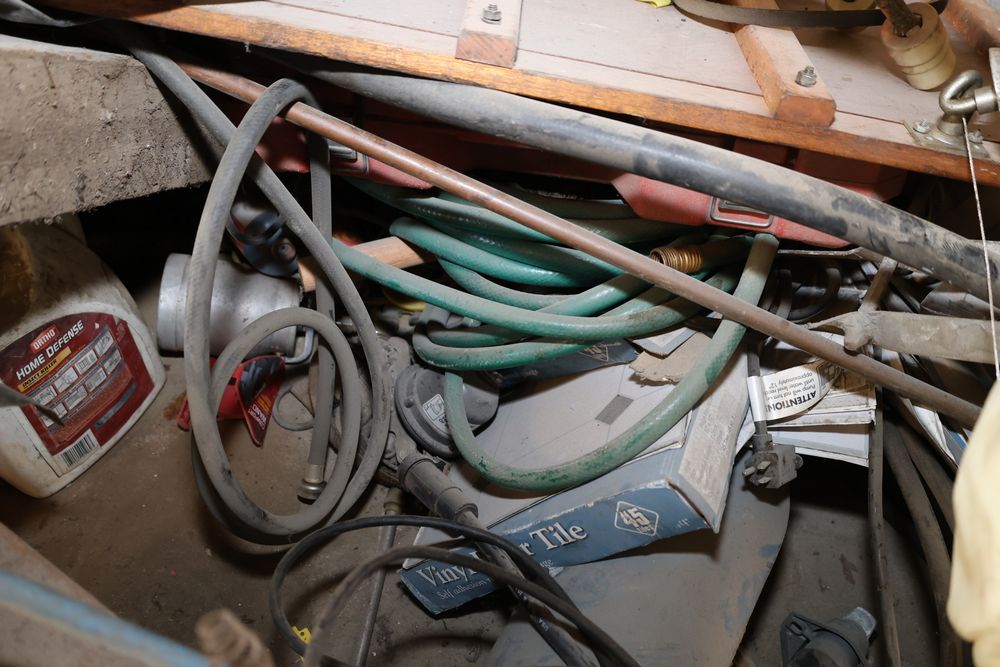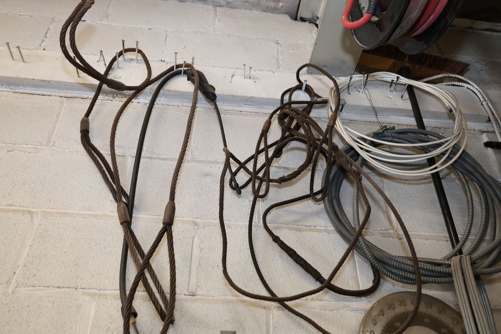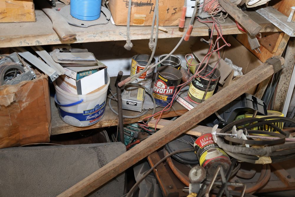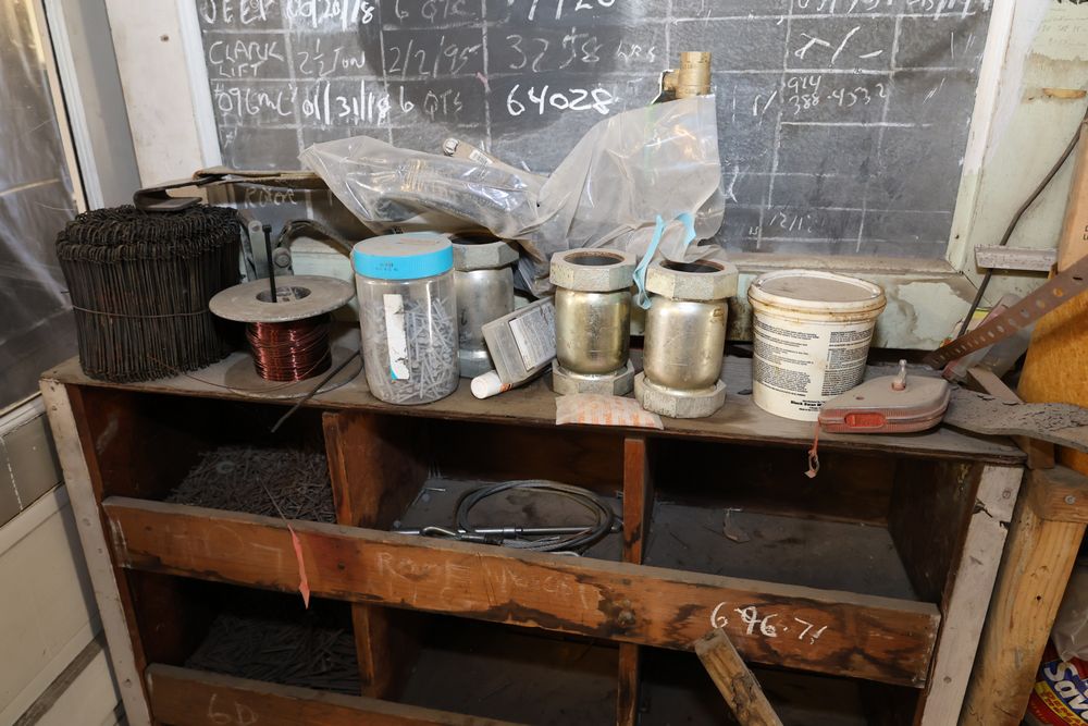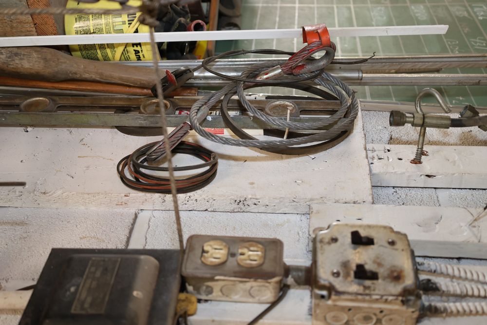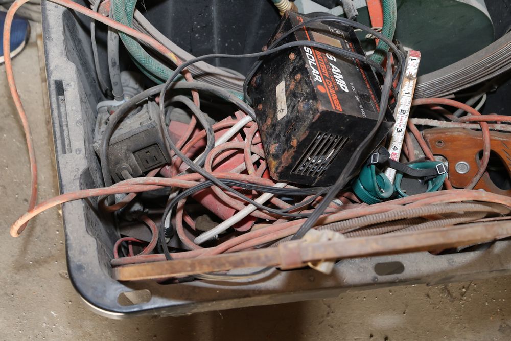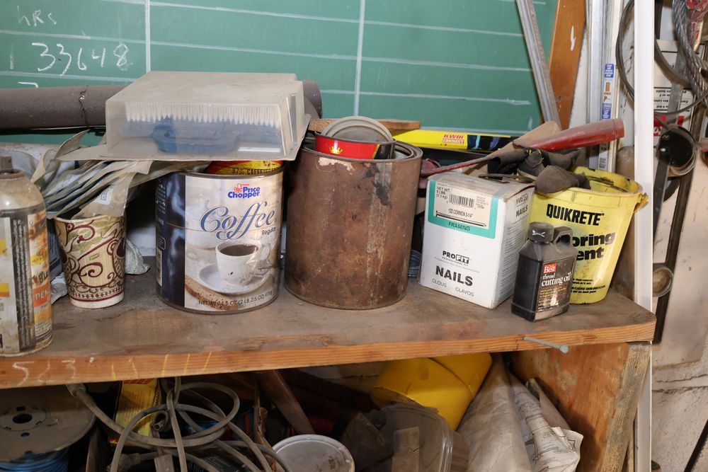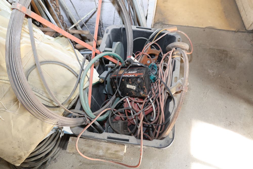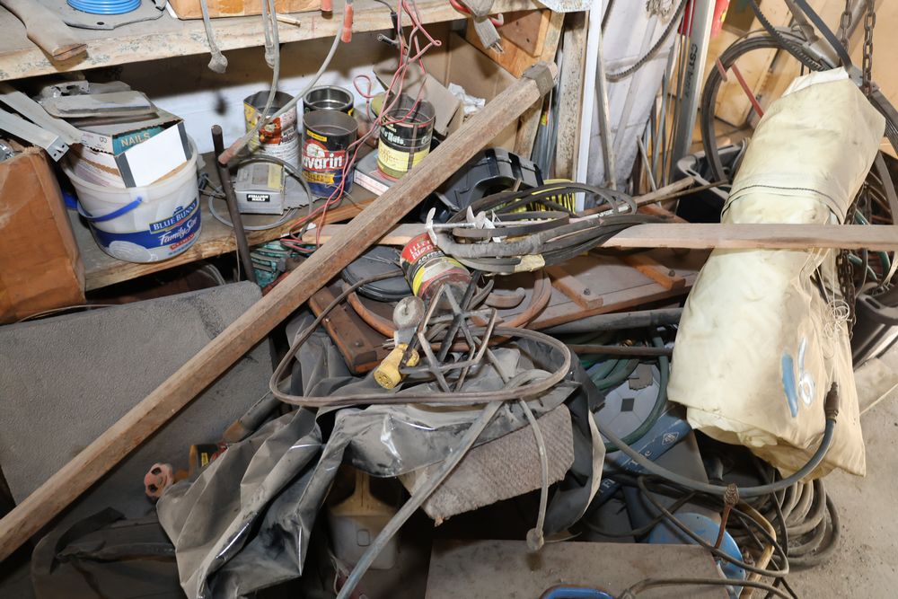 Contents of wall including pipe snake, hoses, chains, HDX tough tote, cables, saw blades, and more. Various tools, hardware items, and materials are present on the shelving and surrounding area in the space. Does not include the shelves and blackboards. Buyer must take all. Pickup only.