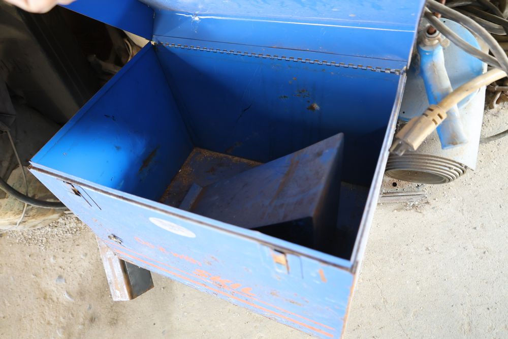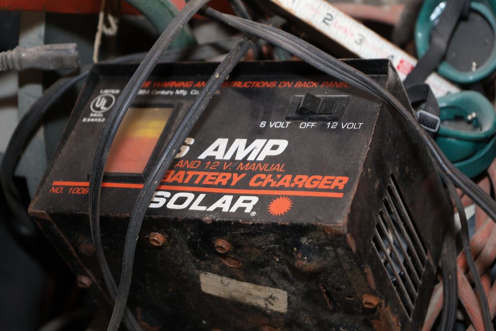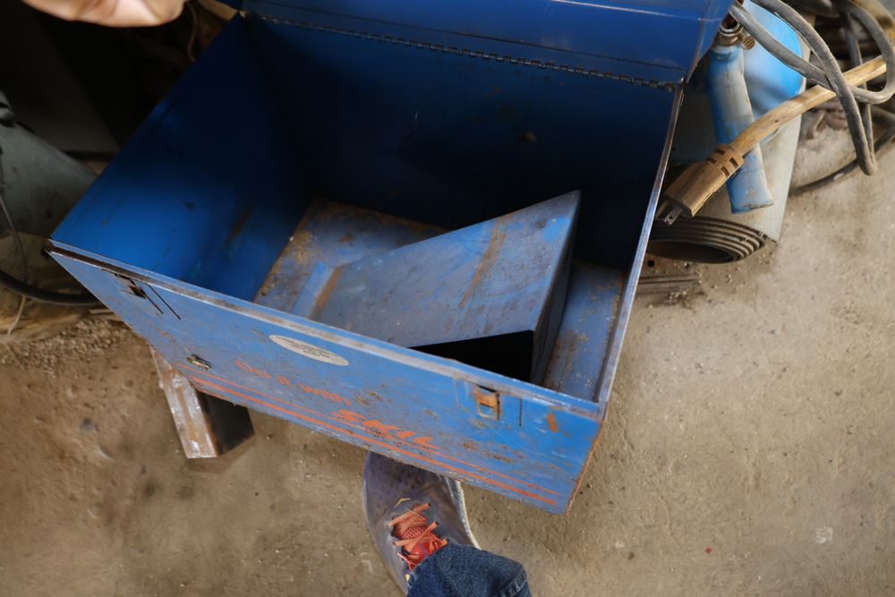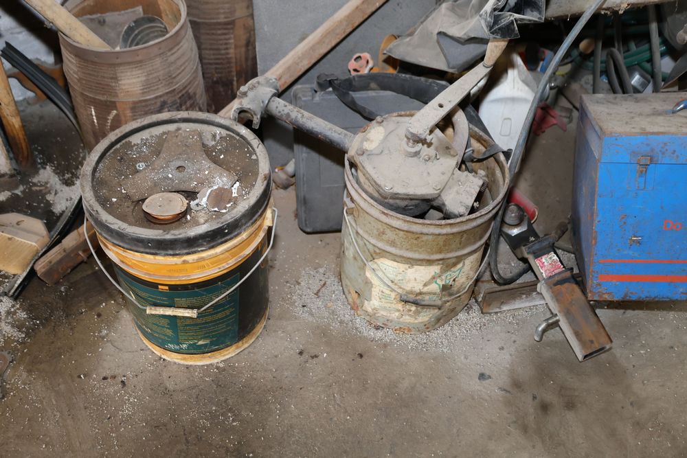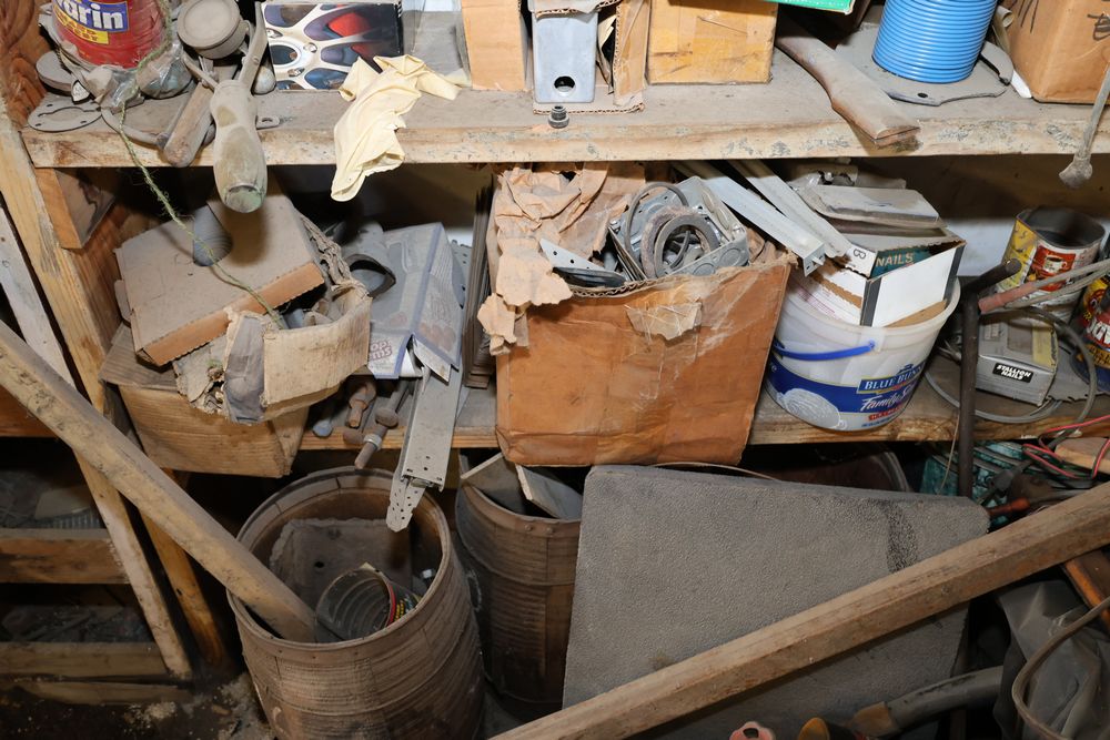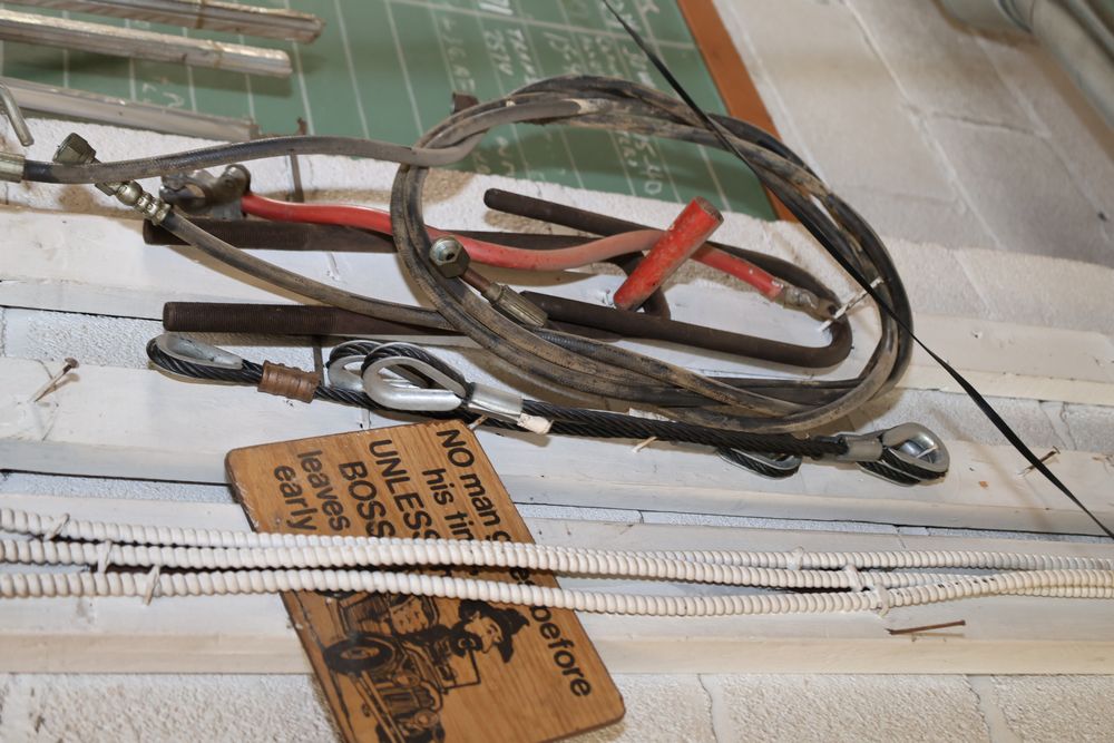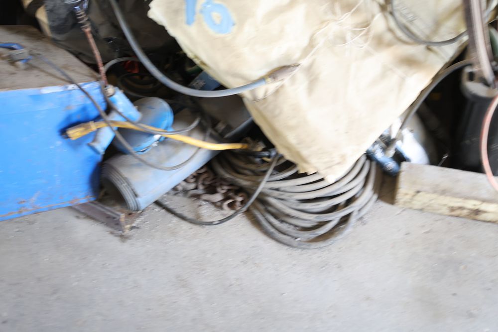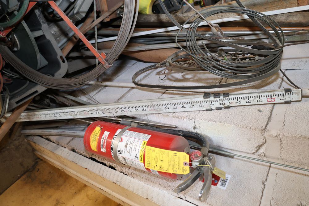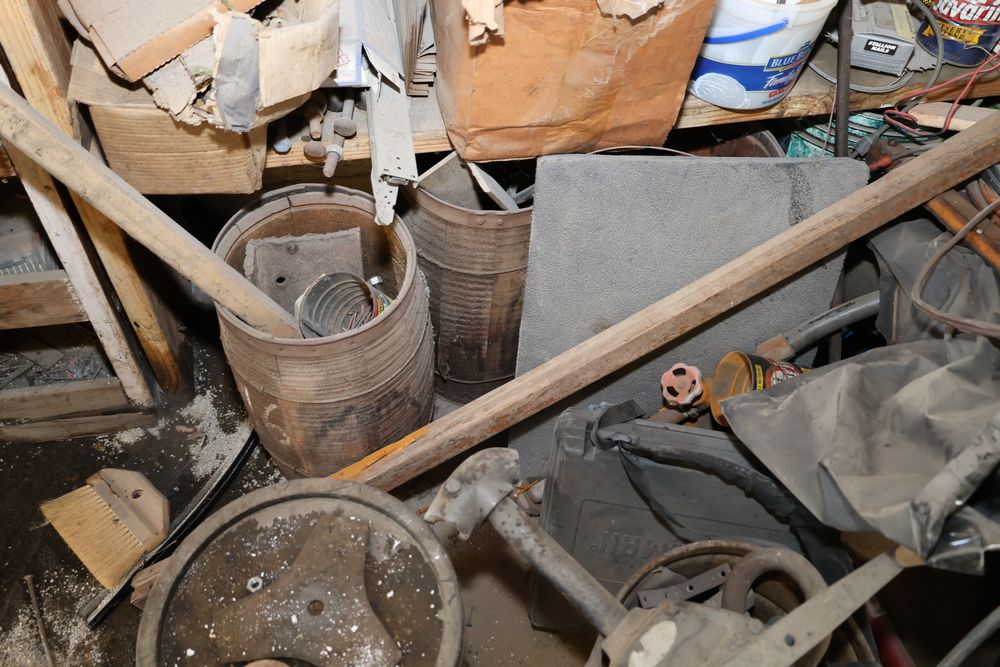 Contents of wall including pipe snake, hoses, chains, HDX tough tote, cables, saw blades, and more. Various tools, hardware items, and materials are present on the shelving and surrounding area in the space. Does not include the shelves and blackboards. Buyer must take all. Pickup only.