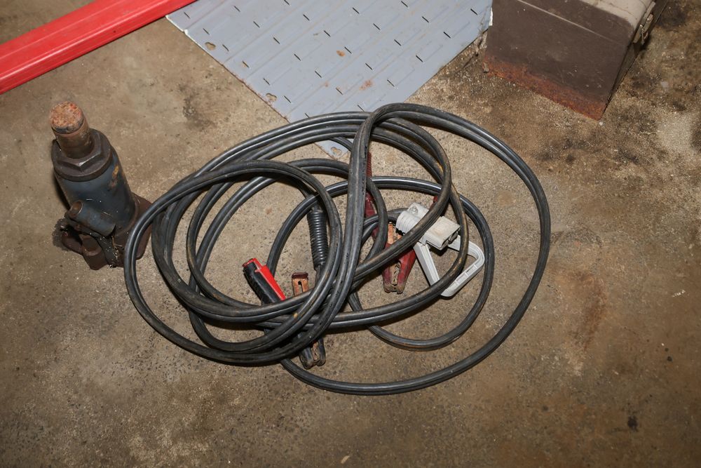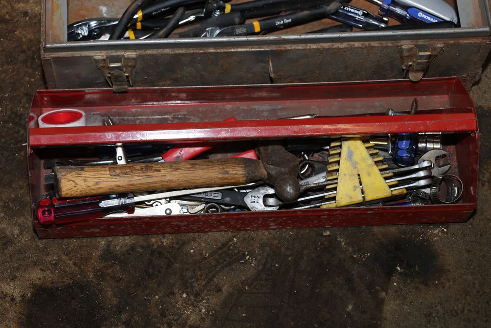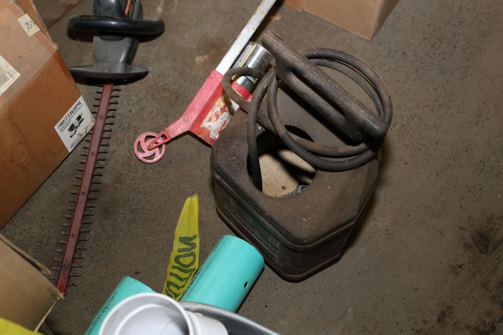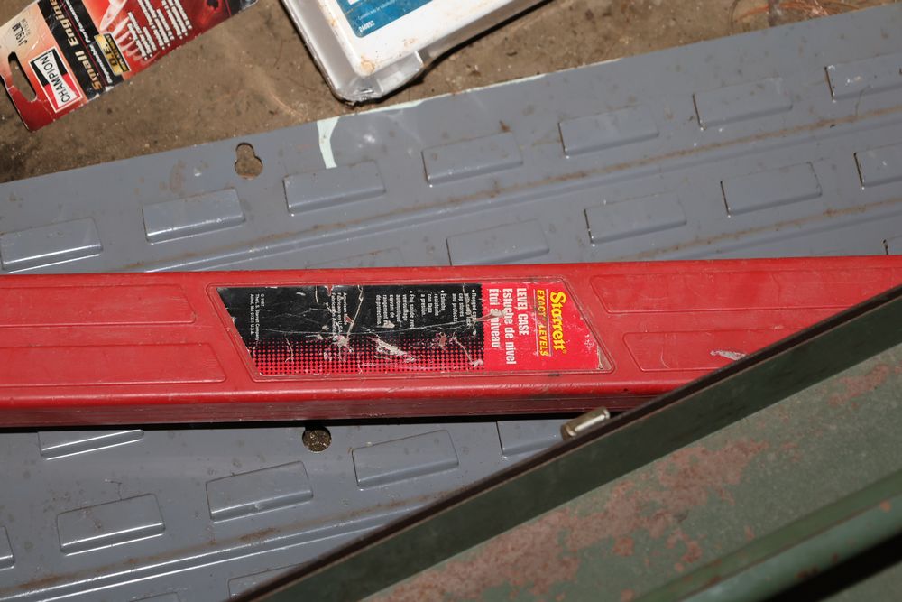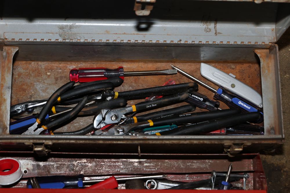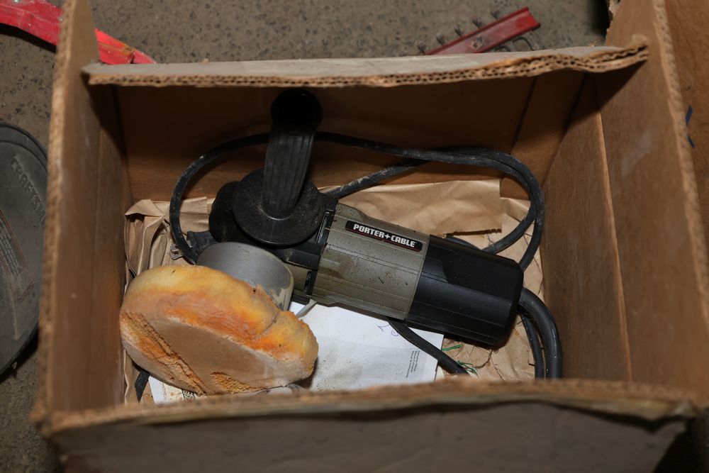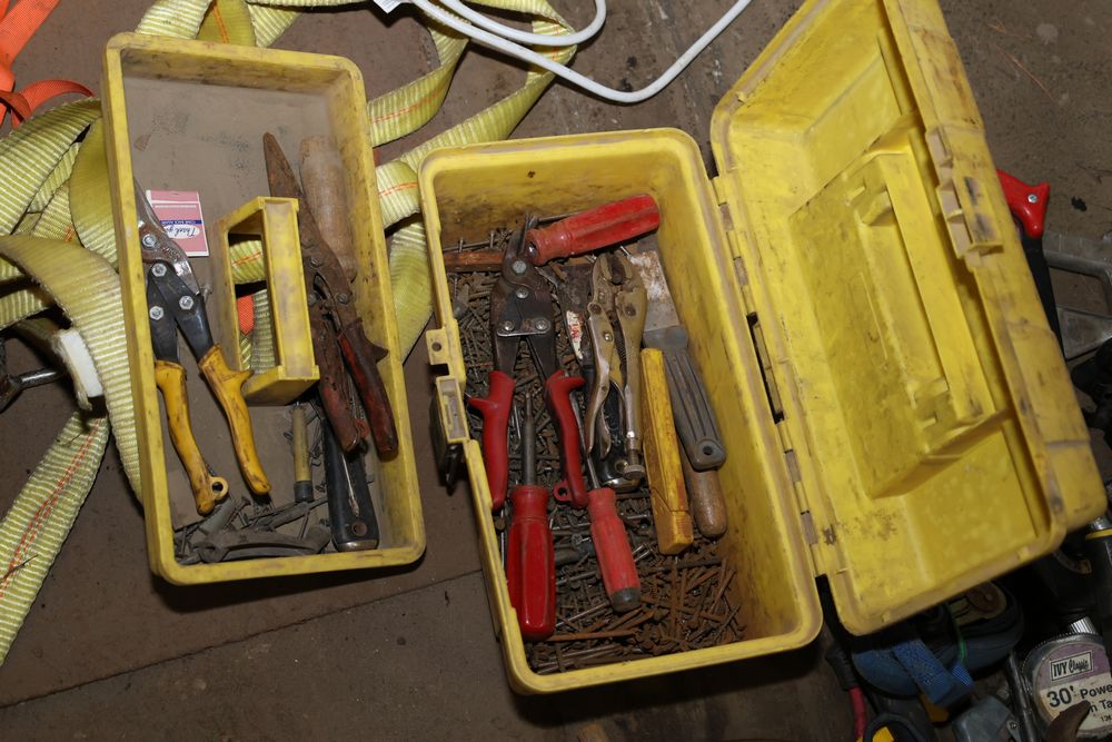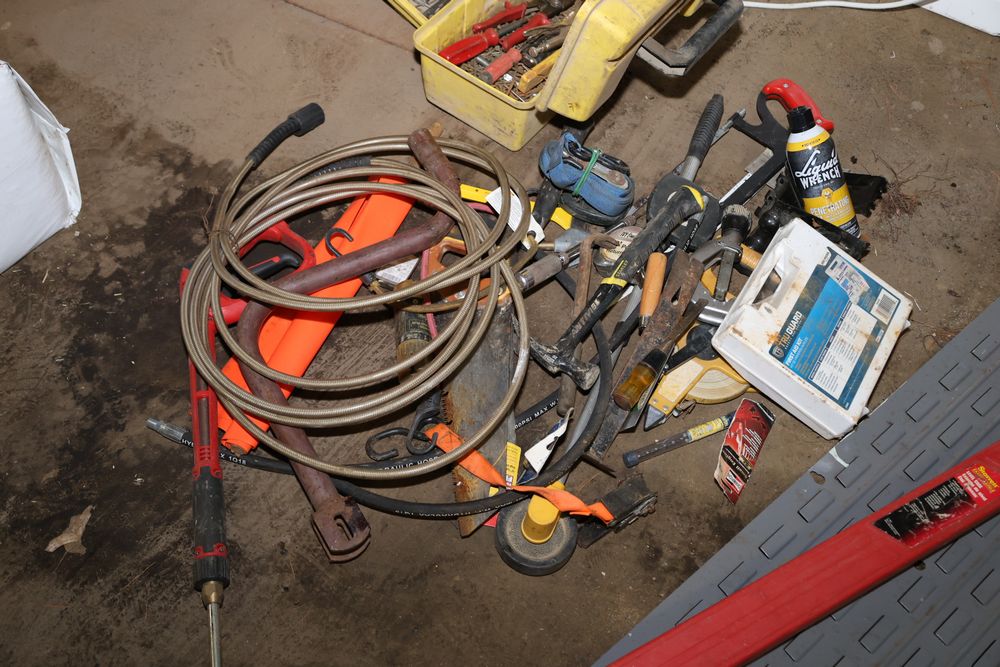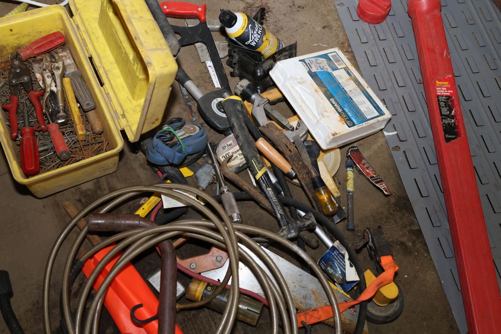 Tools including a piston jack, an air conditioner, straps, a pressure washer hose, a level, a tow hitch, a toolbox with wrenches, a set of gauges, PVC pipe fittings, a sander, and other hand tools. Buyer must take all. Pickup only.