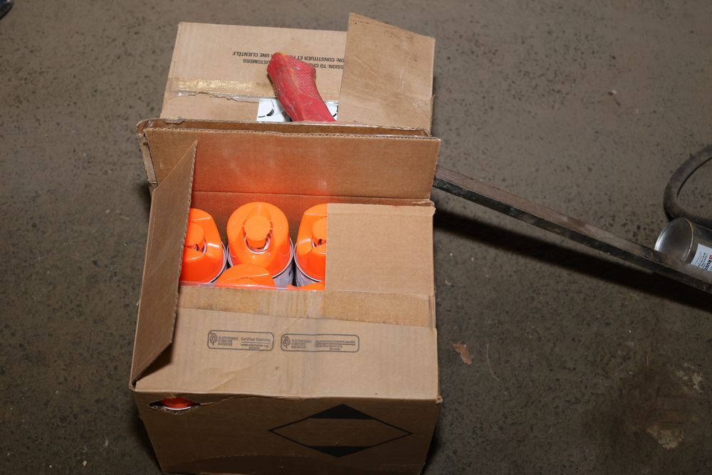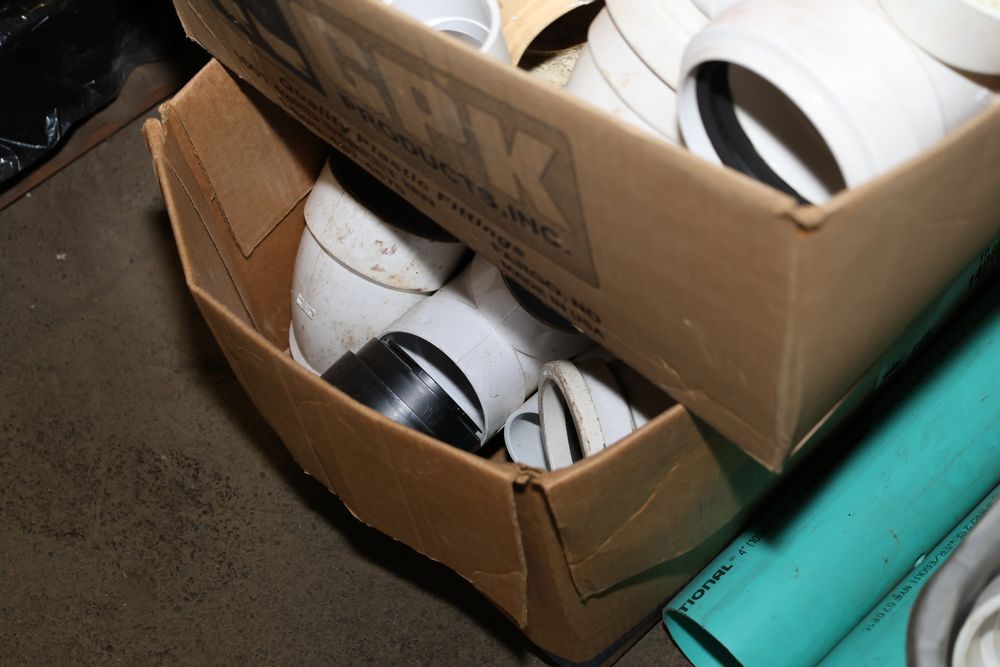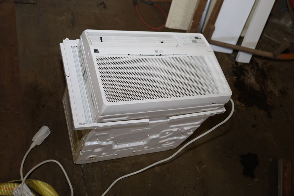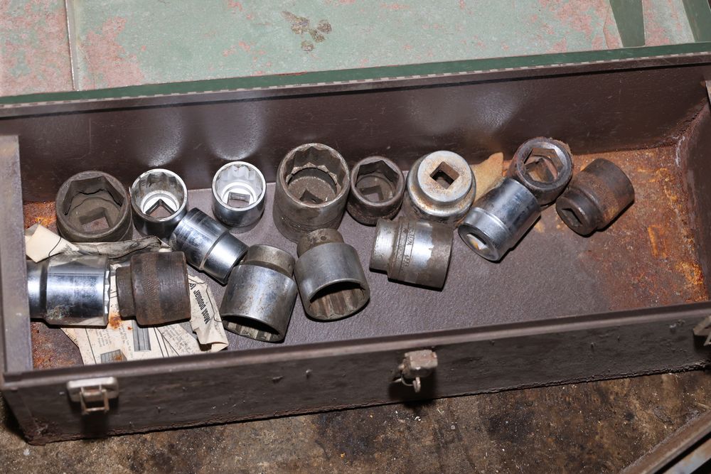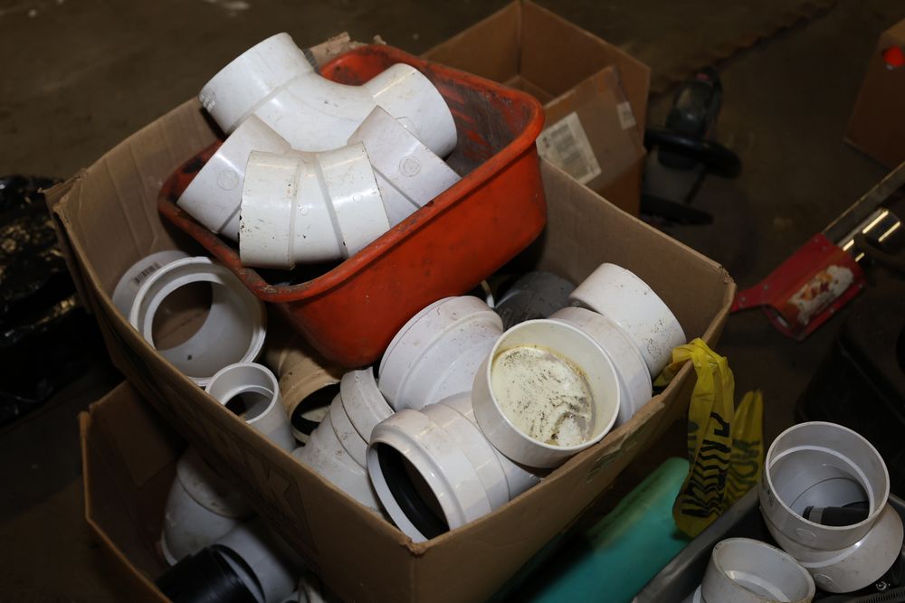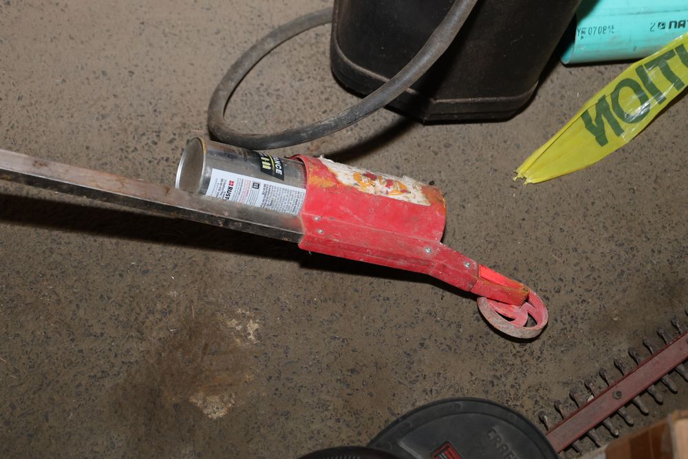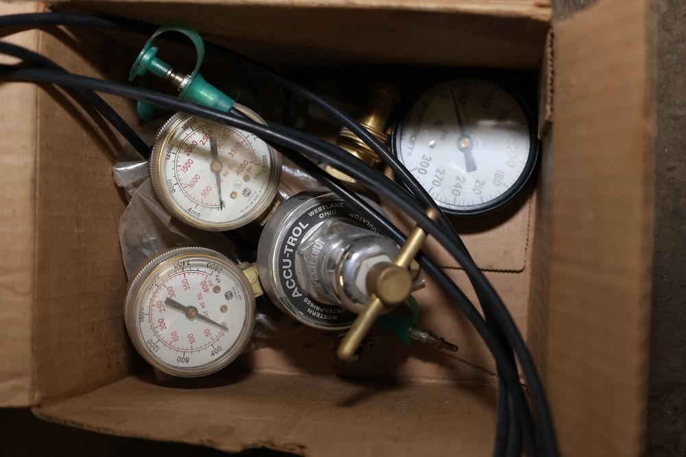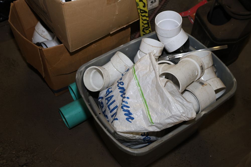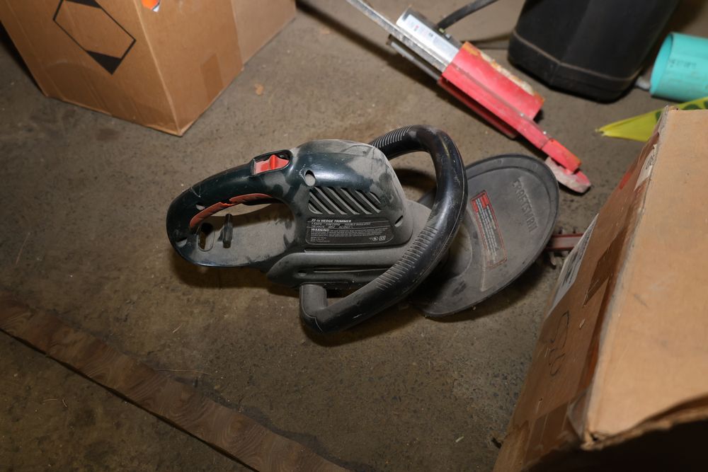 Tools including a piston jack, an air conditioner, straps, a pressure washer hose, a level, a tow hitch, a toolbox with wrenches, a set of gauges, PVC pipe fittings, a sander, and other hand tools. Buyer must take all. Pickup only.